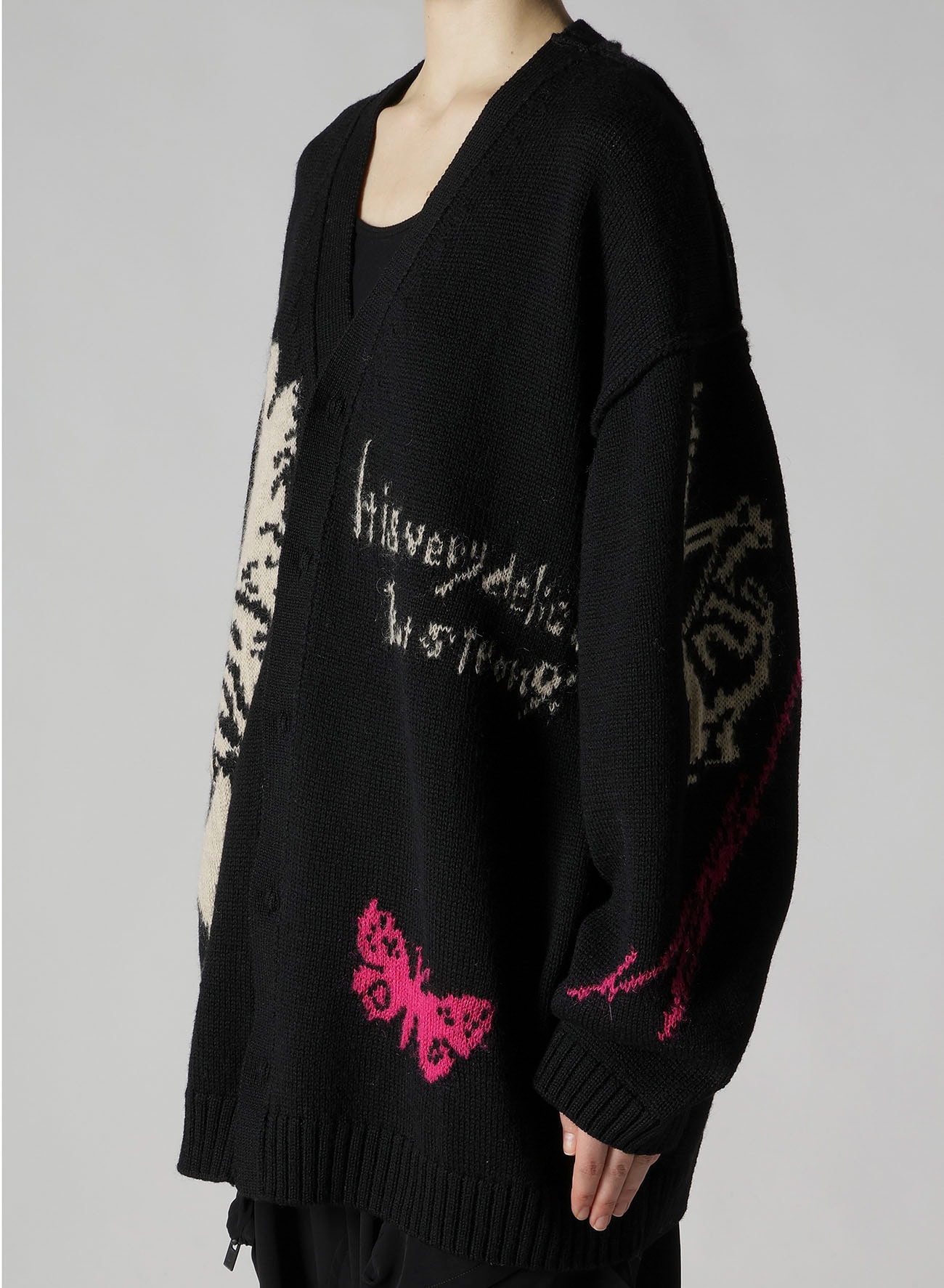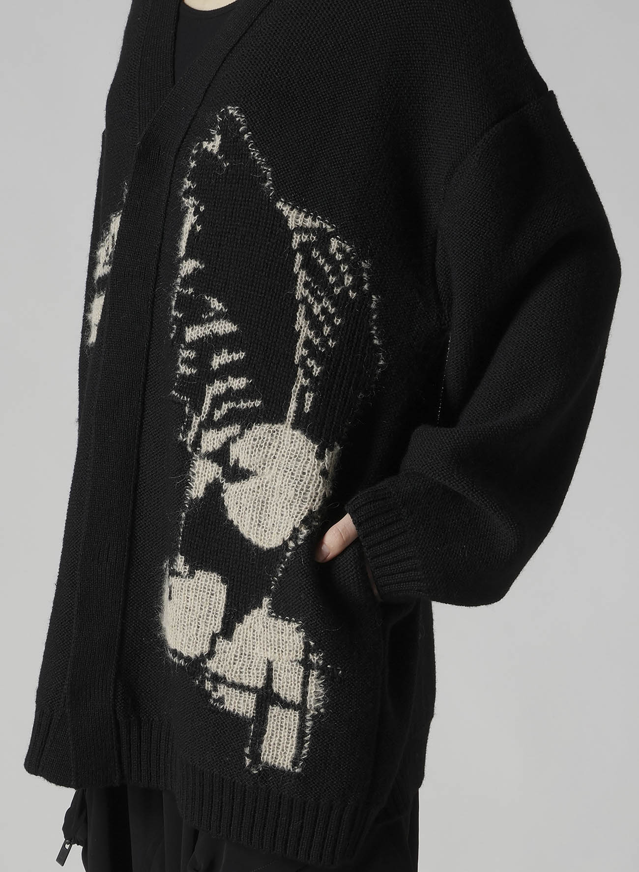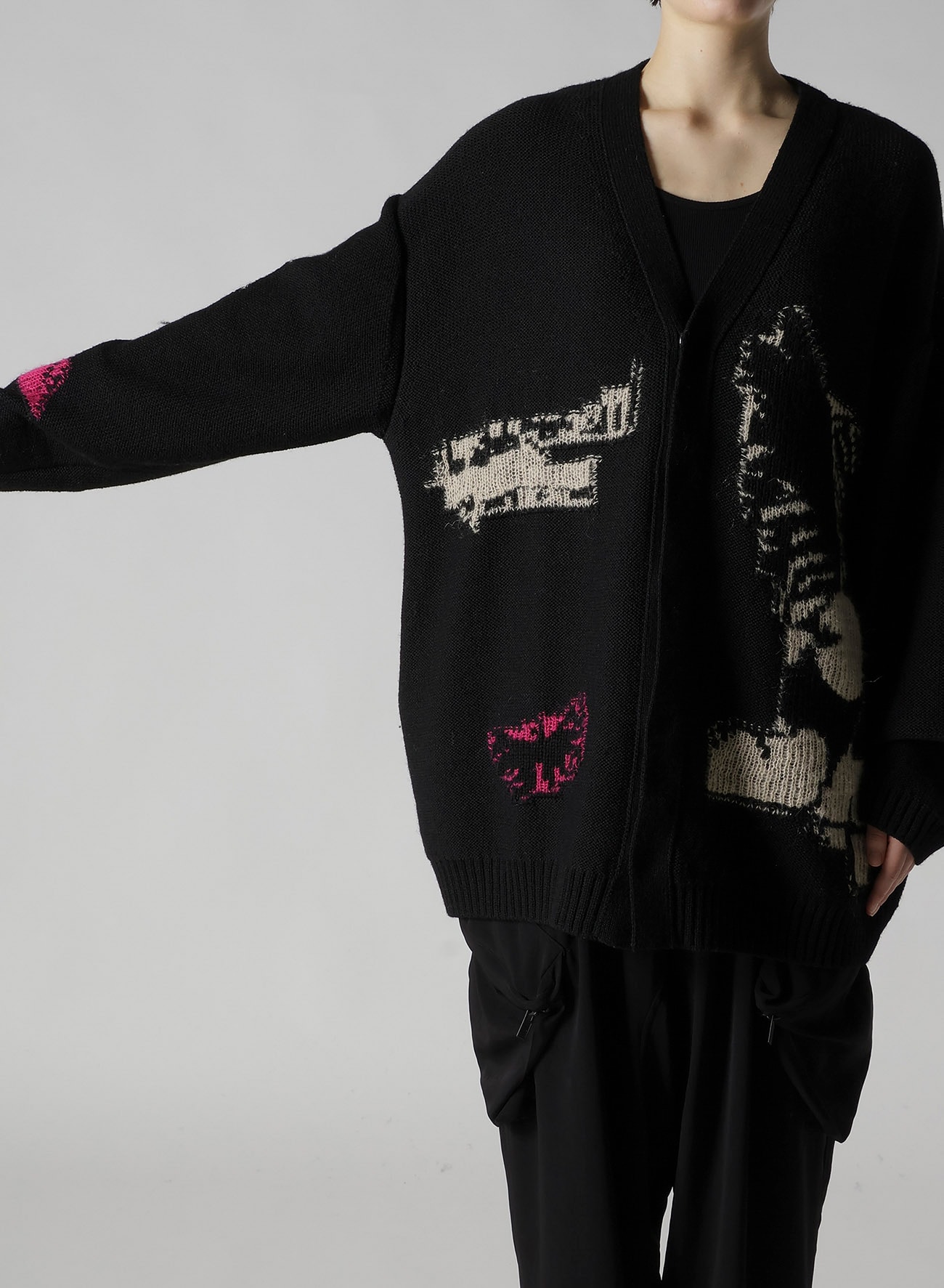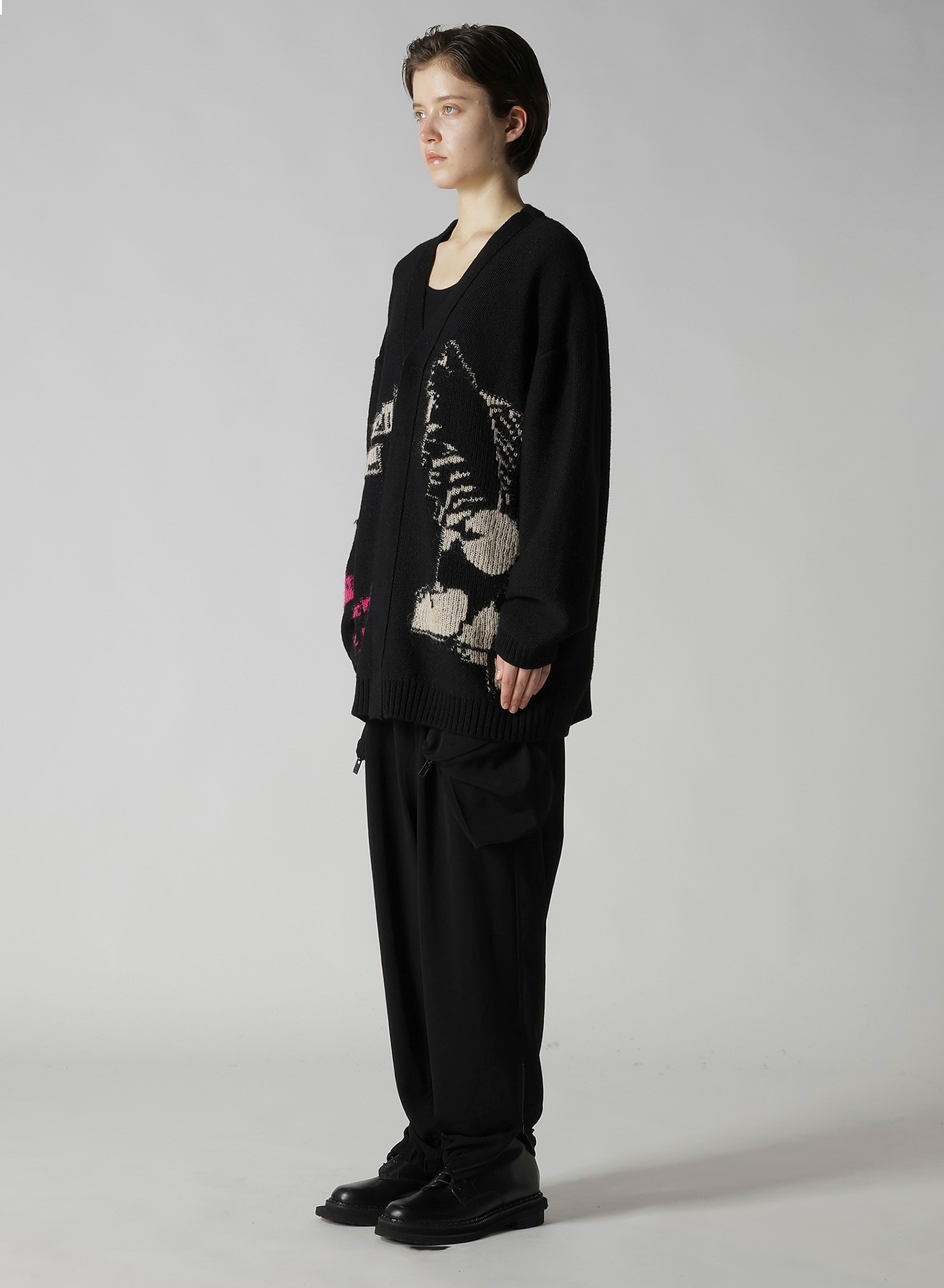 リバーシブルのVネックカーディガン。25AWシーズンに登場する鳥や羽のモチーフをジャカード編みで表現。リバーシブルでお召しいただくことができ、中表にするとコミカルなモチーフがくっきりと現れます。オーバーサイズのシルエットのため、男性にもおすすめです。