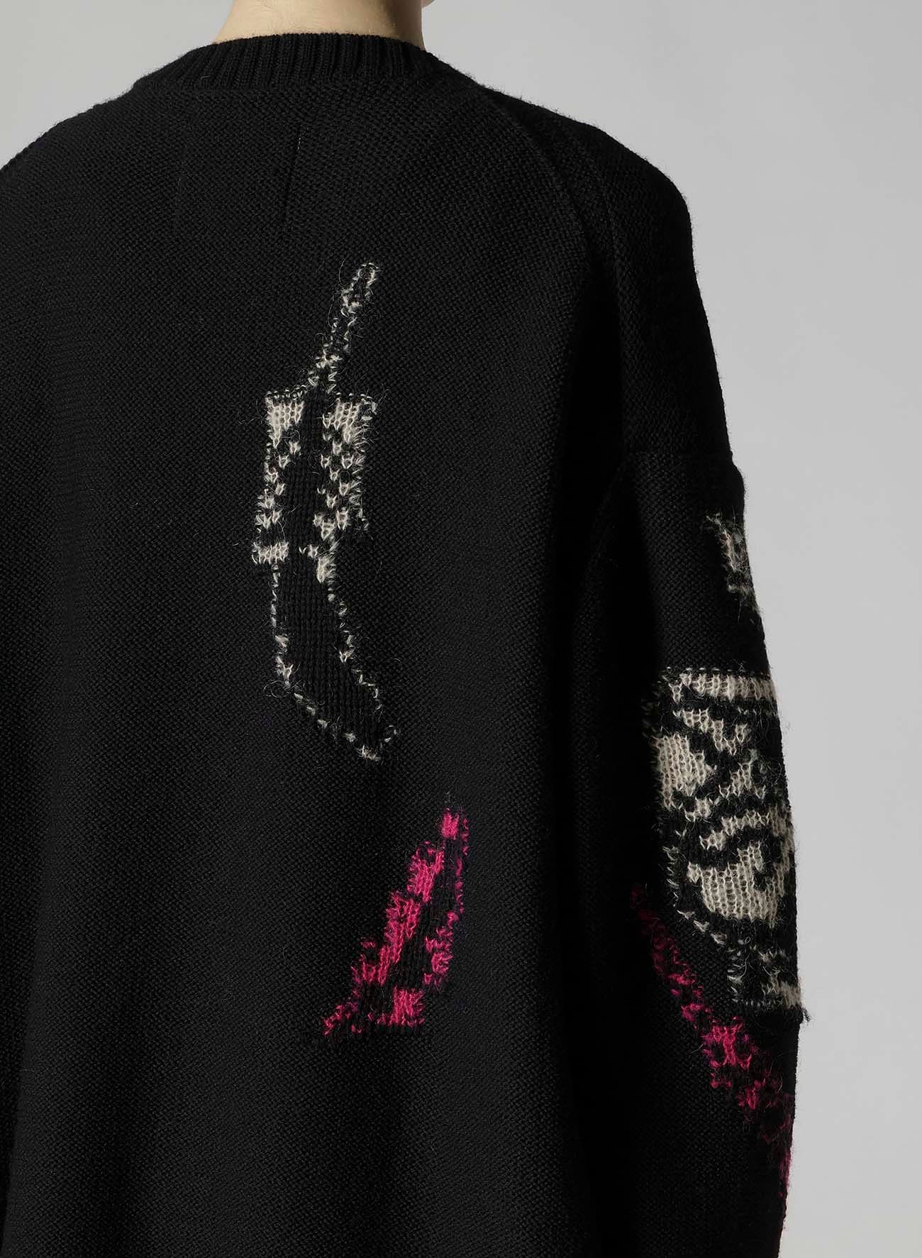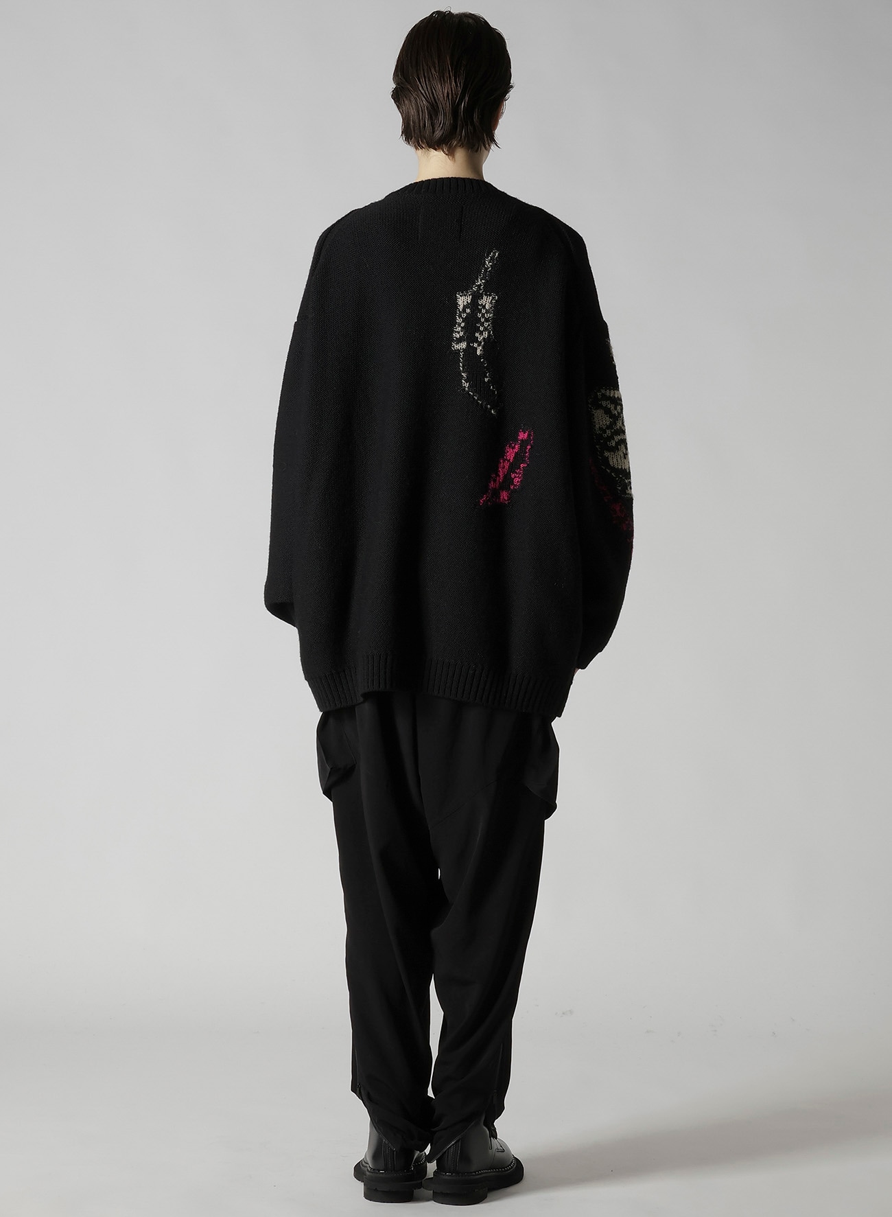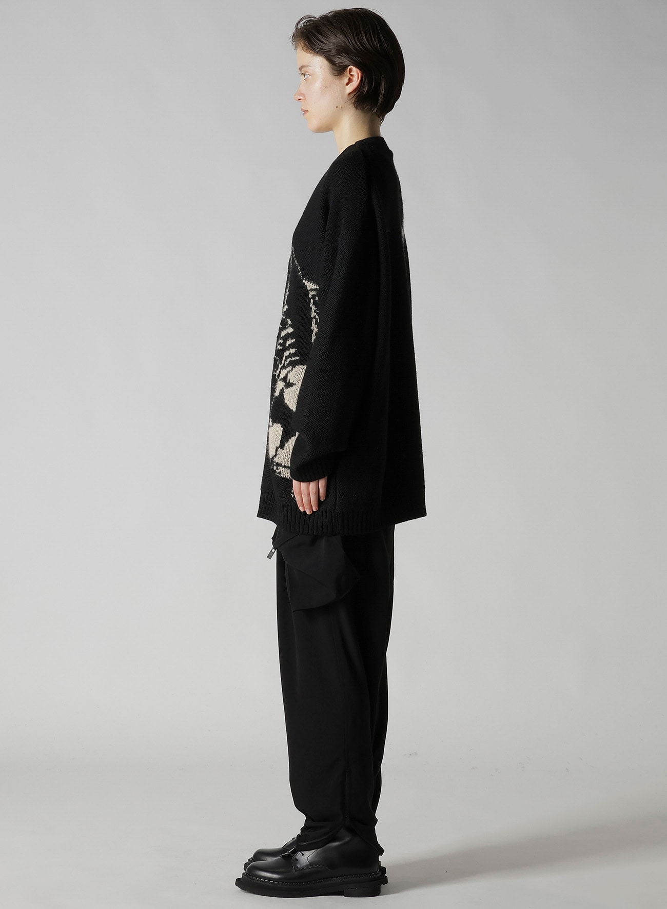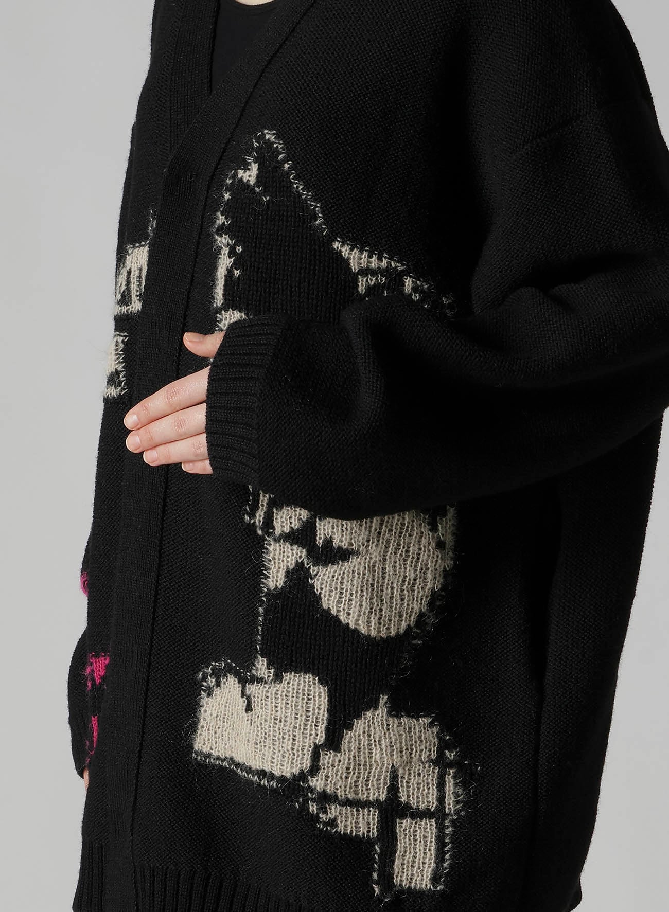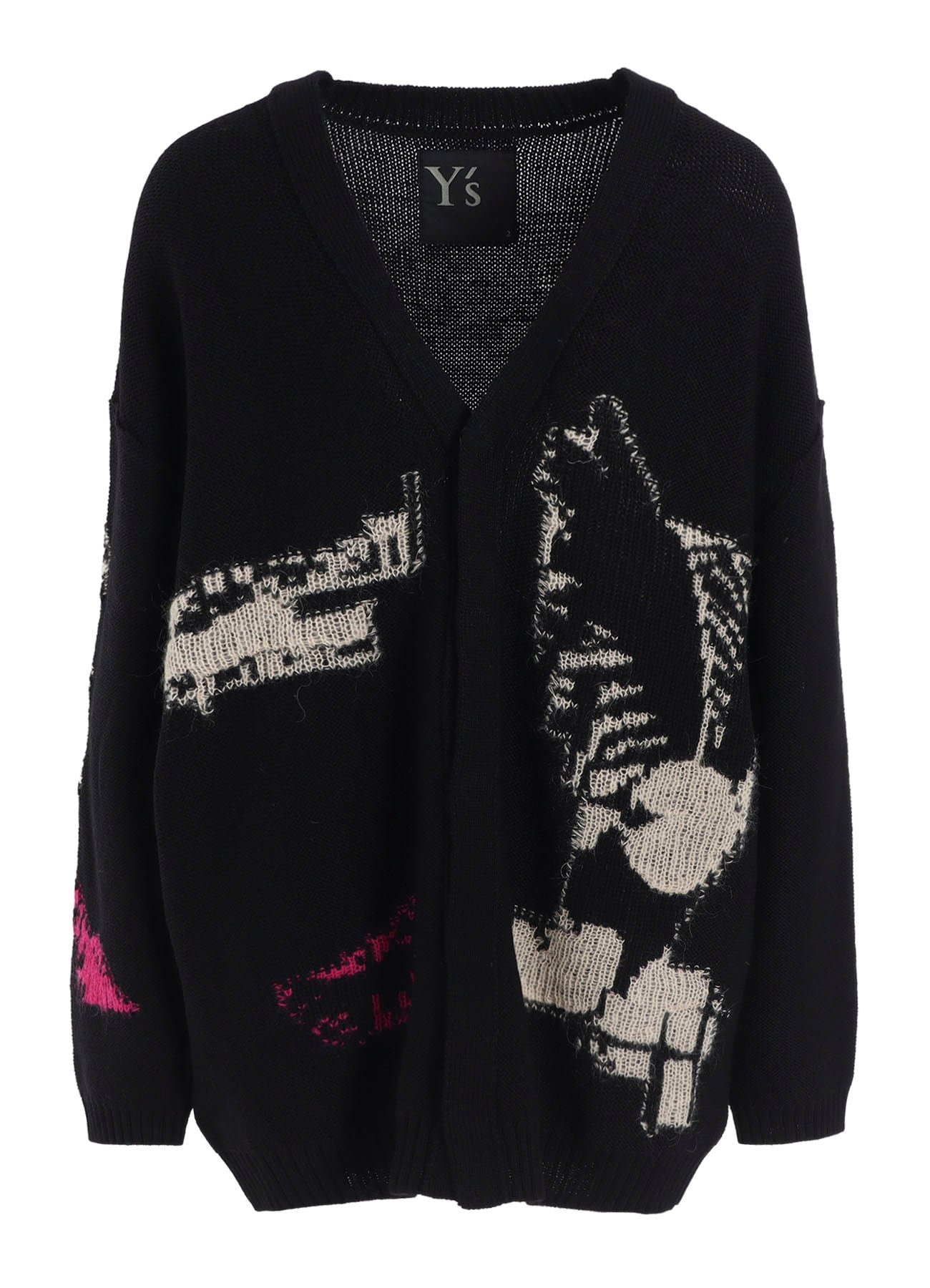 リバーシブルのVネックカーディガン。25AWシーズンに登場する鳥や羽のモチーフをジャカード編みで表現。リバーシブルでお召しいただくことができ、中表にするとコミカルなモチーフがくっきりと現れます。オーバーサイズのシルエットのため、男性にもおすすめです。
