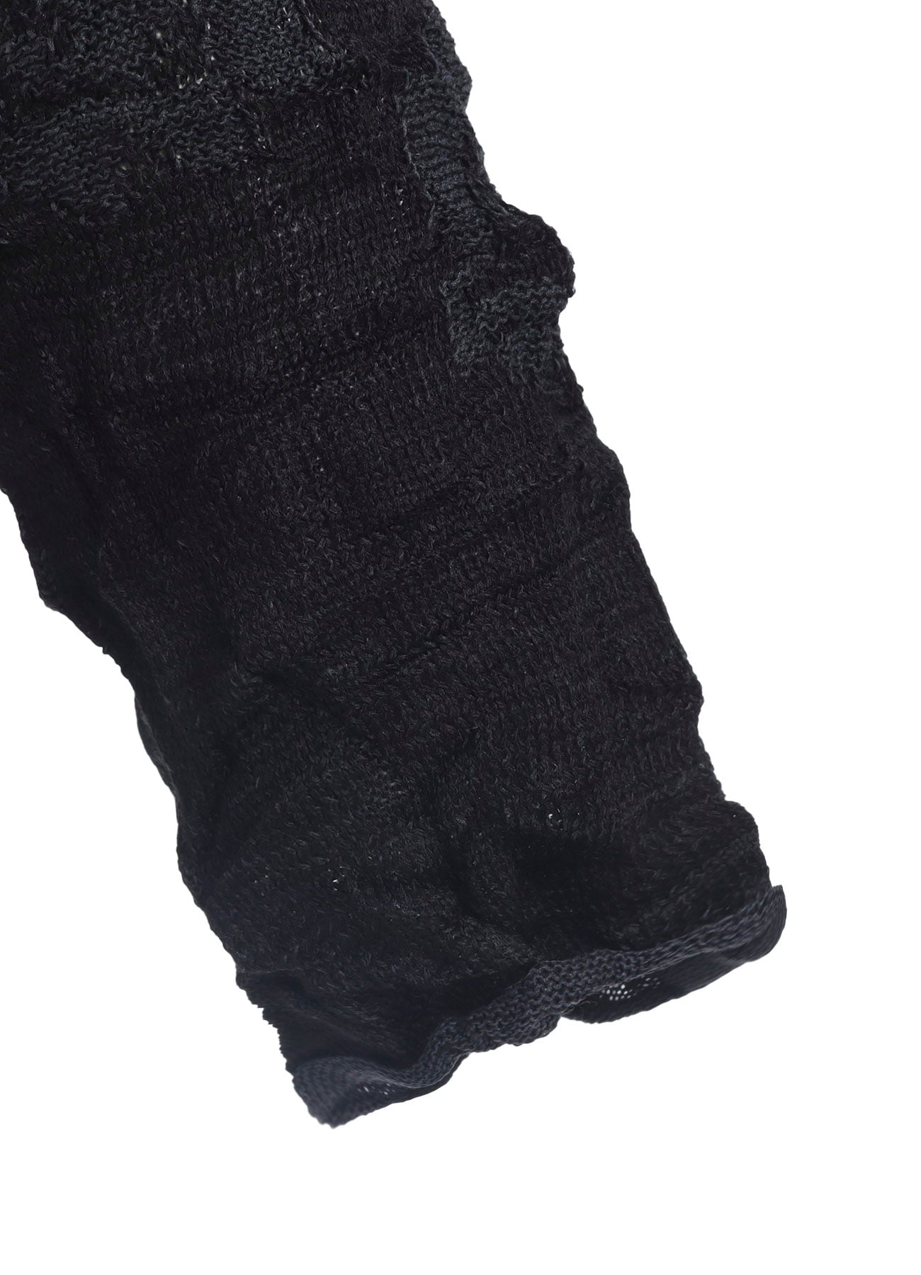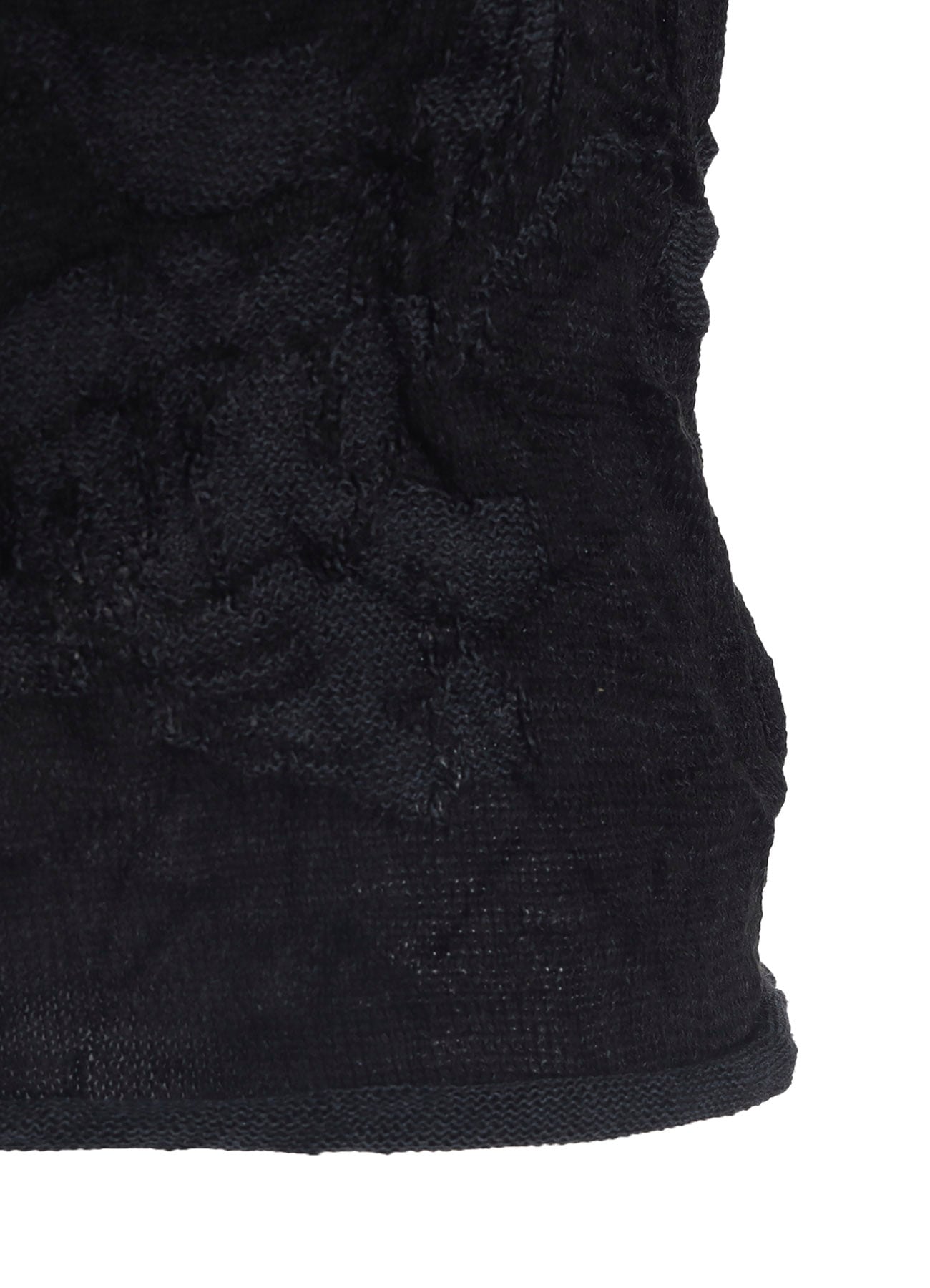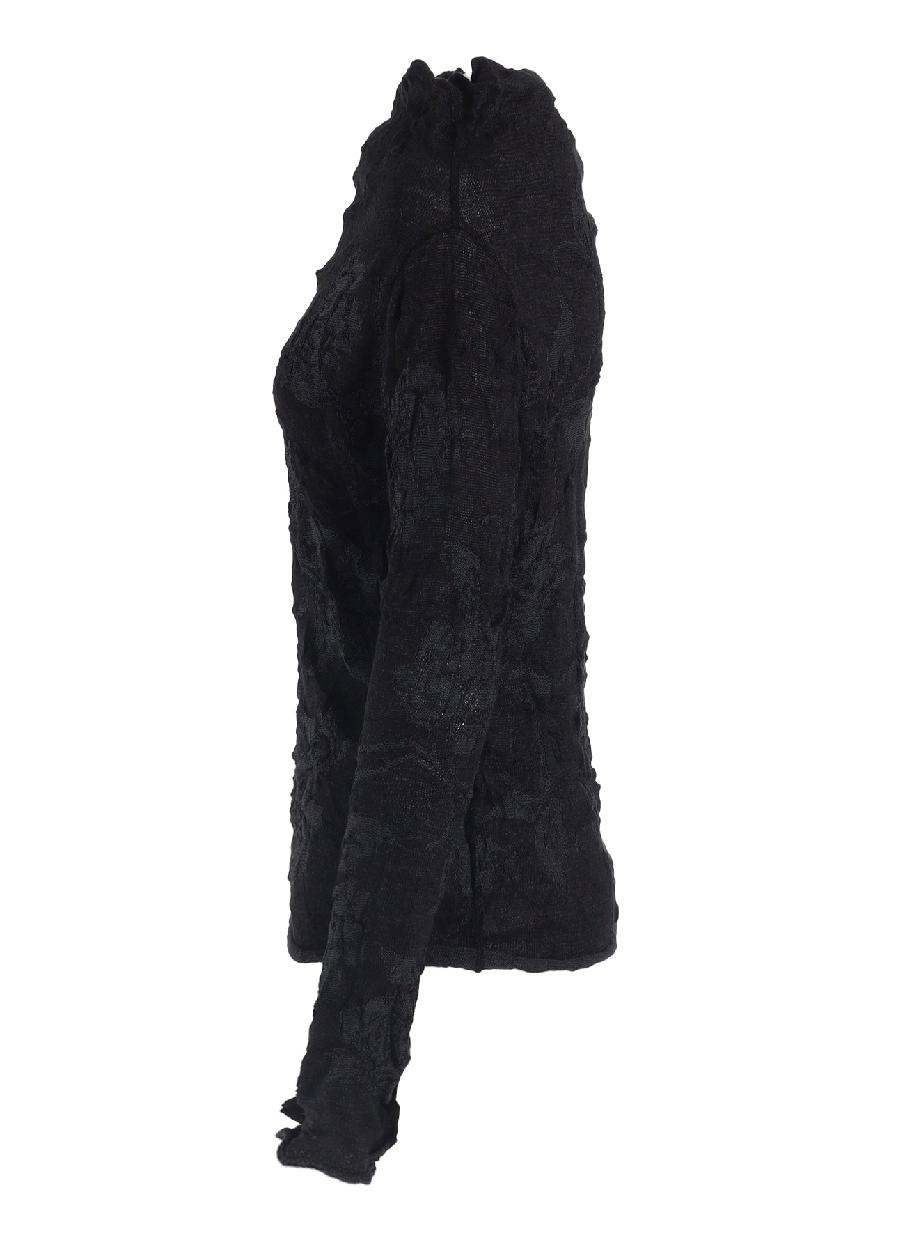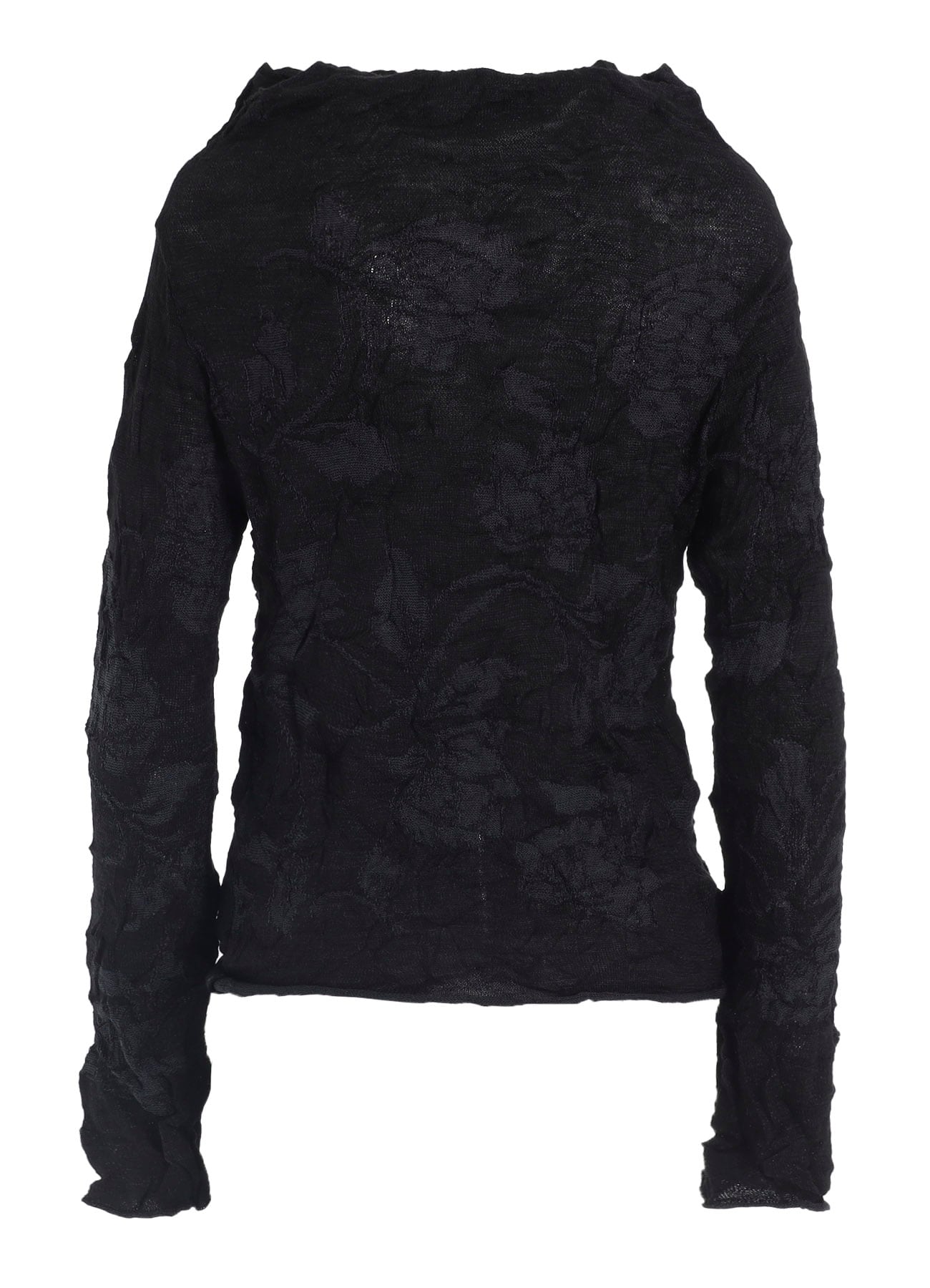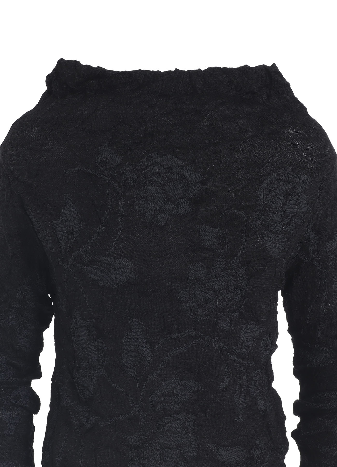 花柄のオフネック長袖プルオーバー。デコボコとしたリンクス編みでシワ加工を施しています。タイトなシルエットでありながら首まわりはややゆったりとしており自然な落ち感が上品な印象。適度なストレッチ性もあり、インナーとしても使い勝手が良く。幅広いスタイリングと相性よくお召しいただけます。
