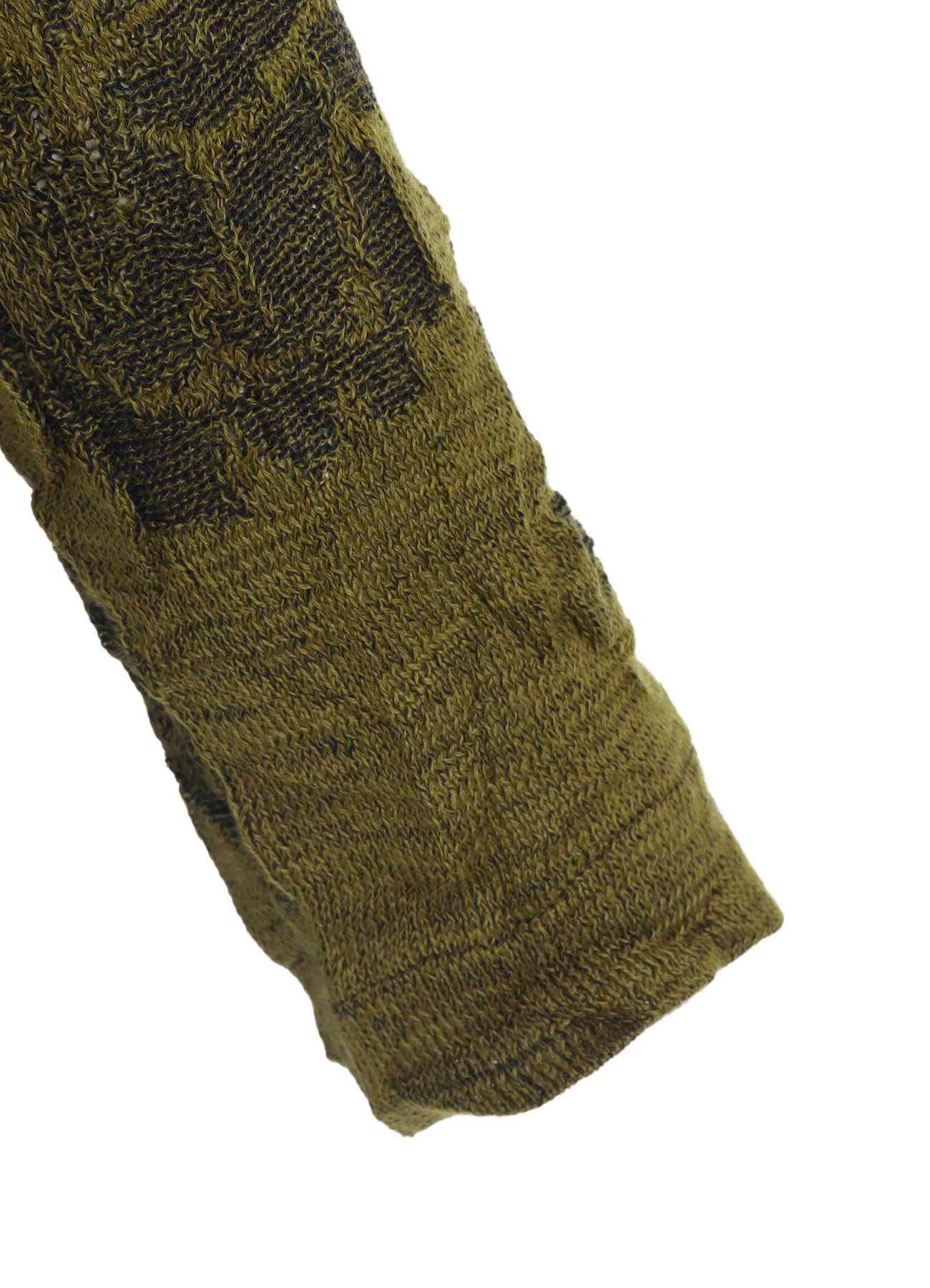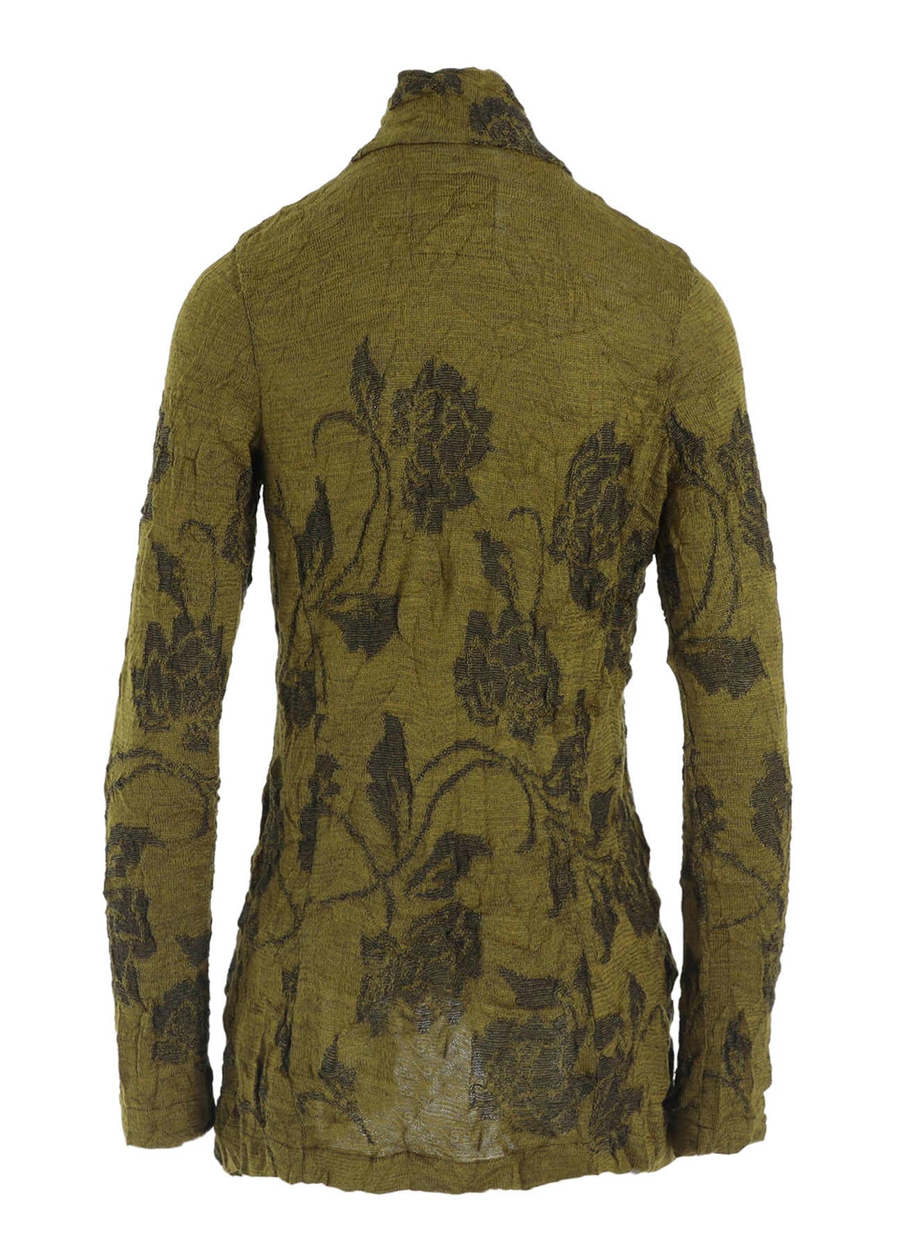 花柄のジャケット。デコボコとしたリンクス編みでシワ加工を施しています。斜めに入ったボタンが特徴的でボタンの開け方によってスタイリングを変化させお楽しみいただけます。すっきりとしたシルエットでどんなボトムスともバランス良く合わせられるアイテムです。適度なストレッチ性がございます。
