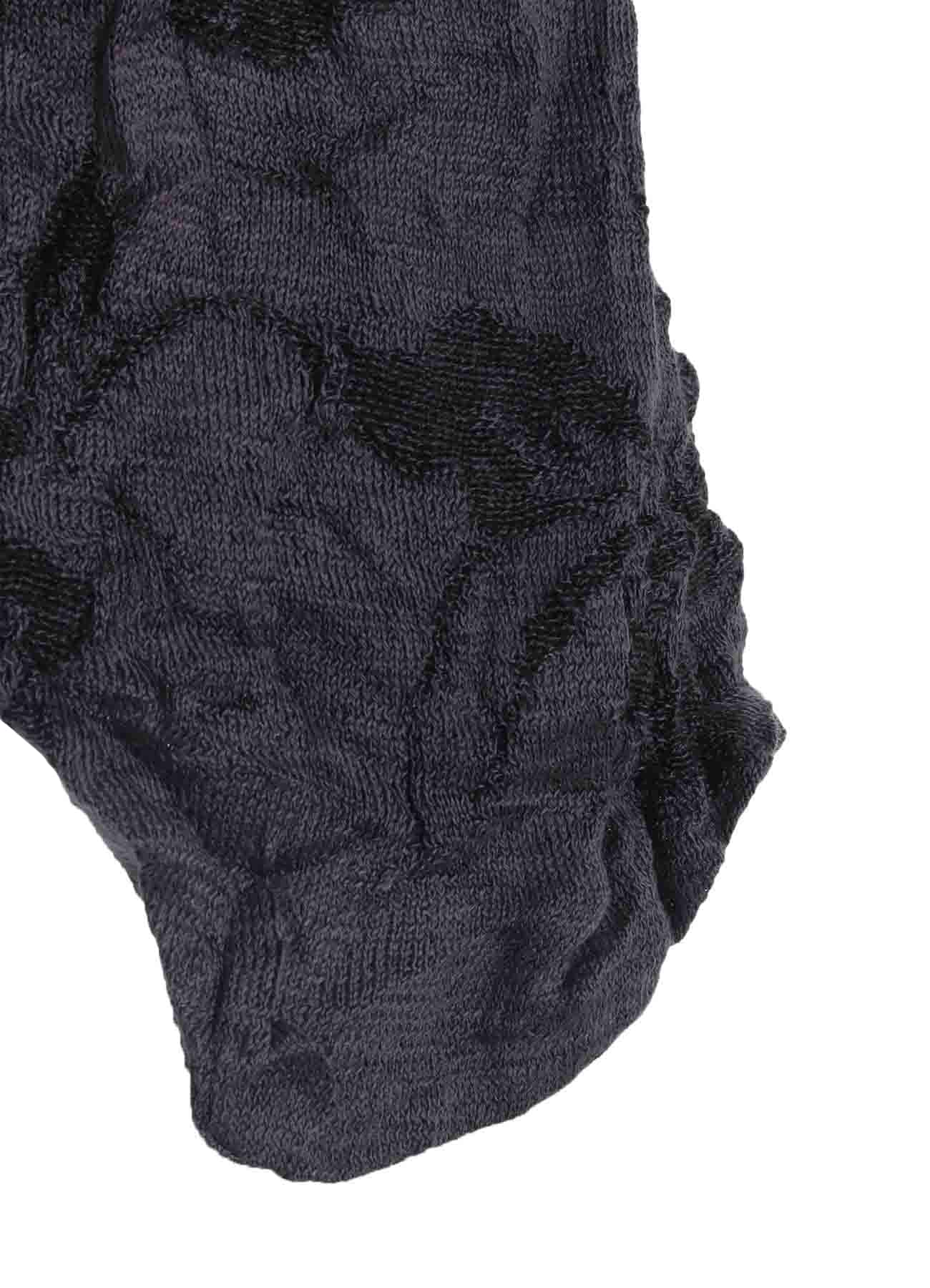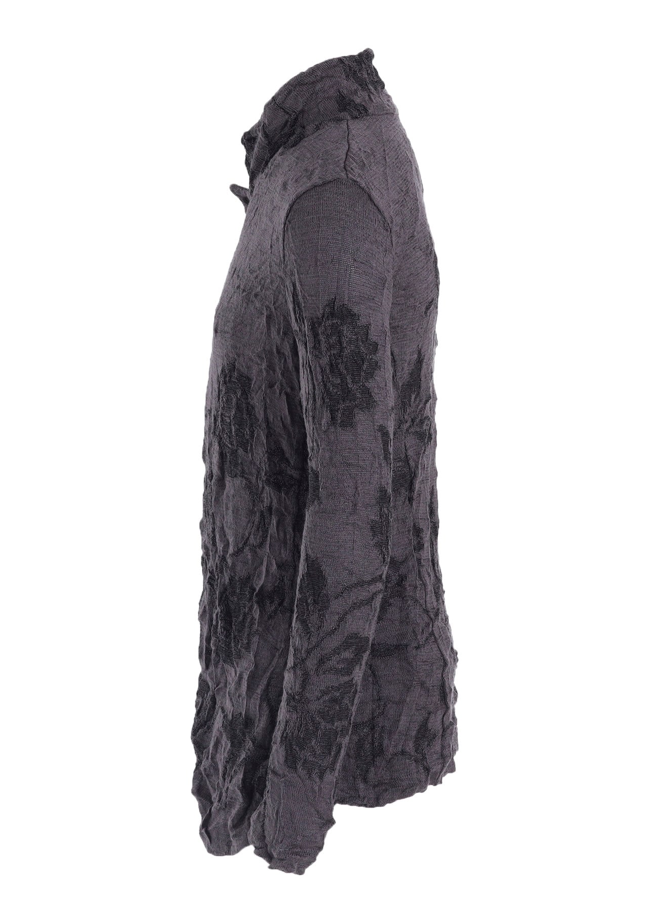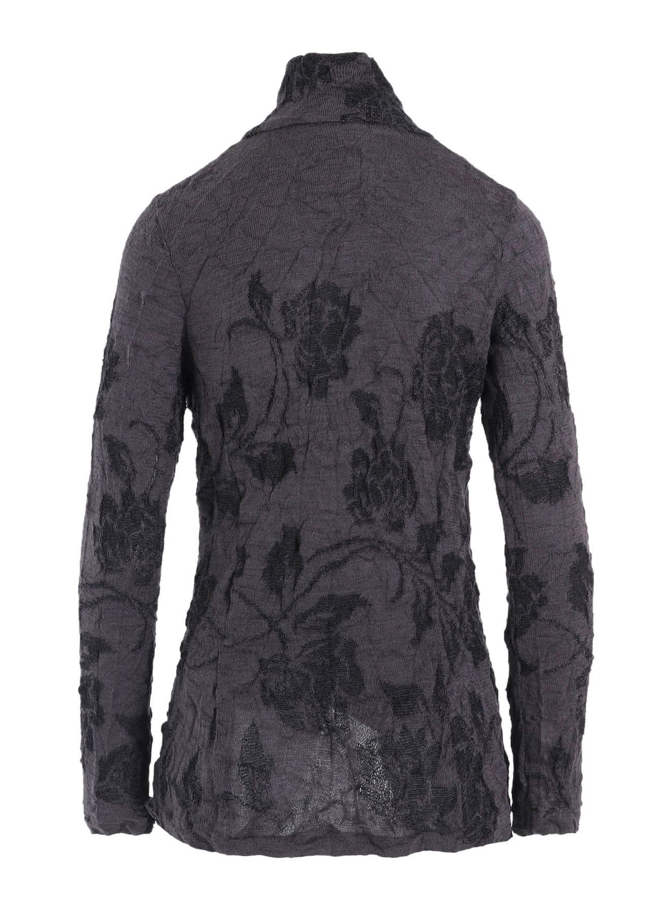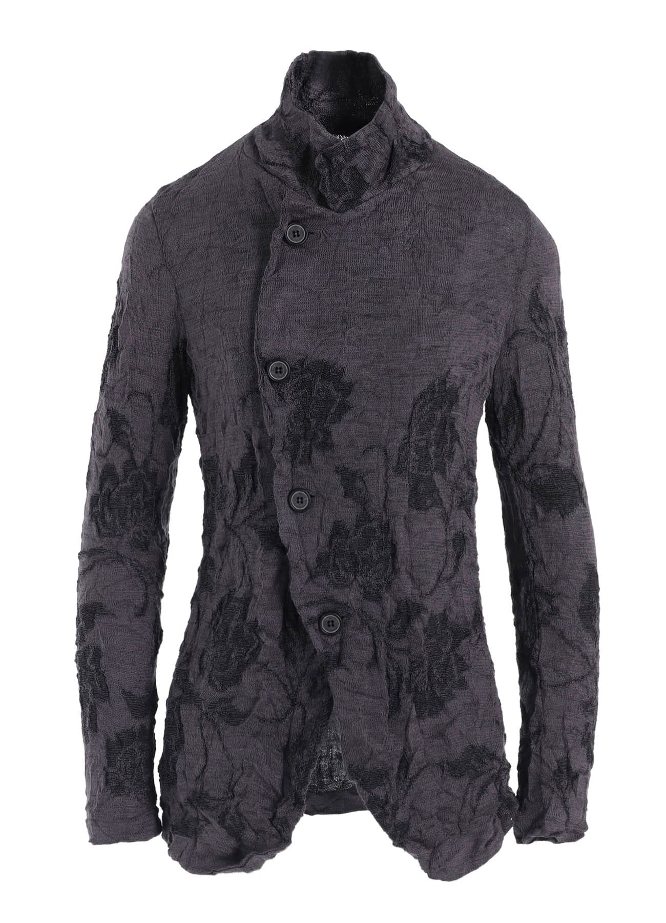 花柄のジャケット。デコボコとしたリンクス編みでシワ加工を施しています。斜めに入ったボタンが特徴的でボタンの開け方によってスタイリングを変化させお楽しみいただけます。すっきりとしたシルエットでどんなボトムスともバランス良く合わせられるアイテムです。適度なストレッチ性がございます。
