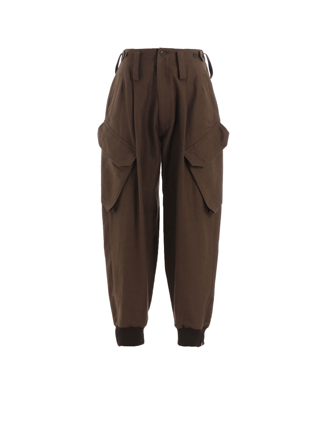 ミリタリーウェアに由来したデザインの裾リブパンツ。リネンの毛羽感による空気を含んだふっくらとして風合いがポイント。緩やかなテーパードシルエットについた立体的なポケットがアクセントに。ウエストにはサイズ調整のタブが付き、ベルトを使わず腰で履くことが可能。裾のファスナーを少し開けると、足首で布がたまることなくシルエットが美しく出ます。