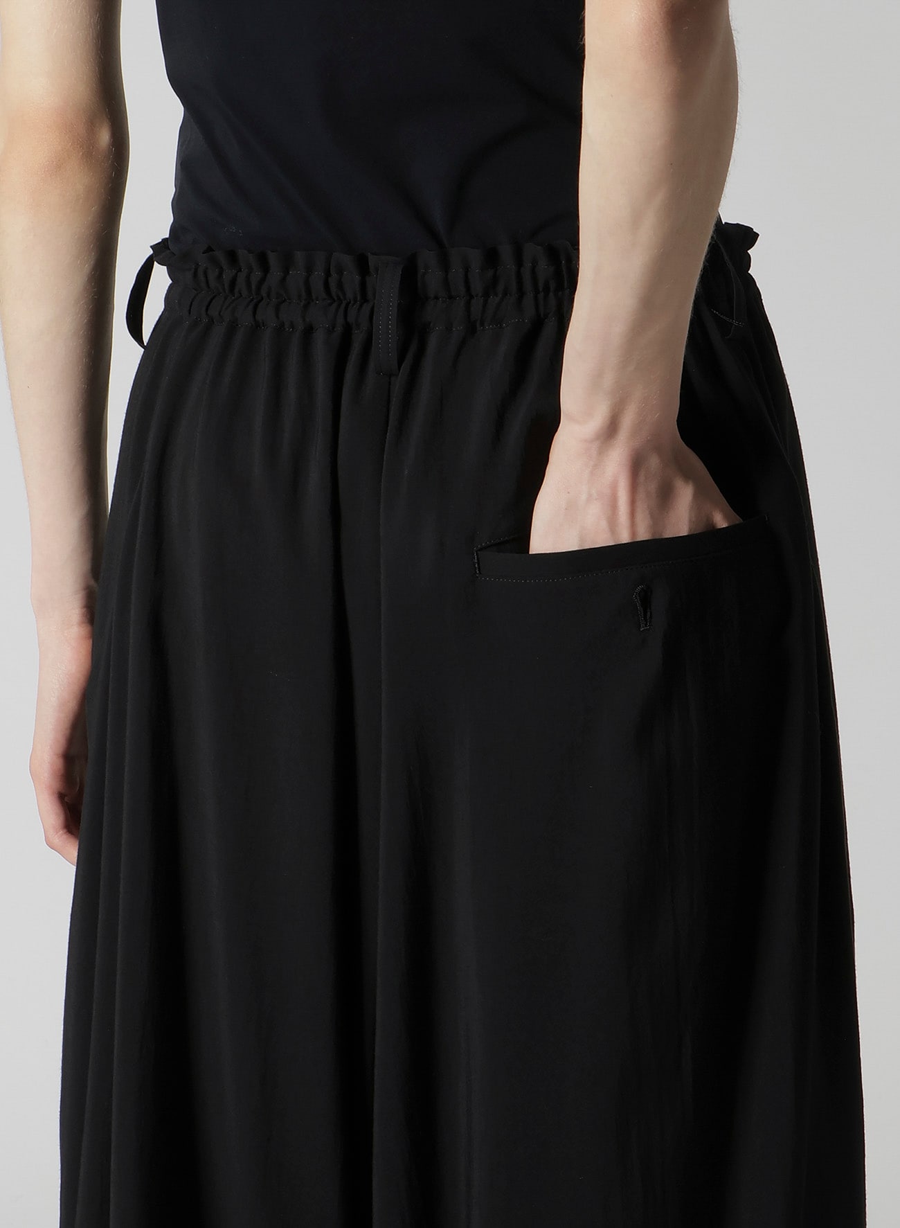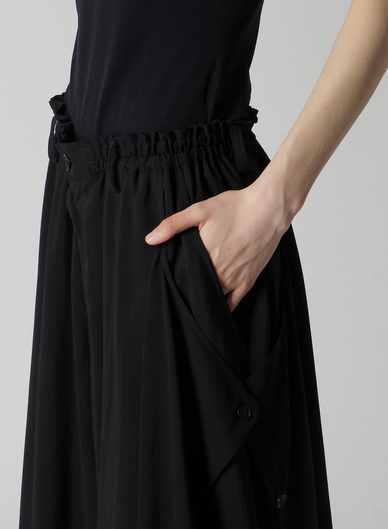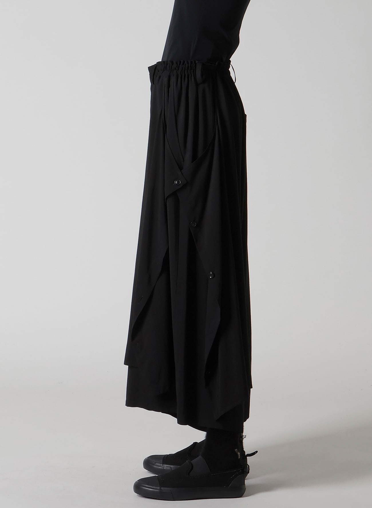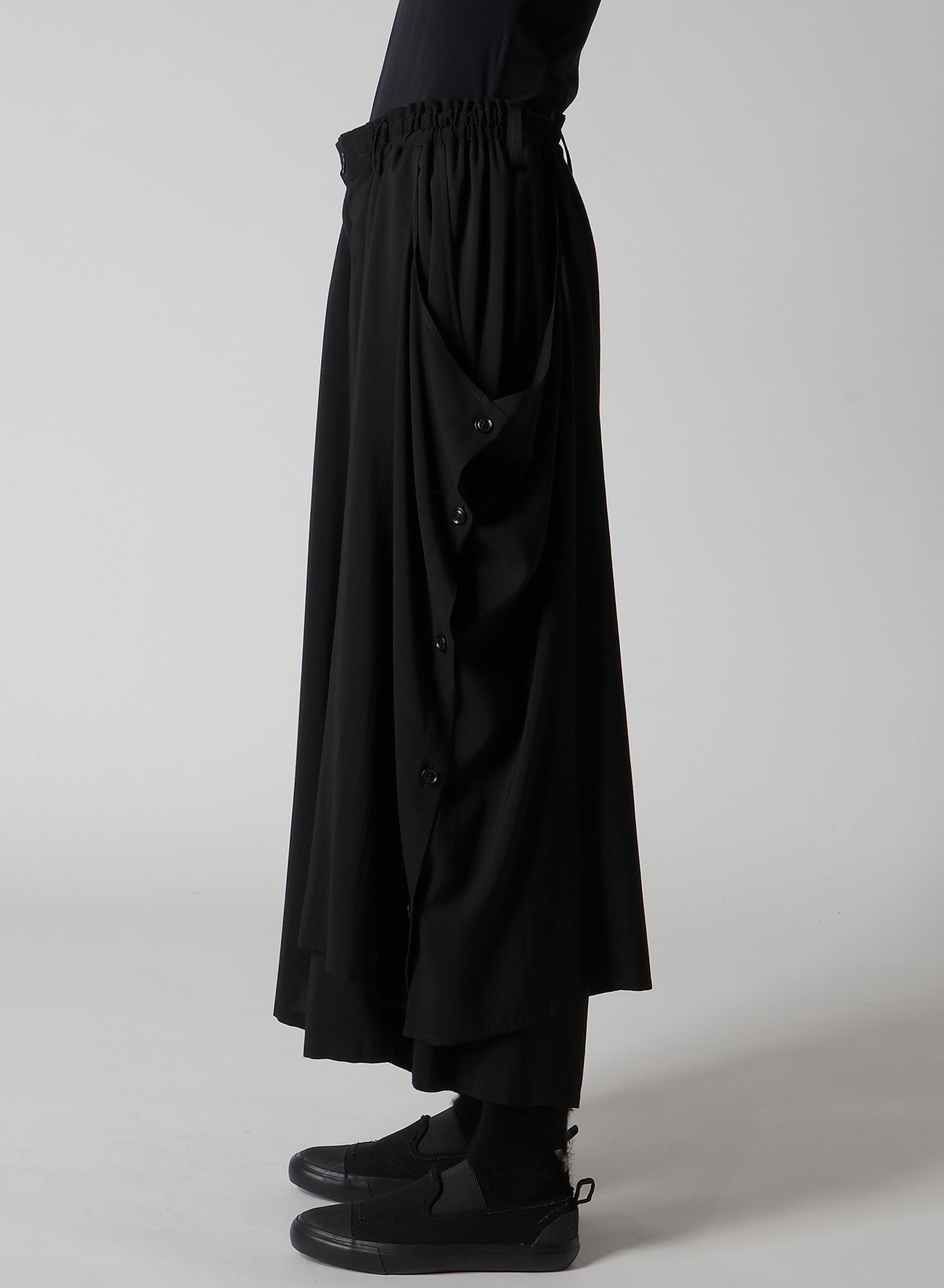 左側が二重になったギャザーパンツ。しなやかでドレープ感の強いキュプラとレーヨンの生地に、サーキュラー染色機を用いて濃度のある黒を表現し、天日で自然な風合いに仕上げています。左側のボタンを外してアレンジ可能です。ワイズらしい分量感のあるシルエットが特徴です。