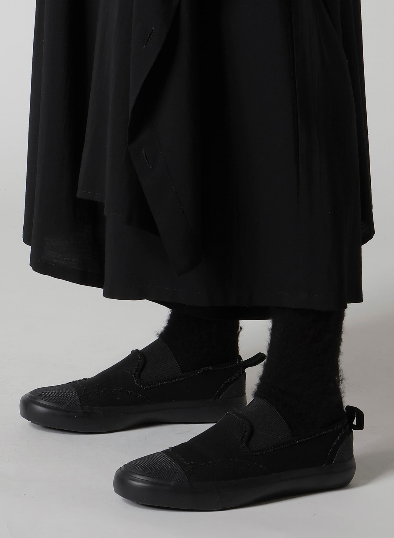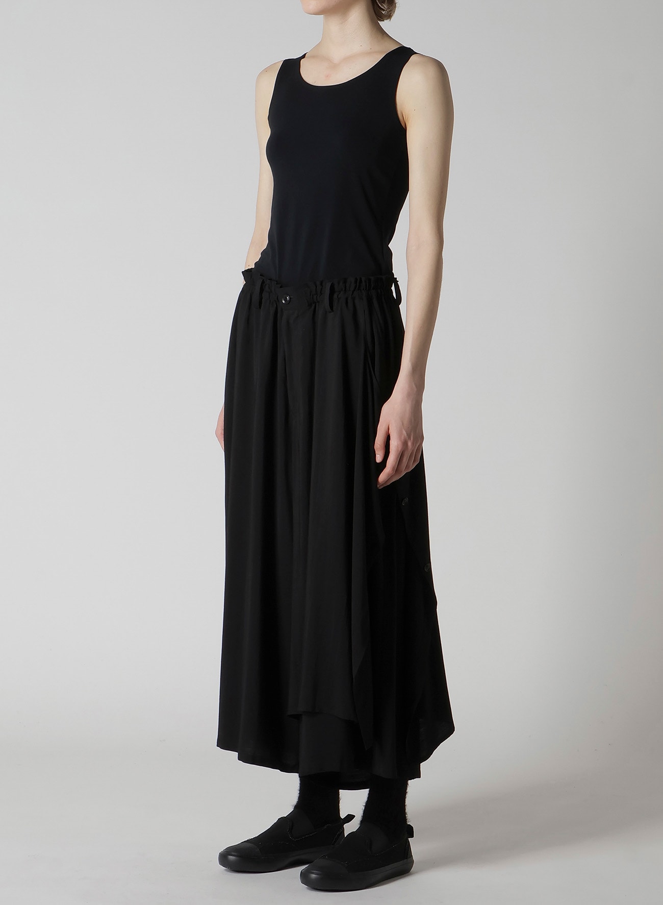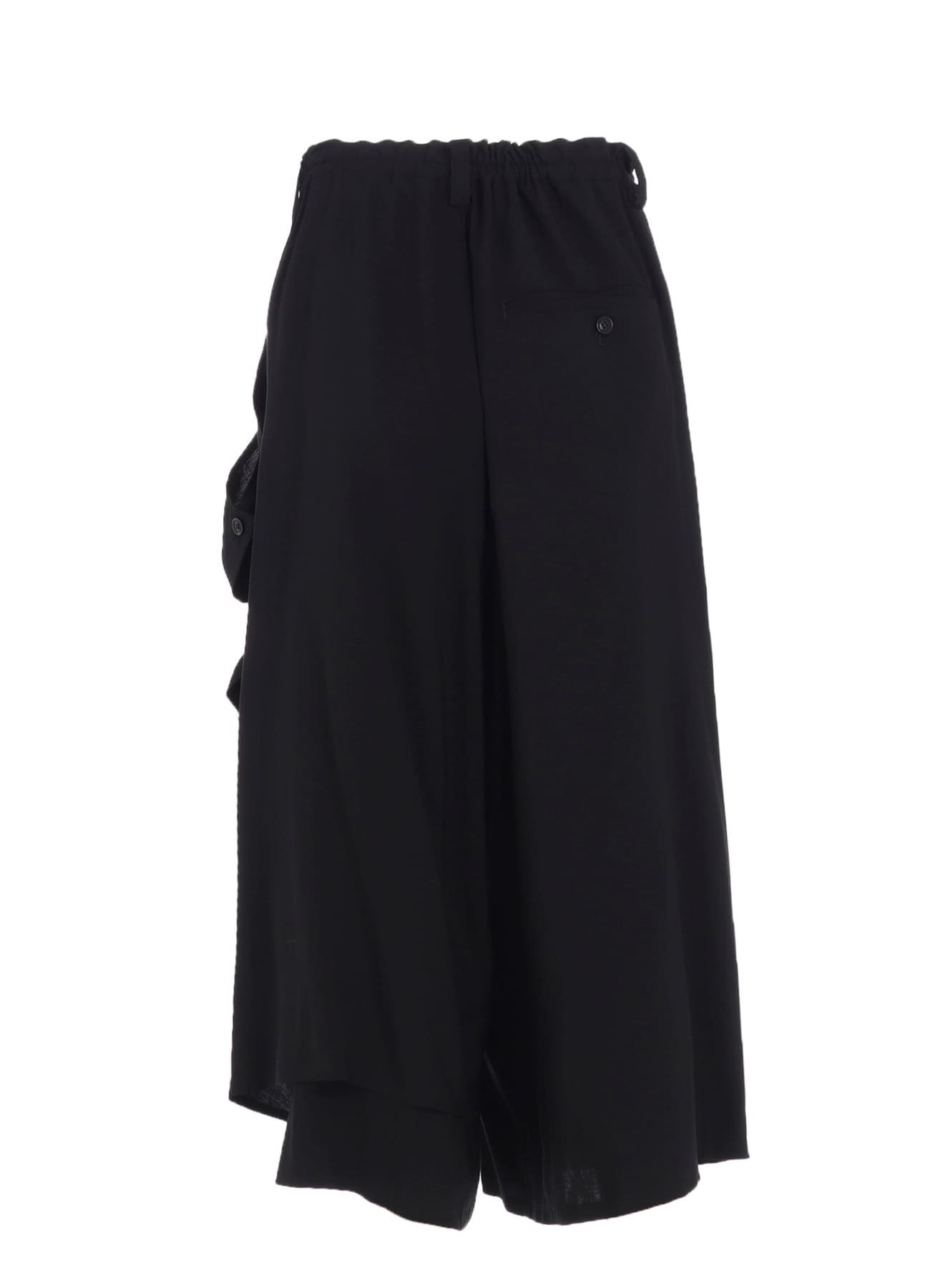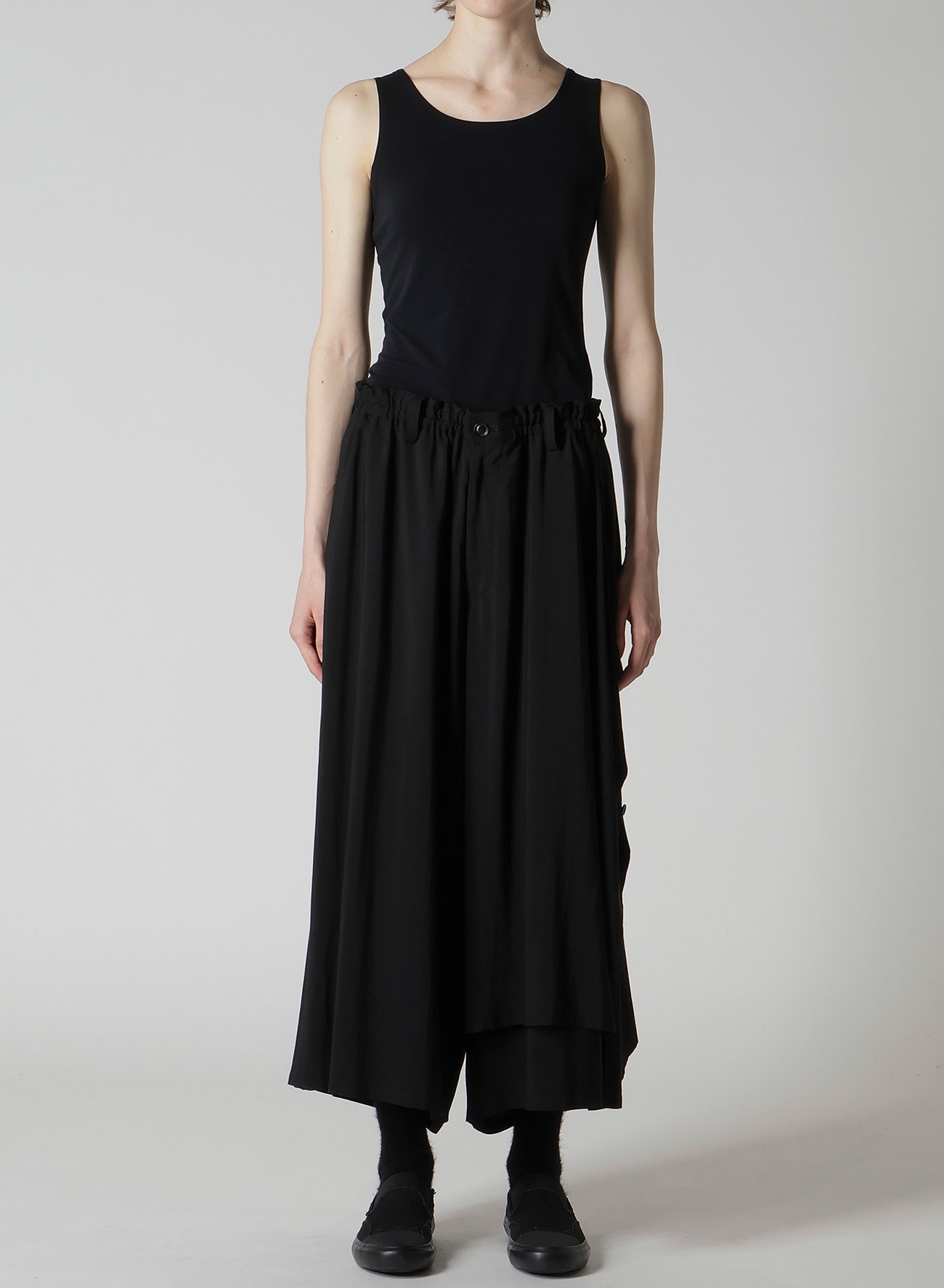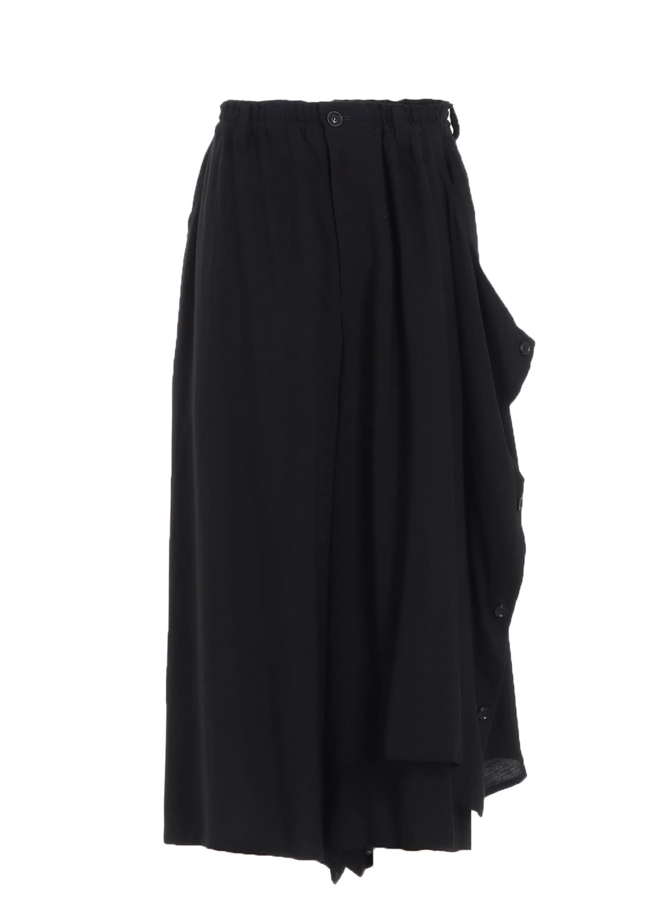左側が二重になったギャザーパンツ。しなやかでドレープ感の強いキュプラとレーヨンの生地に、サーキュラー染色機を用いて濃度のある黒を表現し、天日で自然な風合いに仕上げています。左側のボタンを外してアレンジ可能です。ワイズらしい分量感のあるシルエットが特徴です。