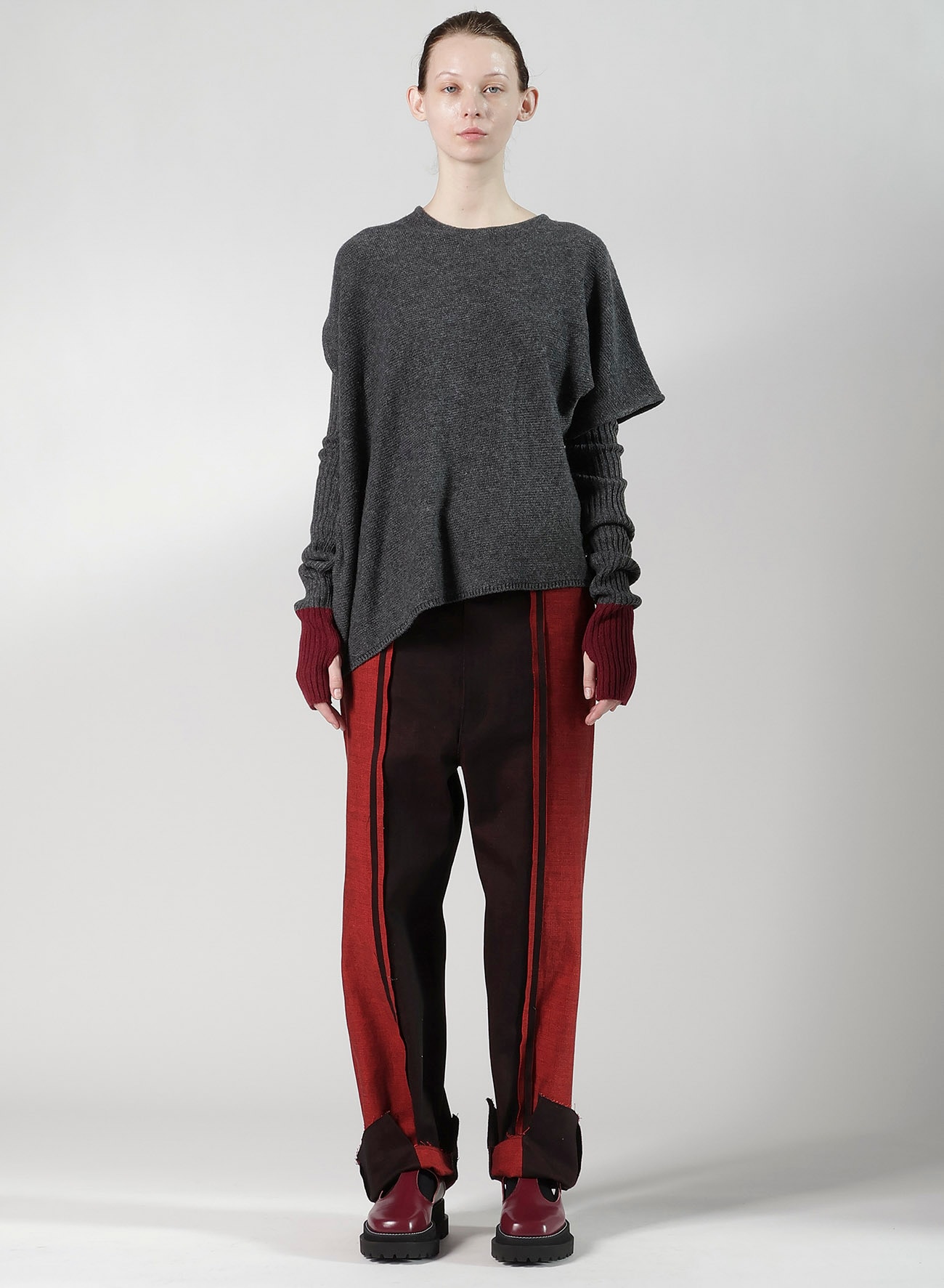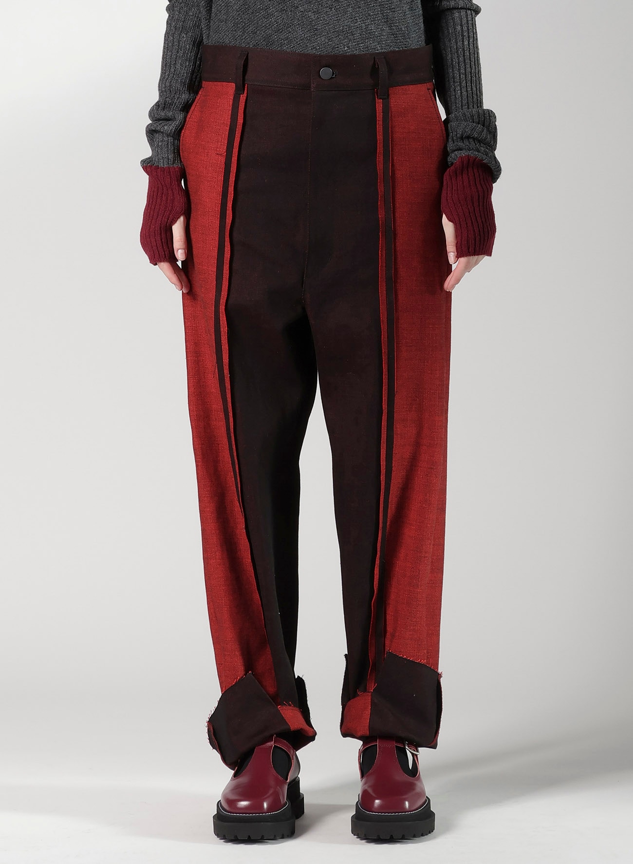 ヨコ糸に赤い糸を使用したユニークなデニム生地でつくられた切り替えパンツ。長めにデザインされた裾はロールアップすることでバランス良く、裏側のカラーが見えアクセントに。