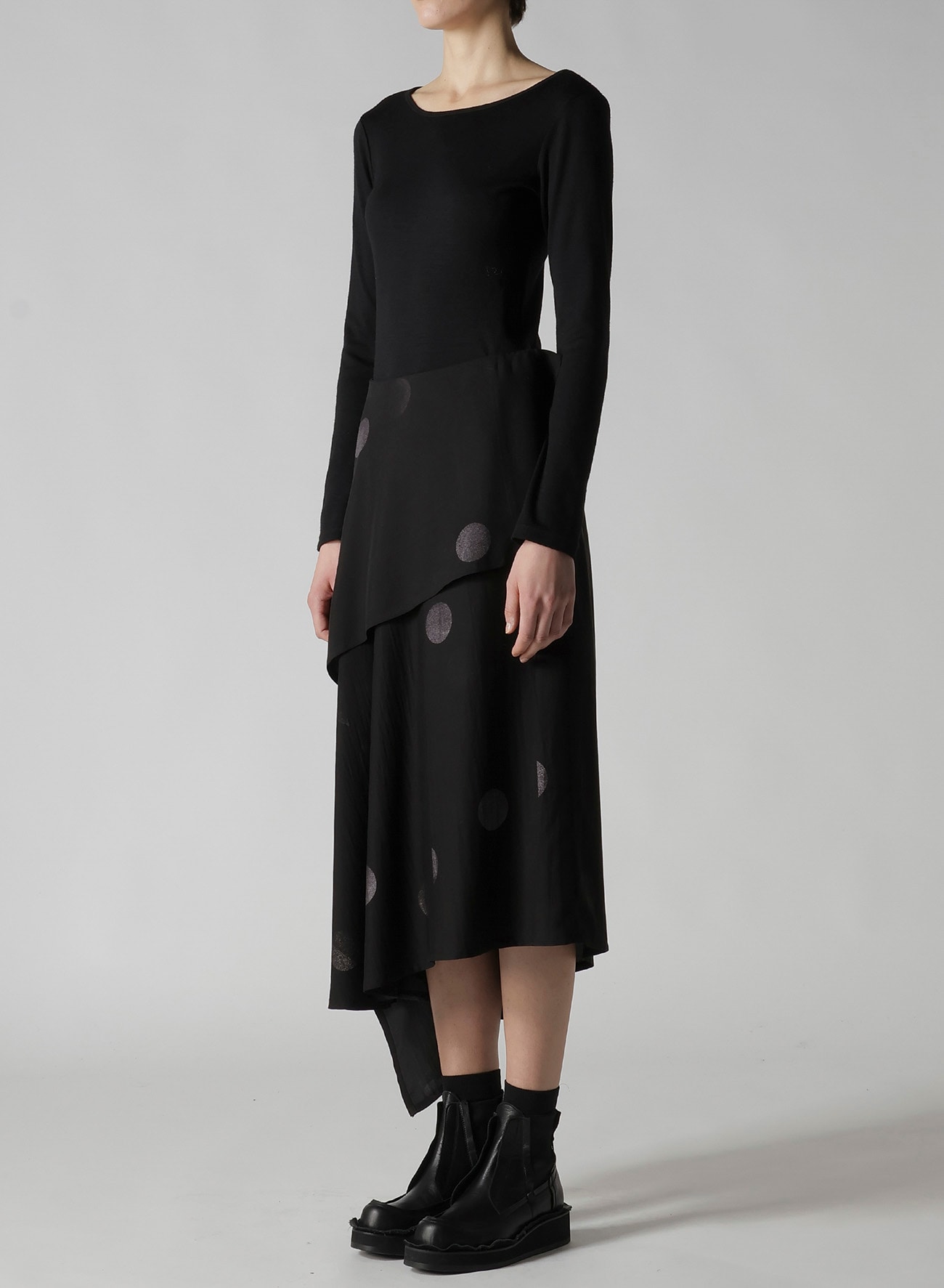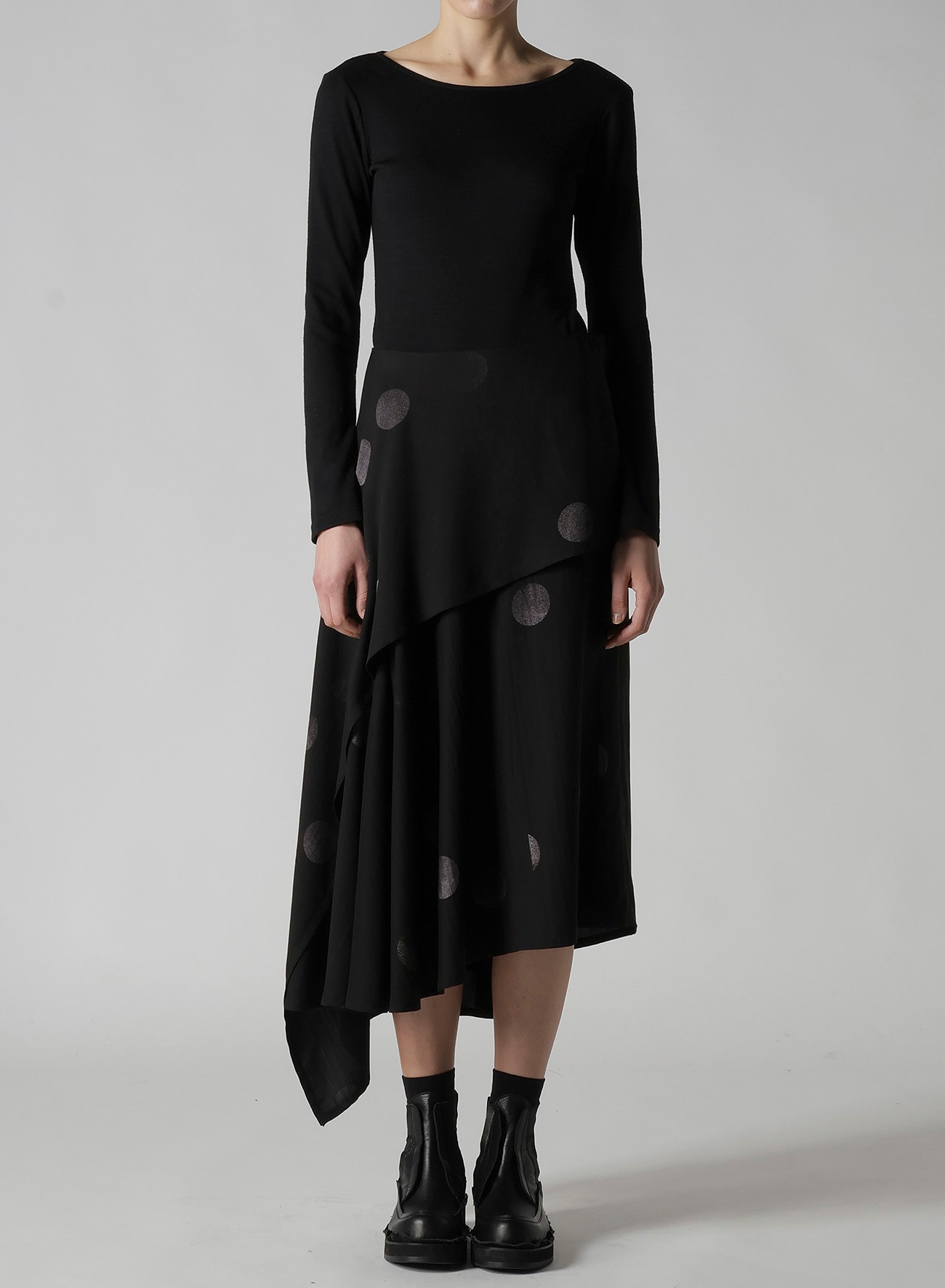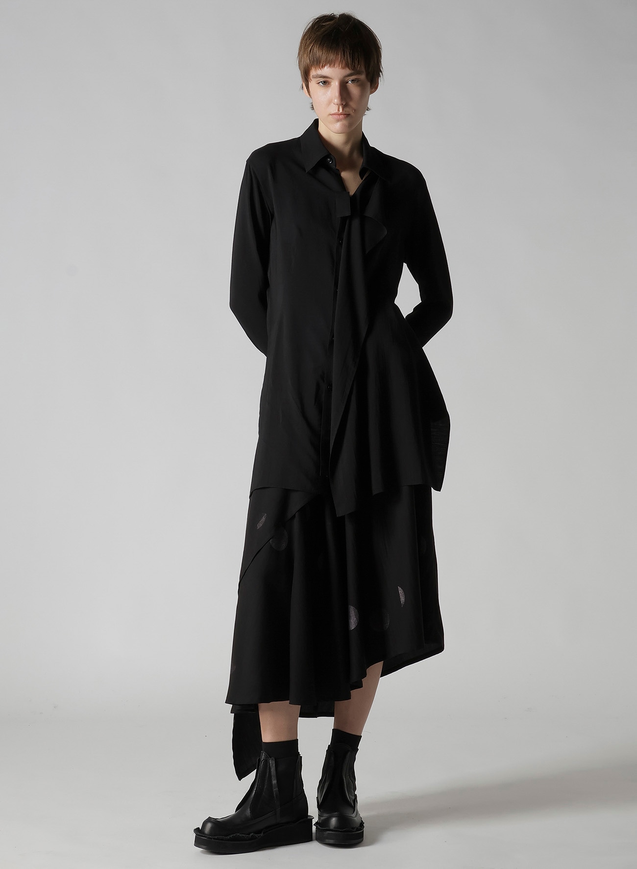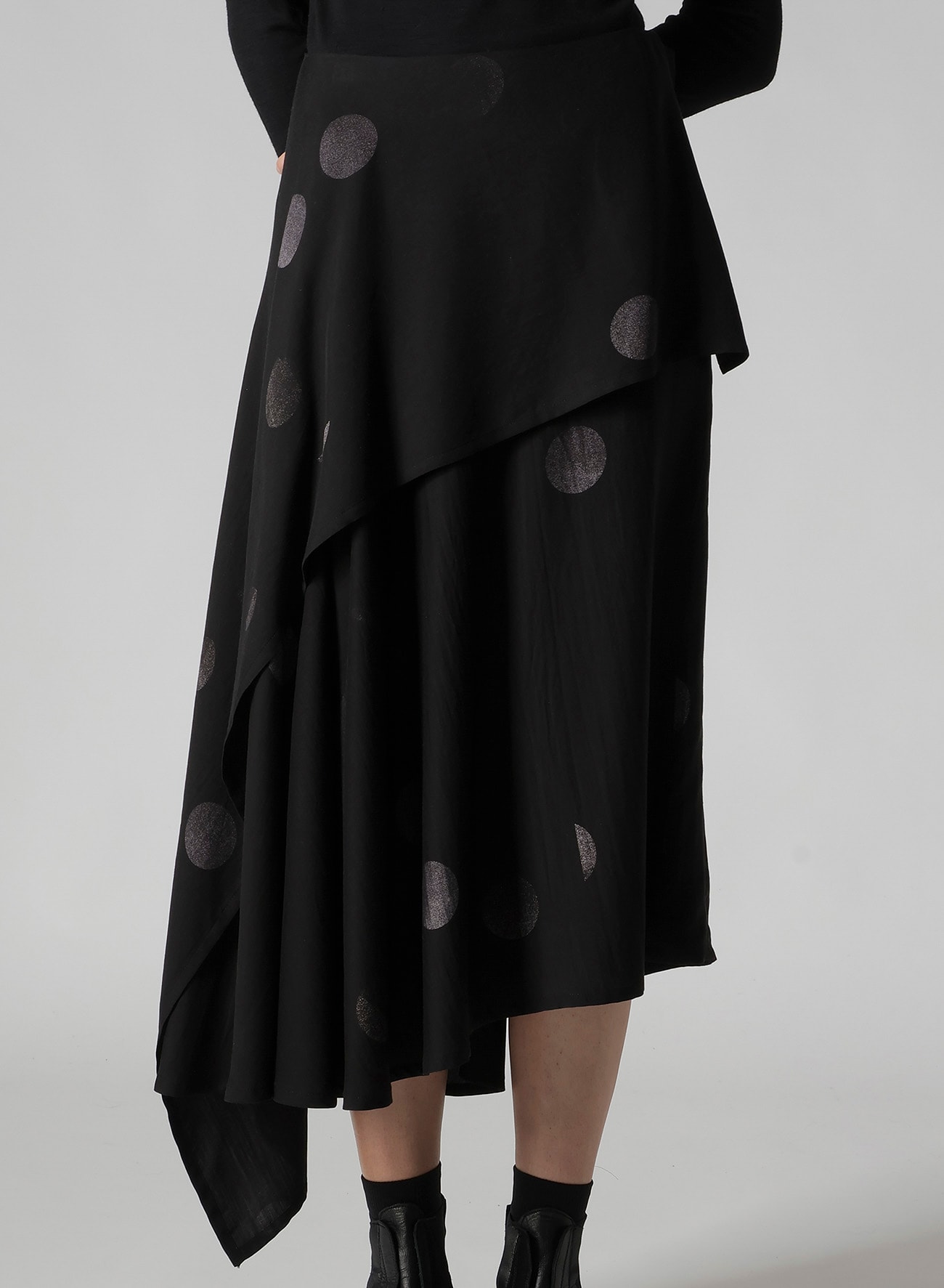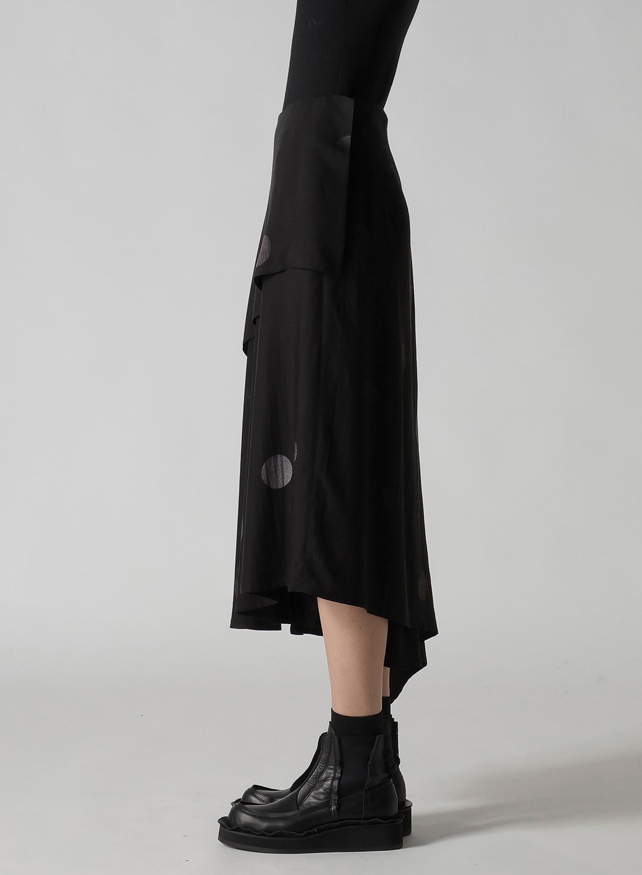 アシンメトリーミドル丈スカート。水玉柄に蝶が集まってくるイメージと山本耀司の「t's very delicate, but strong(繊細でありながらも力強く)」というメッセージで構成された柄。2枚の布が包み込むように重なり見る角度によって違う表情を見せるアシンメトリーデザイン。動くと揺れるドレープが軽やかな印象をつくります。