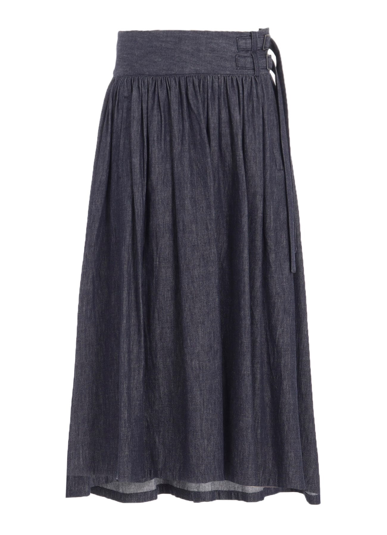 やわらかな風合いが特徴のデニム生地を使用したギャザースカート。太いベルトとアシンメトリーなシルエットが特徴です。右脇にはポケットが付いています。ウエストベルトにはアジャスター付きで、スカートの履く位置を調整できます。