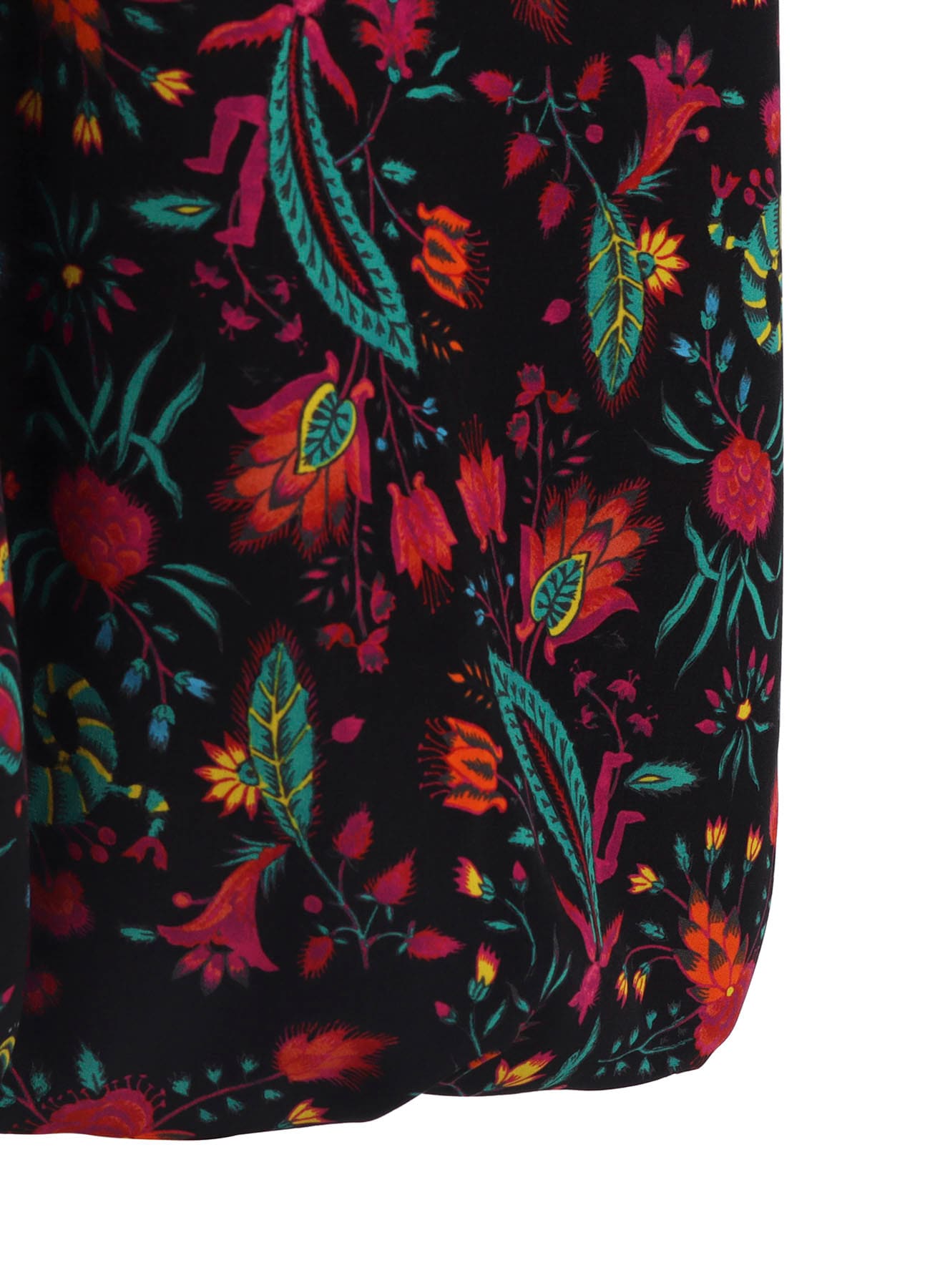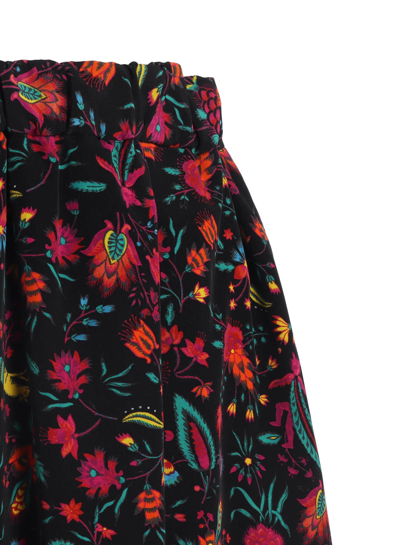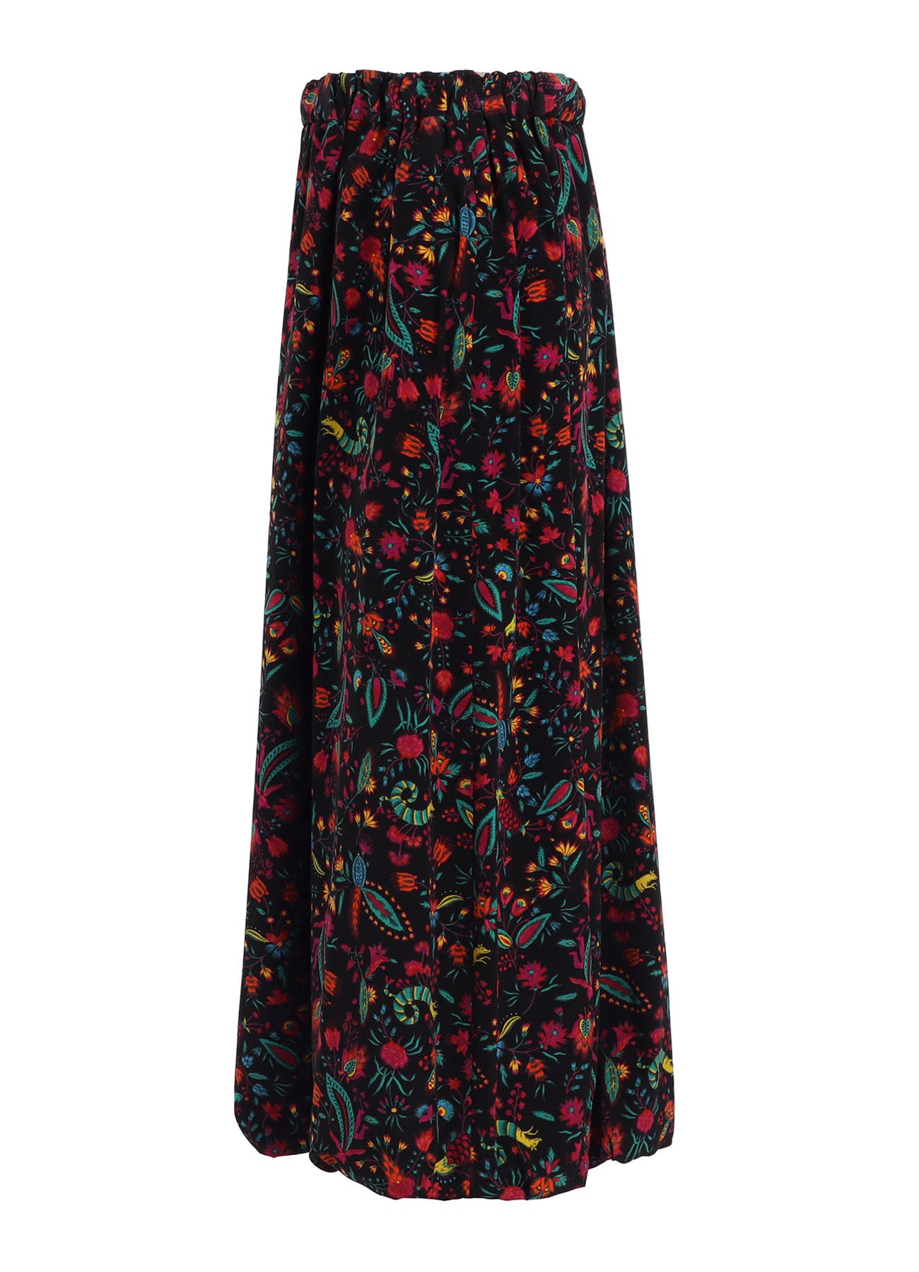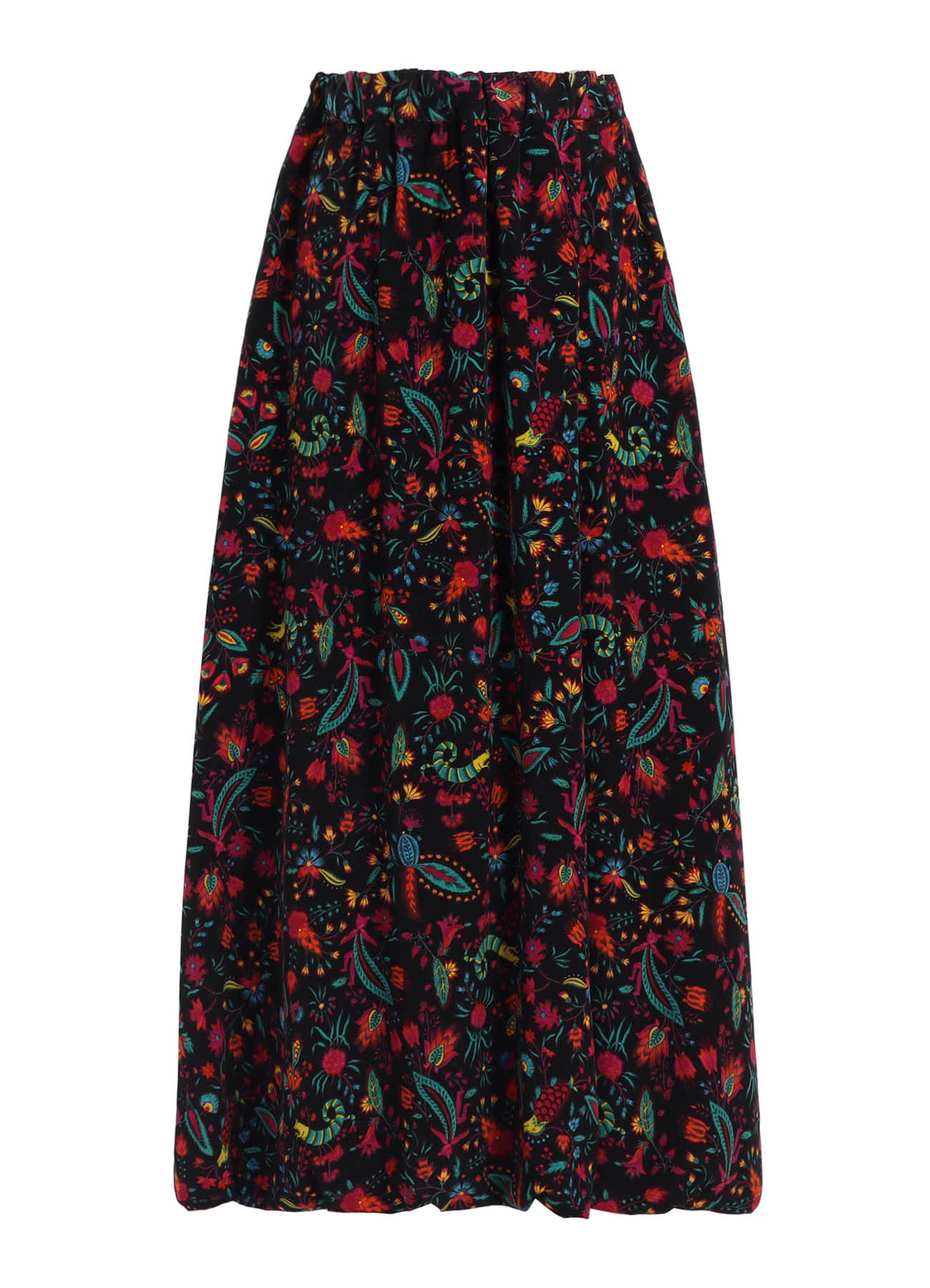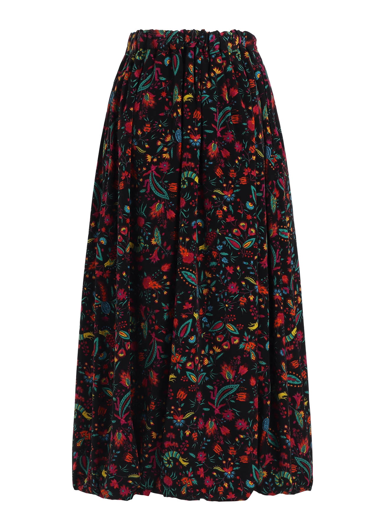 鮮やかなプリントが目を引くバルーンスカート。過去に展開した柄を再構成しており、数百年前の壁紙をソースに色彩で装飾された植物や架空の生き物を描いています。ウエストはゴムの仕様で、裾が緩やかに丸みを帯びたバルーンのシルエット。