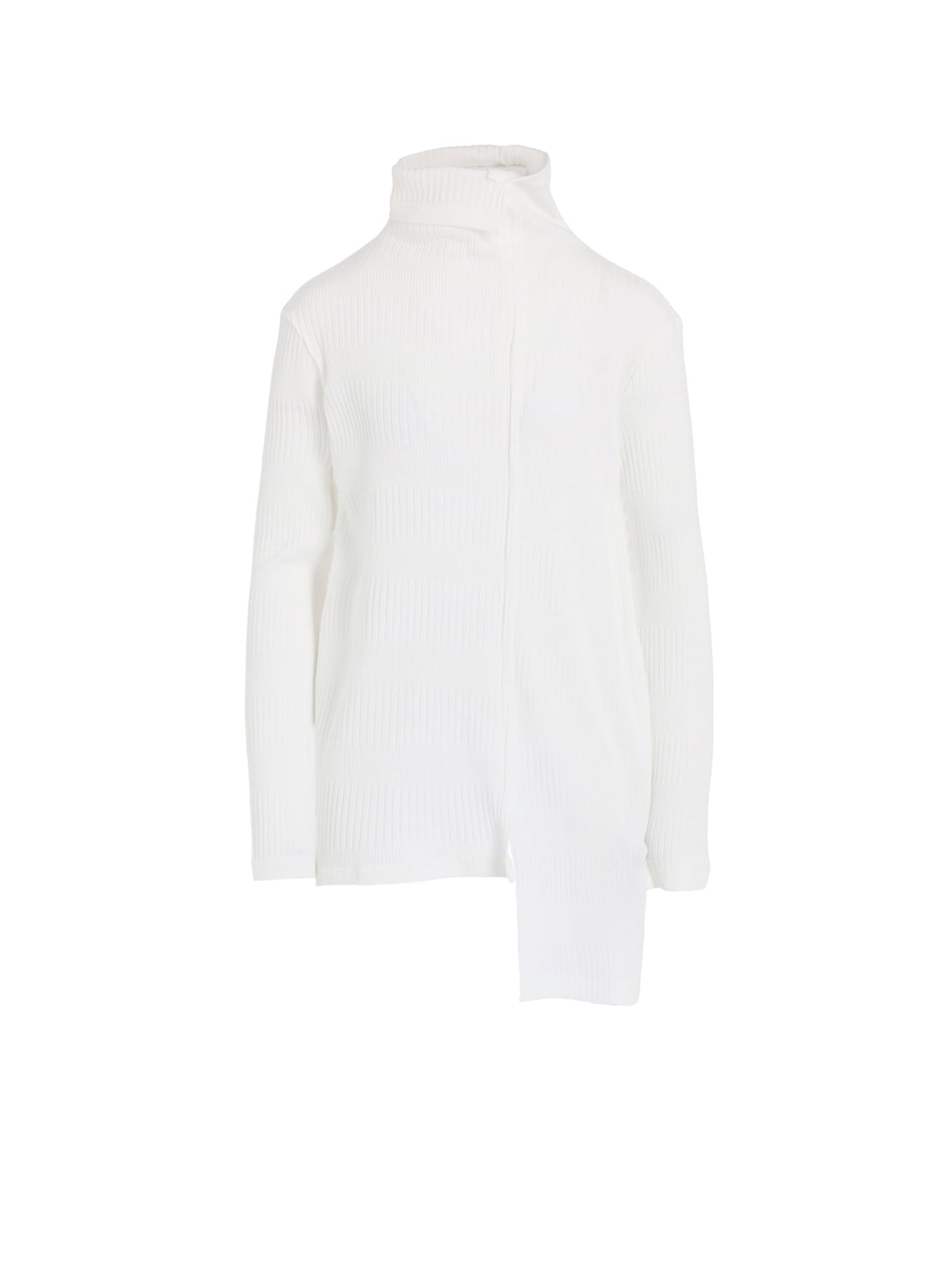 ランダムにボーダーが入ったコットン素材のハイネック長袖アシメカットソー。前後に切り替えを入れ、ずらしたボーダー柄がワイズらしいデザイン。様々なアイテムに合わせやすく便利にお使いいただけます。