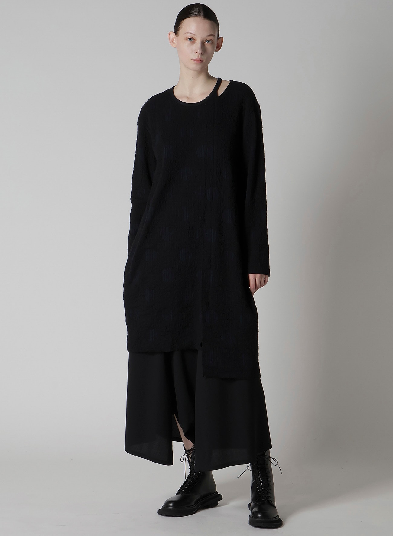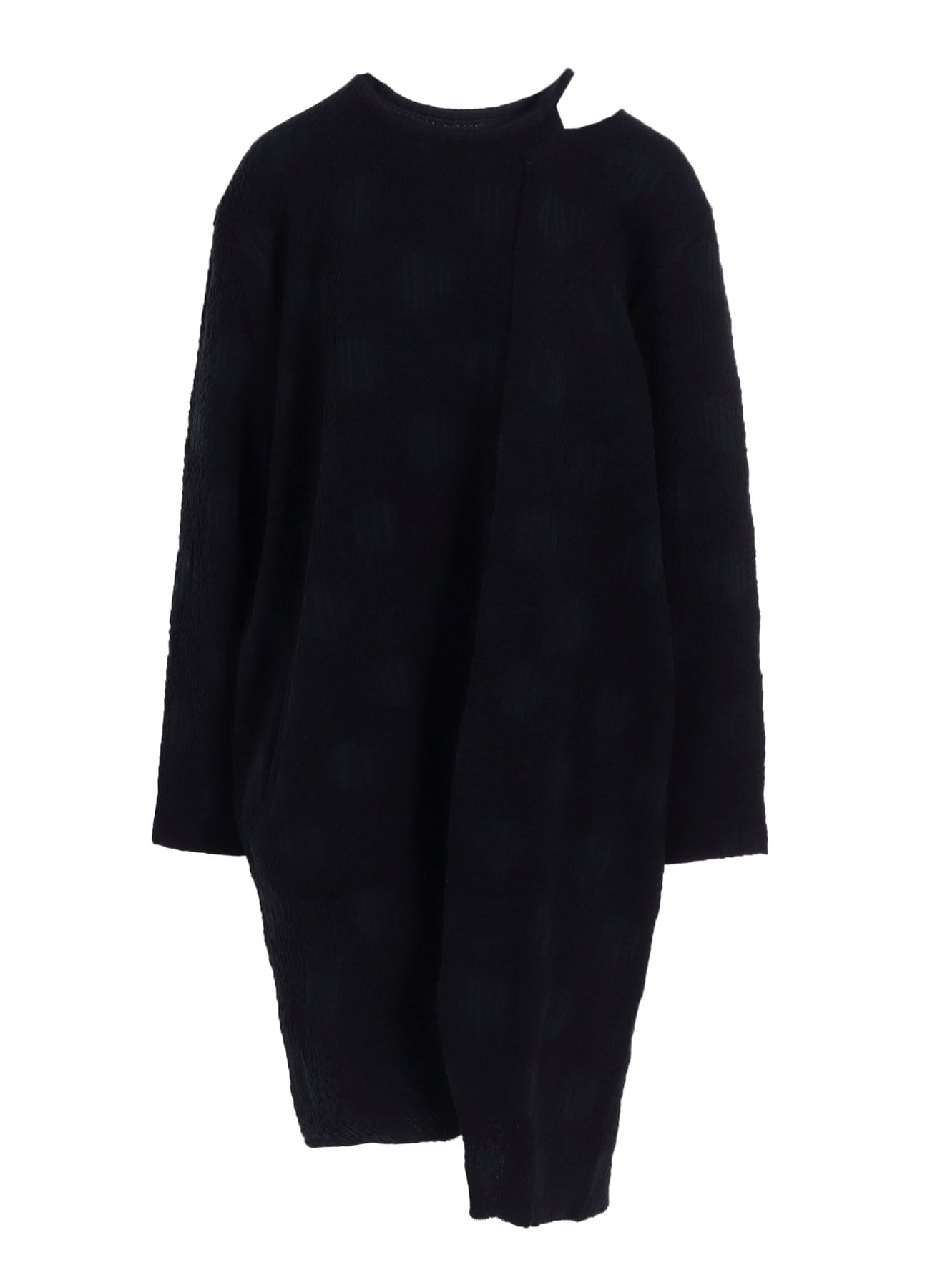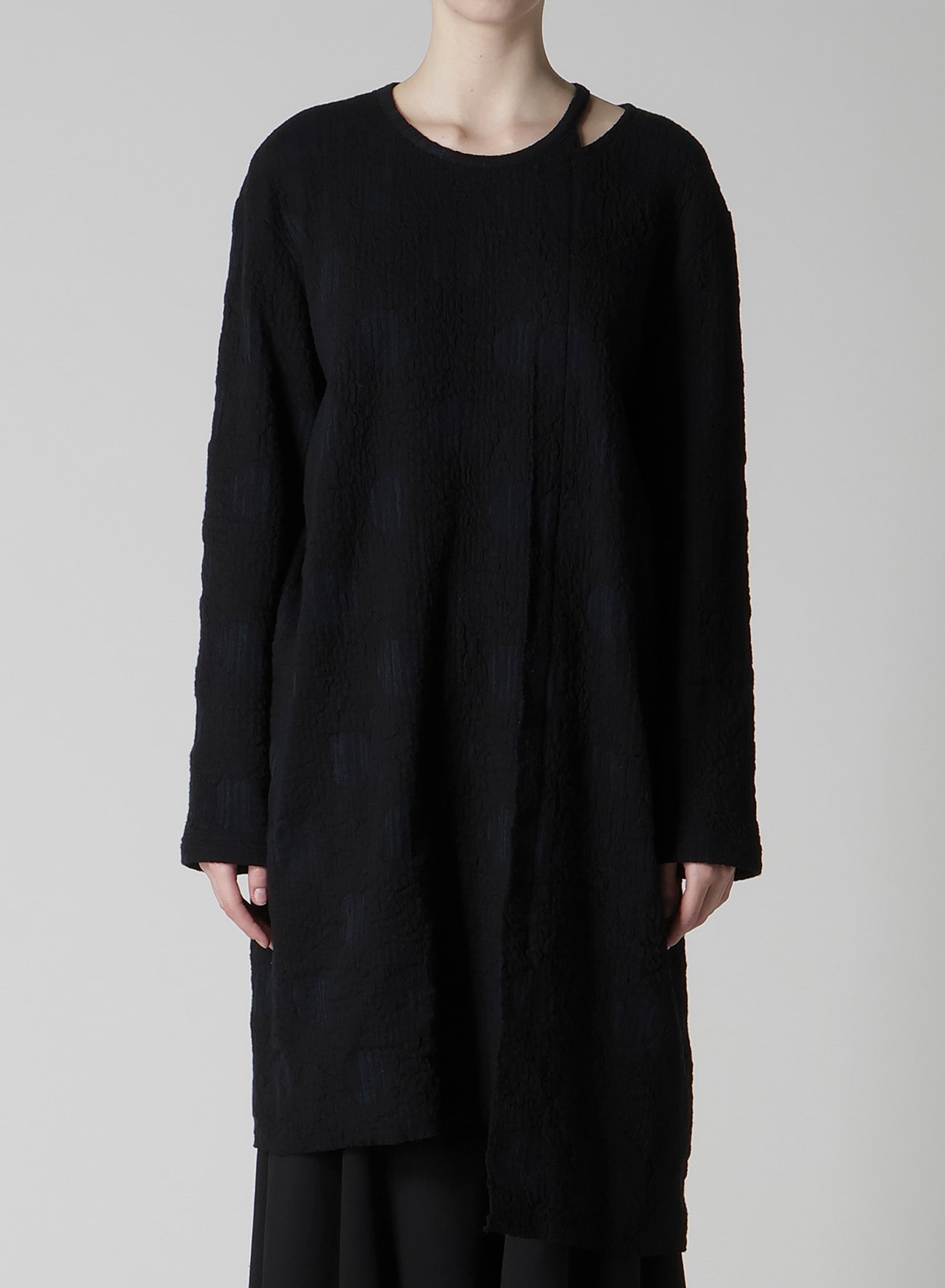 伸びがよく軽い着心地の長袖カットソー。水玉の中がランダムストライプになっています。襟元や左裾の段差が印象的なデザイン。ワンピースのようなロング丈で右前にはポケットが付いています。
