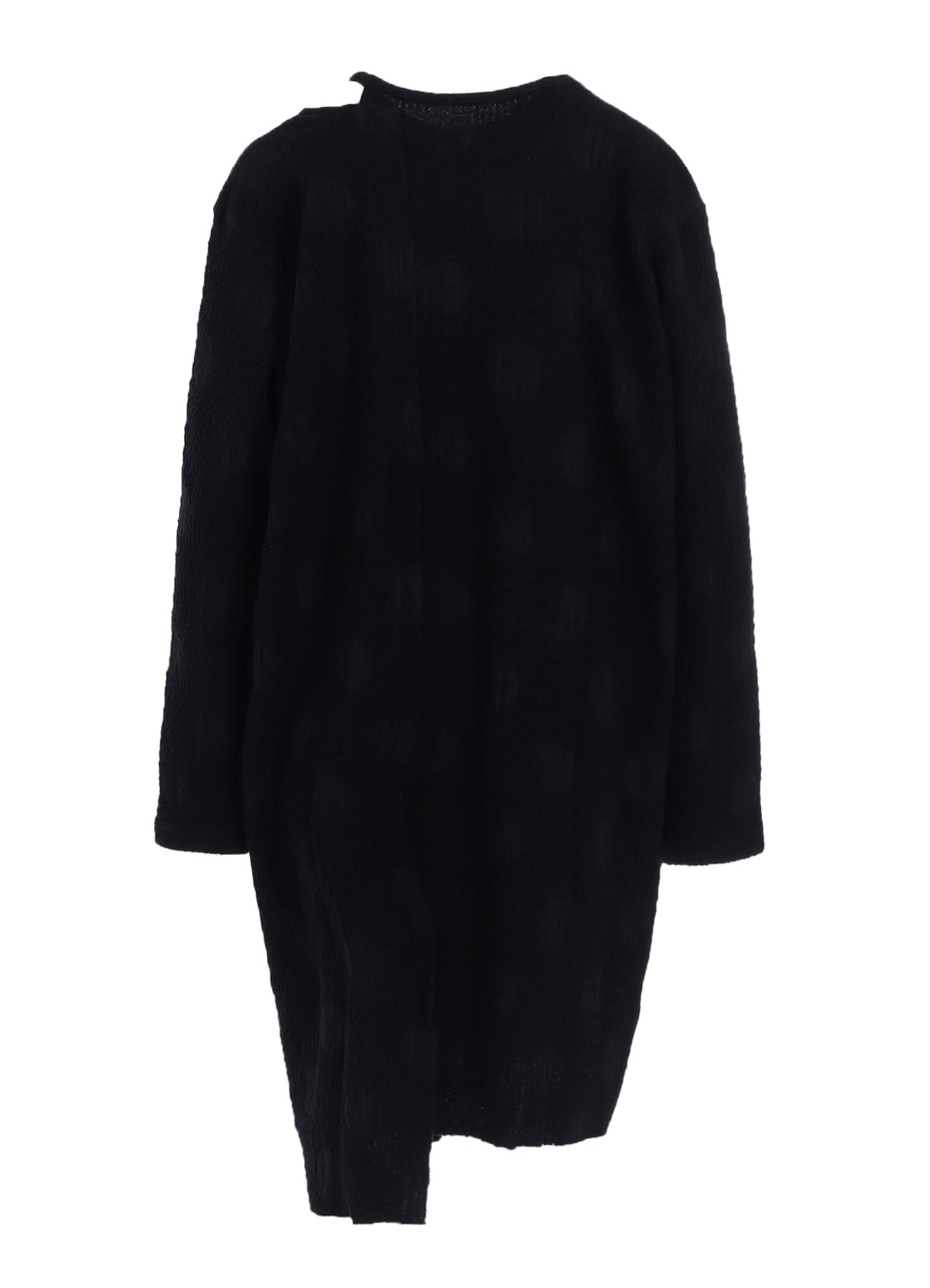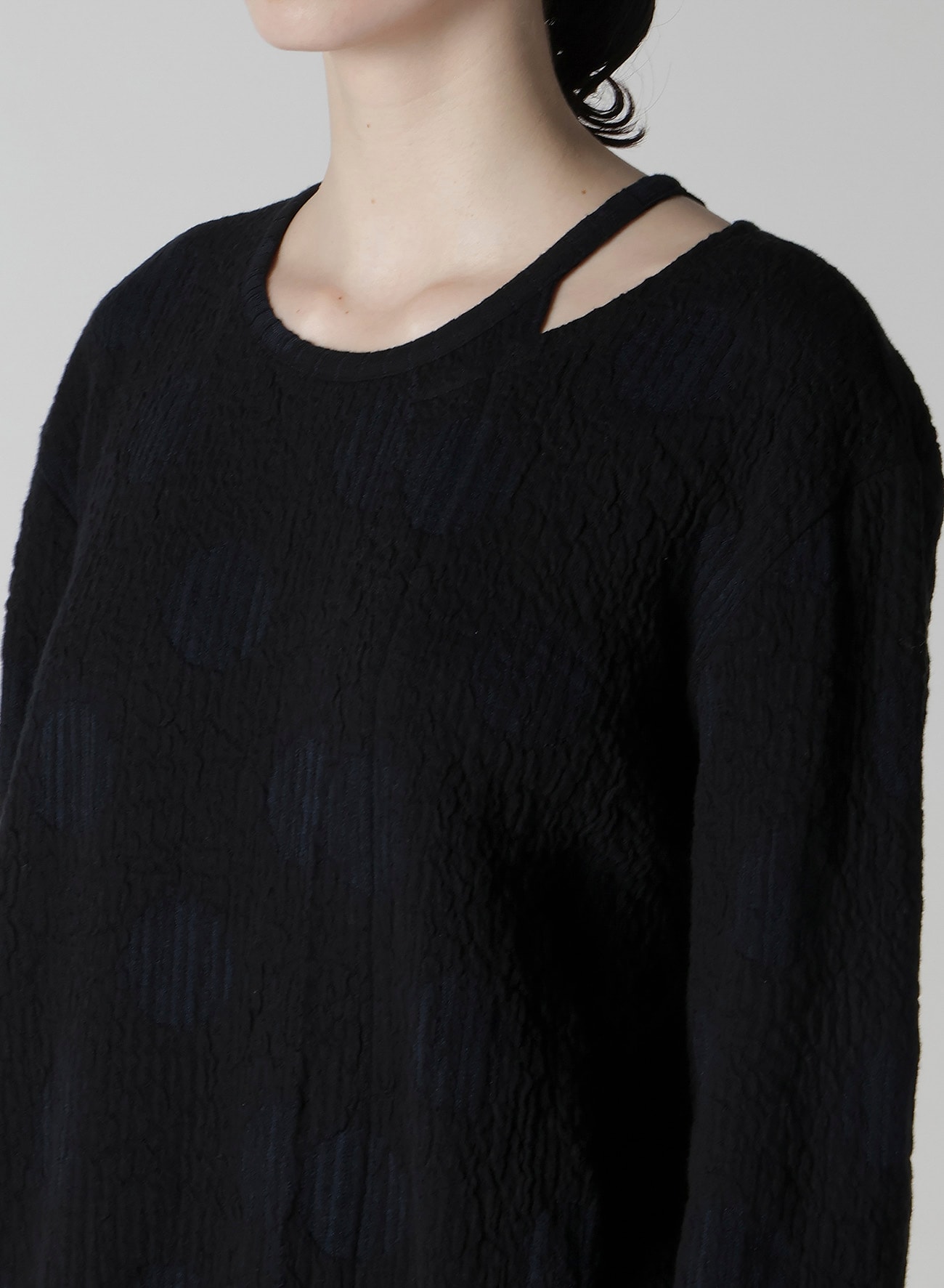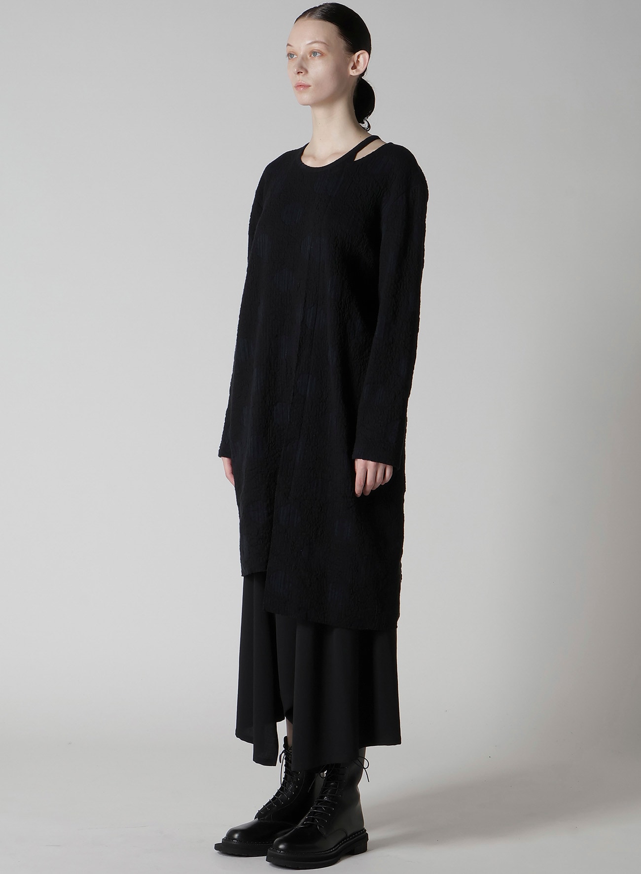 伸びがよく軽い着心地の長袖カットソー。水玉の中がランダムストライプになっています。襟元や左裾の段差が印象的なデザイン。ワンピースのようなロング丈で右前にはポケットが付いています。