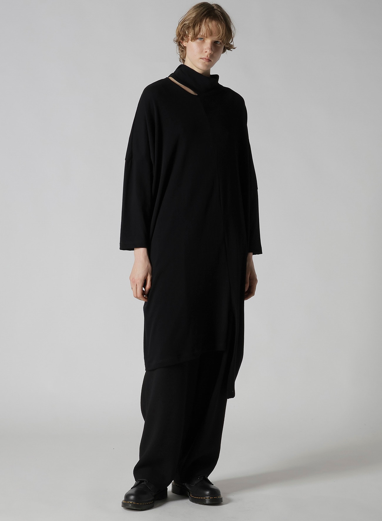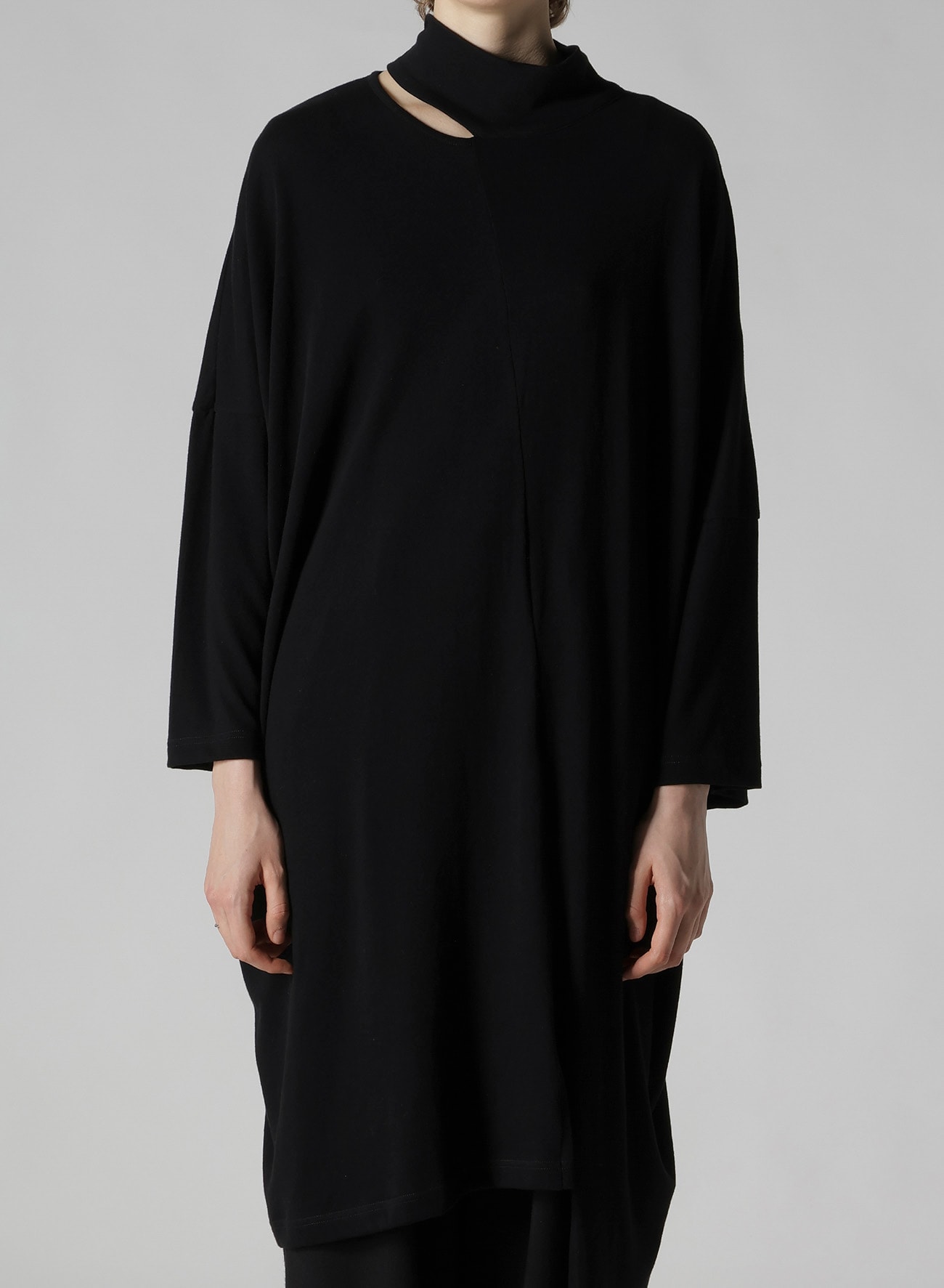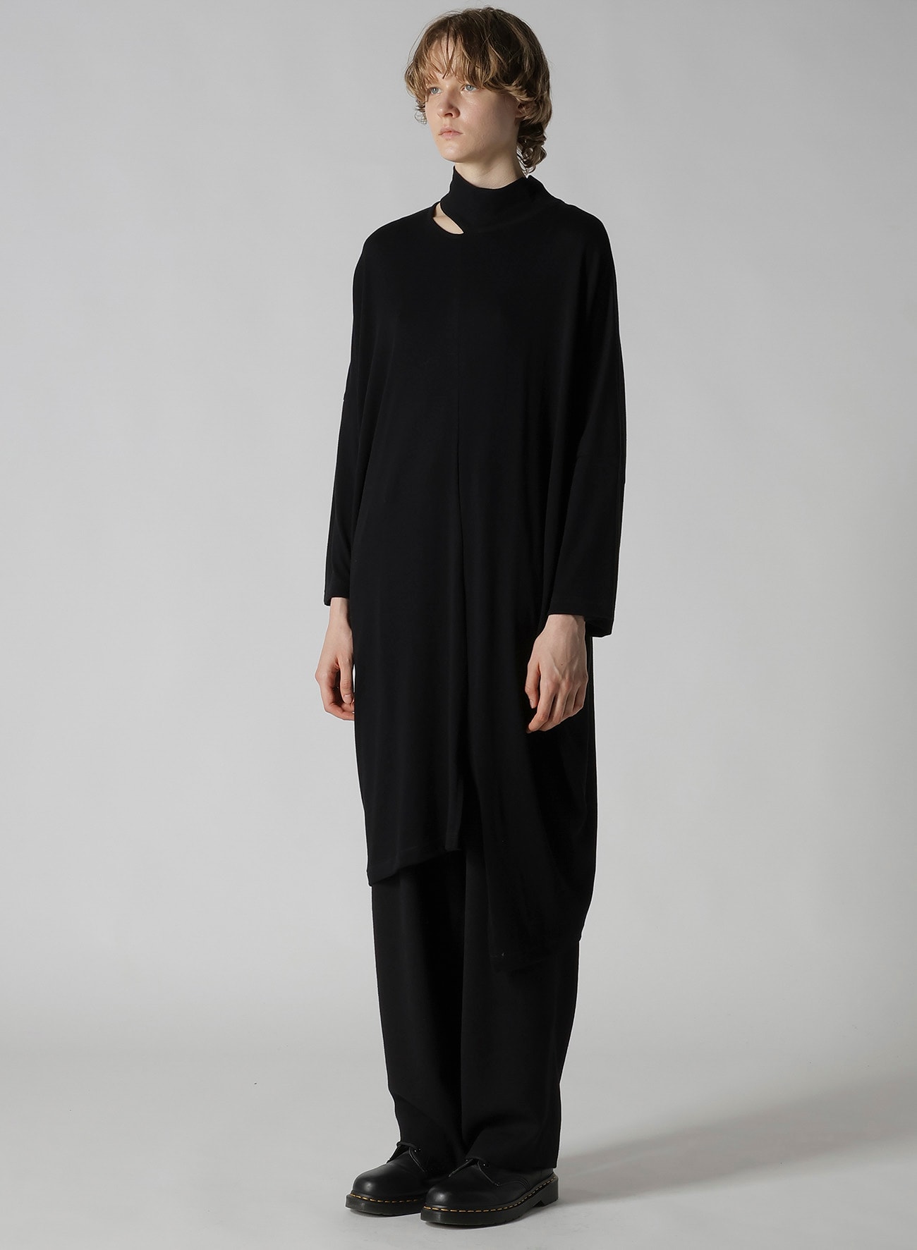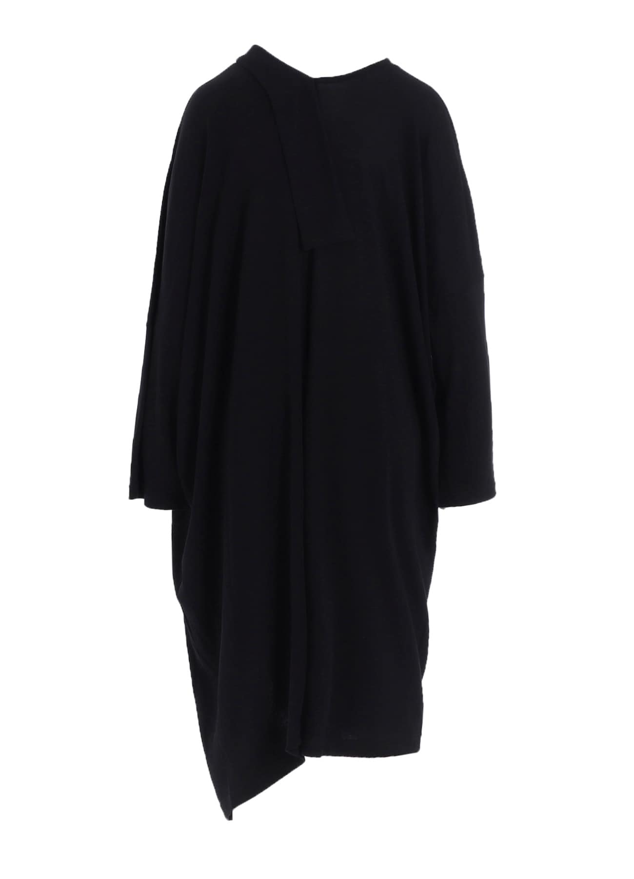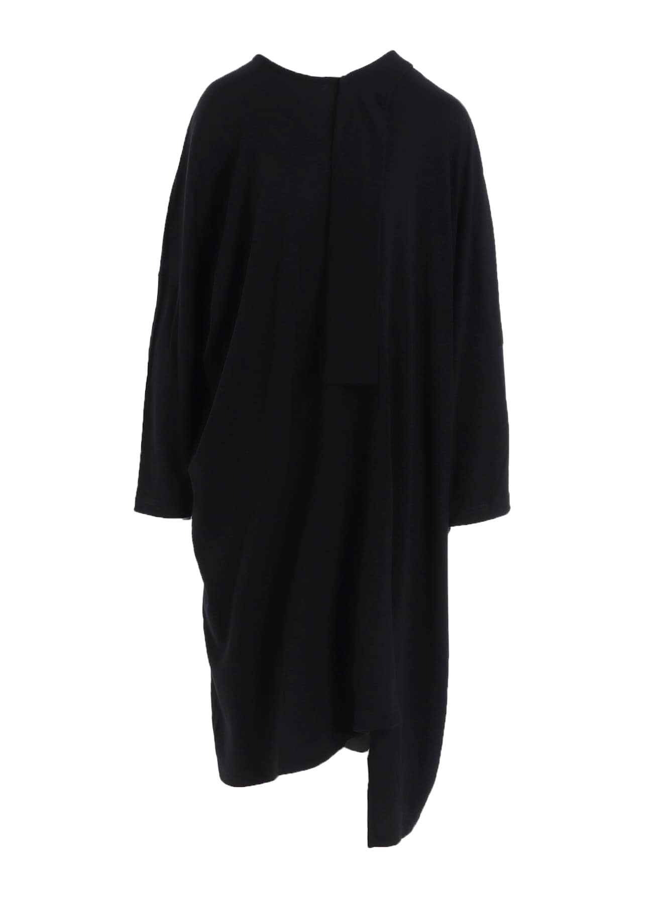 ドレープ感のあるアシンメトリーのカットソーワンピース。左右で身幅、袖丈、袖幅がアシンメトリーになっています。身幅は大きくゆったりとしており、右身頃だけ襟が外れたデザインで、垂れている襟部分を結ぶとアクセントになります。柔軟加工を行い、軽くさらりとした気持ちのよい着心地です。