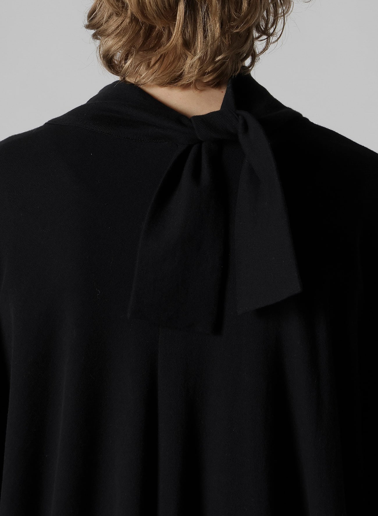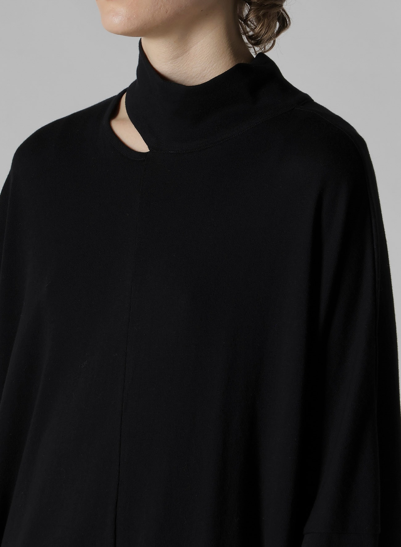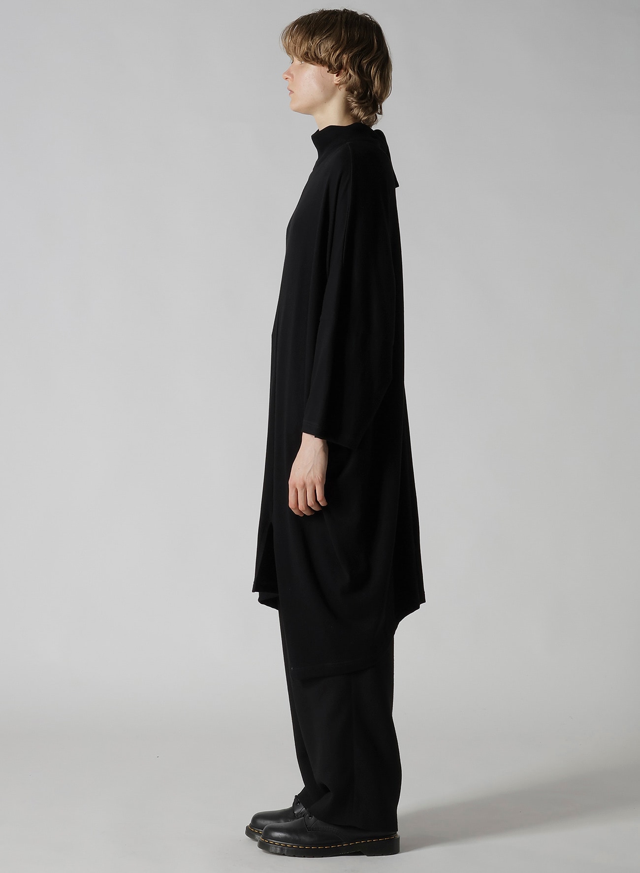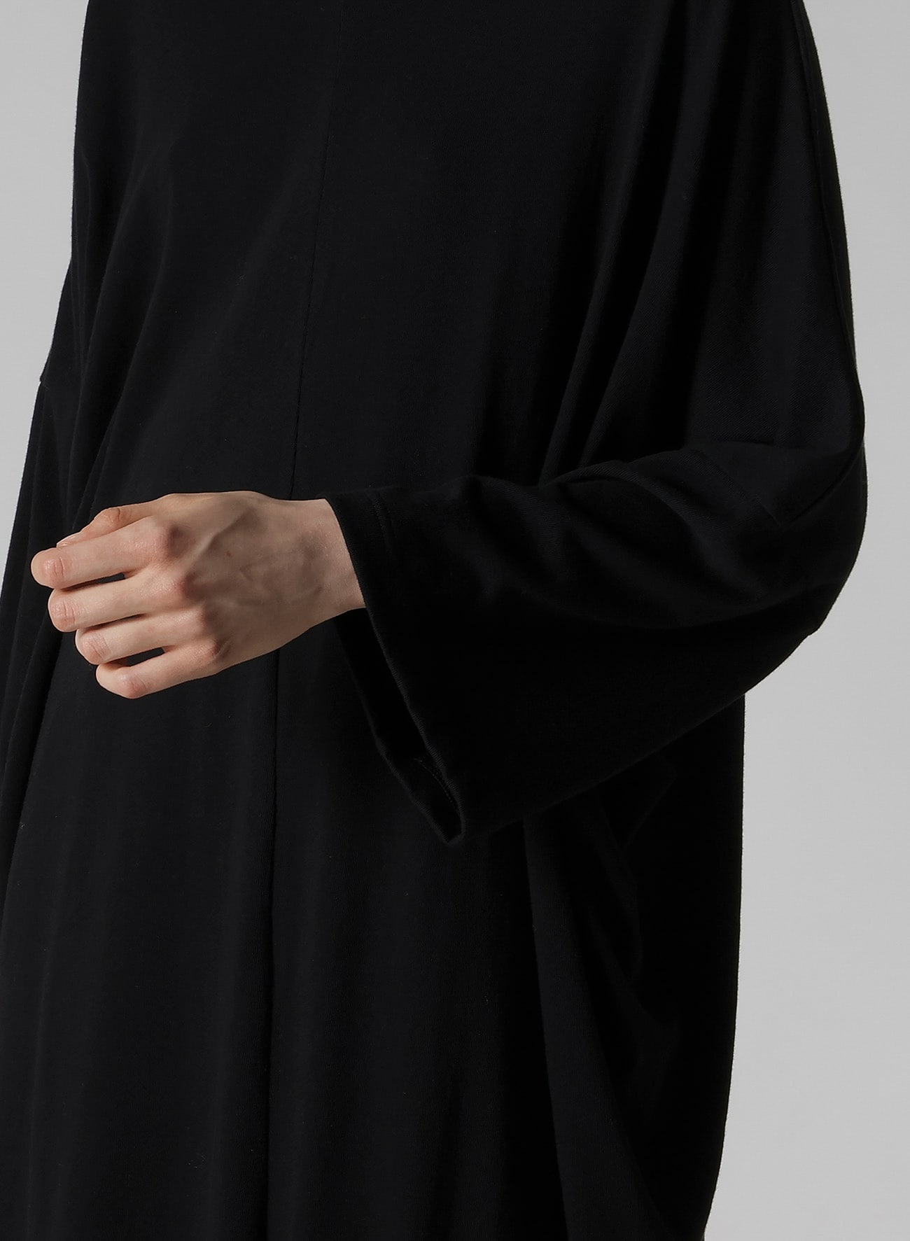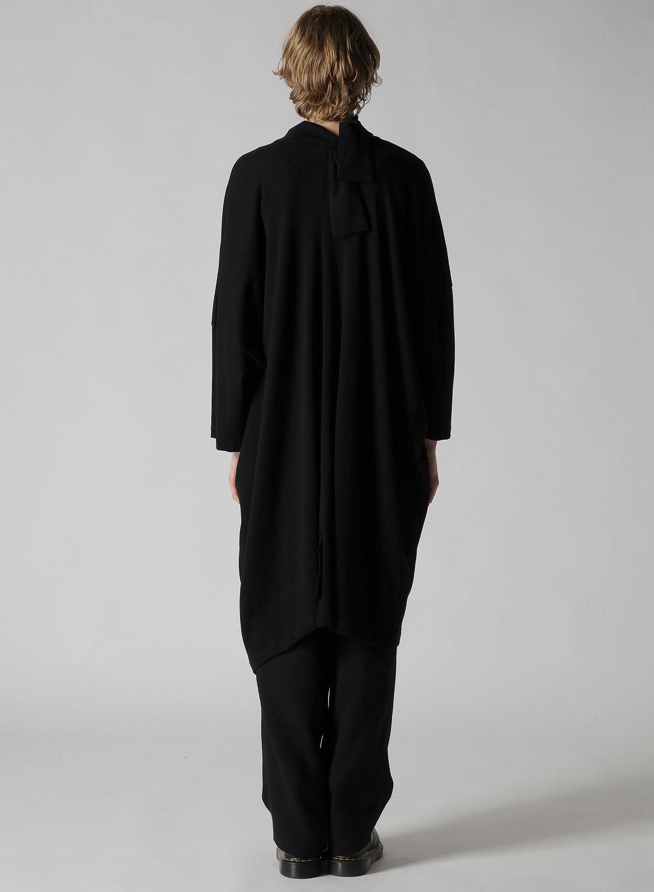 ドレープ感のあるアシンメトリーのカットソーワンピース。左右で身幅、袖丈、袖幅がアシンメトリーになっています。身幅は大きくゆったりとしており、右身頃だけ襟が外れたデザインで、垂れている襟部分を結ぶとアクセントになります。柔軟加工を行い、軽くさらりとした気持ちのよい着心地です。