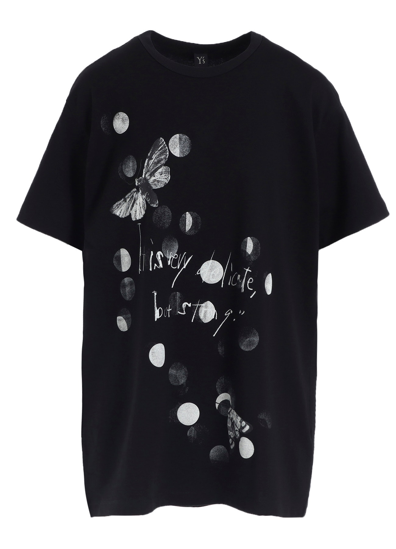 オーバーサイズの半袖カットソー。水玉柄に蝶が集まってくるイメージと山本耀司の「t's very delicate, but strong(繊細でありながらも力強く)」というメッセージで構成されたデザイン。オーバーサイズのシルエットで男性にもおすすめのアイテムです。