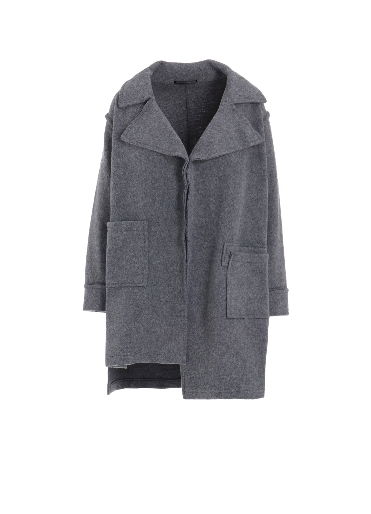 ポケットの位置がアシンメトリーになっているロング丈コート。表面を起毛させた軽く、暖かい風合いの鹿の子編みの生地を使用しています。裁ち切りの仕様と大きめのポケットがカジュアルな印象。前端をスナップボタンで止めるデザインでスッキリとしたシルエットです。