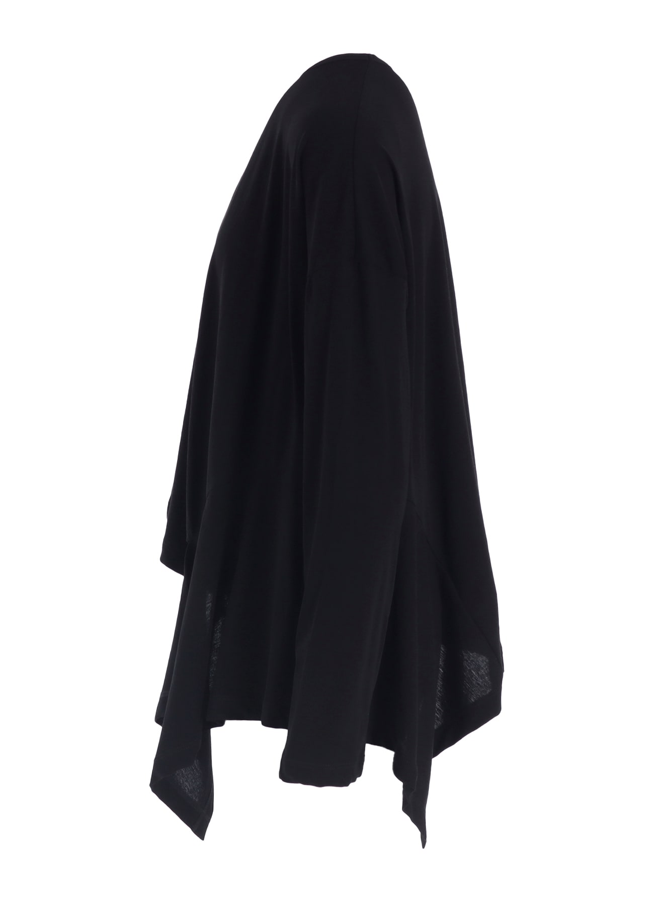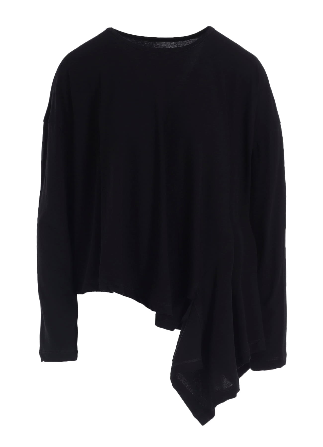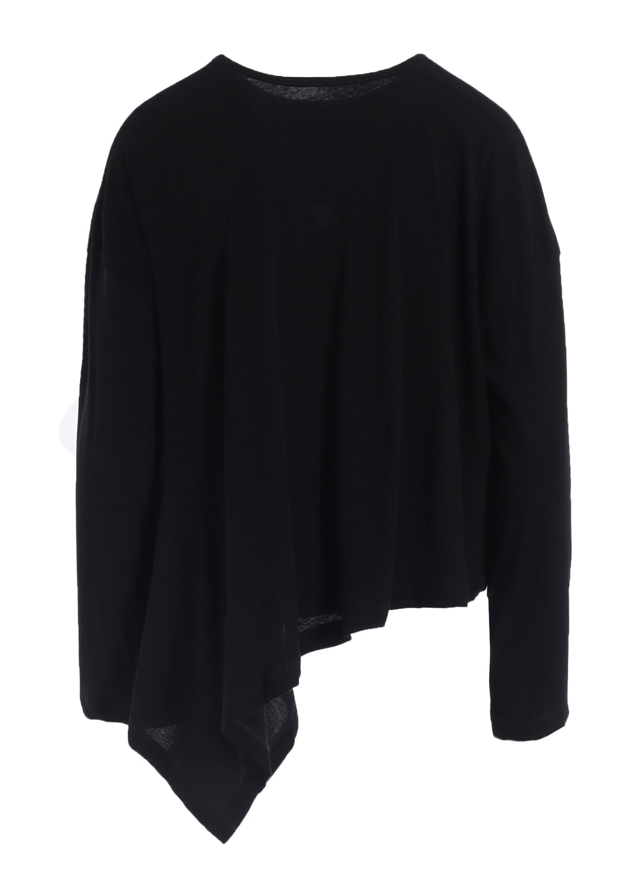 アシンメトリーな丸首長袖カットソー。裾が左下がりになったアシンメトリーなデザインで、スリットからシルエットに動きが生まれます。強く撚りをかけた糸を使用しており、さらりとした清涼感のある肌触りがポイント。全体は短めでどんなボトムスにもあわせやすいアイテムです。