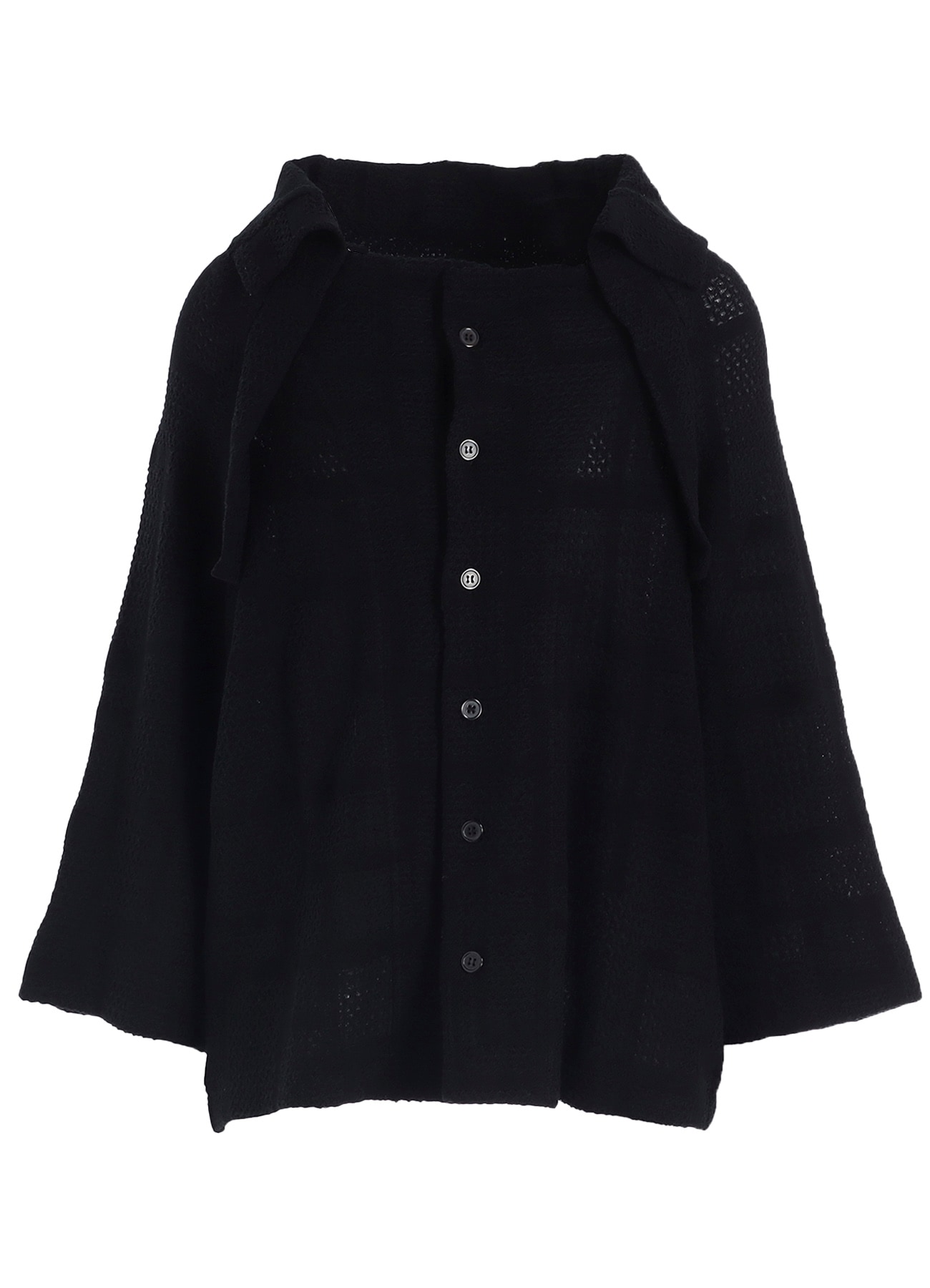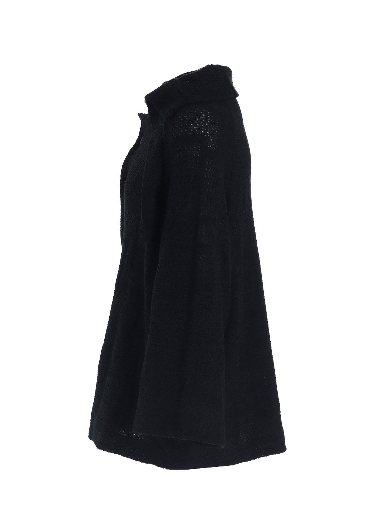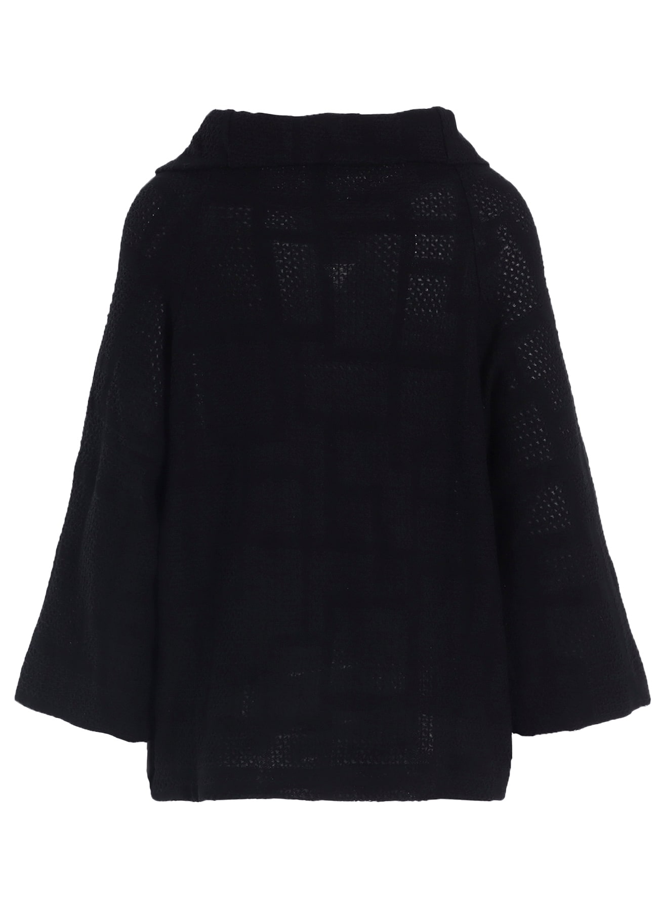 襟付きラグランカーディガン。ゆったりとした袖と身頃が独特のシルエットを作ります。インナーにハイネックや長袖のアイテムを重ねることもでき、同素材のサルエルパンツとのセットアップコーディネートも楽しめます。ジャガードで幾何学模様を作り、弾力のある手触りです。