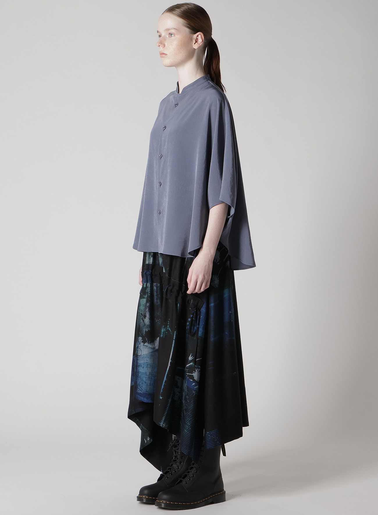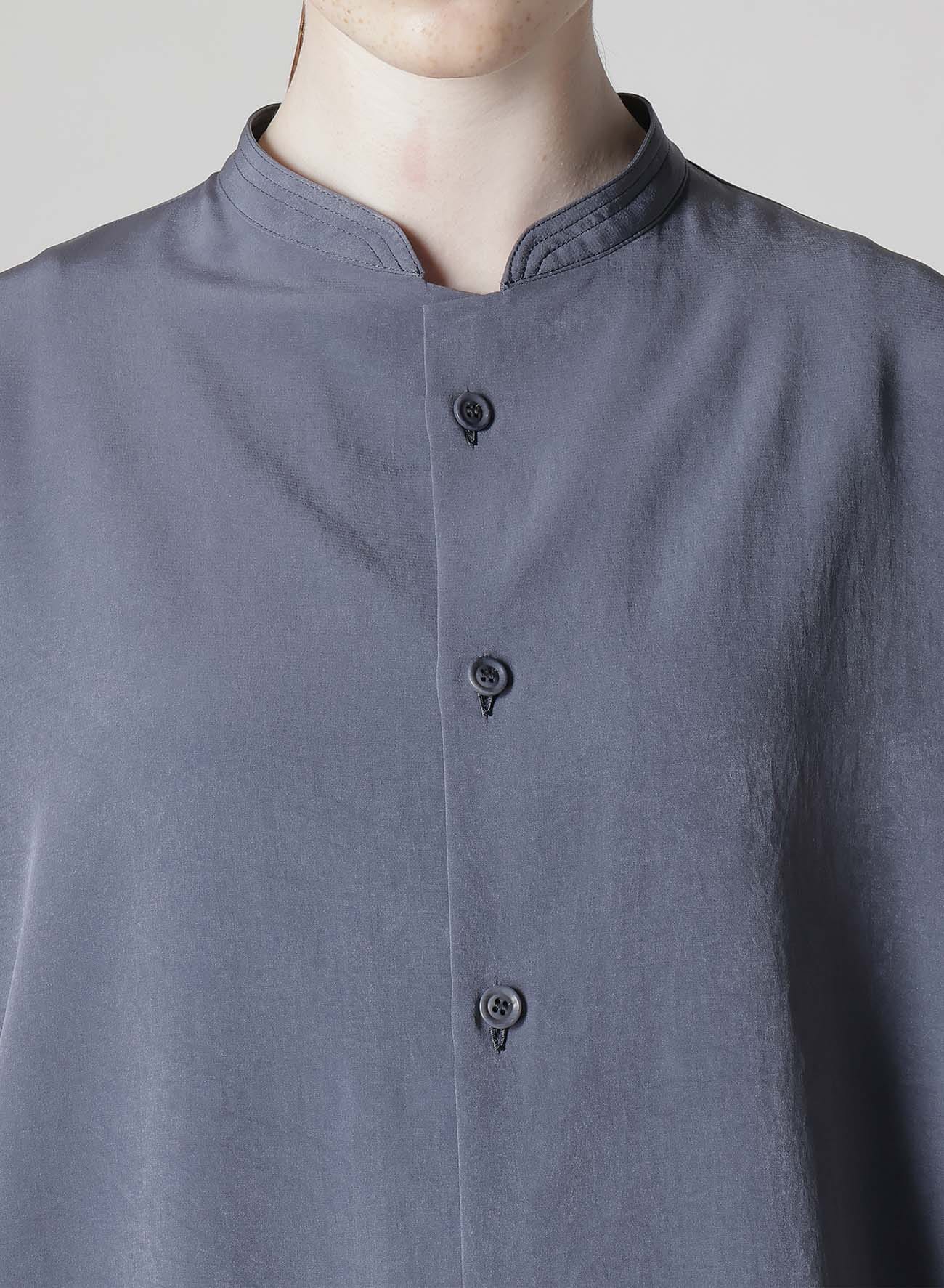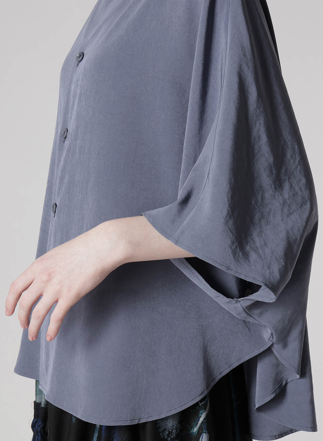 定番人気のトリアセテート・ポリエステルデシン生地を使用したスタンドカラーケープブラウス。マイルドな光沢感と高級感のある生地はシワになりにくく、さらっとした軽い着心地でシーズンを通してお召しいただけます。ゆったりとしたシルエットですが、ドレープ感も相まってすっきりと上品にお召しいただけます。