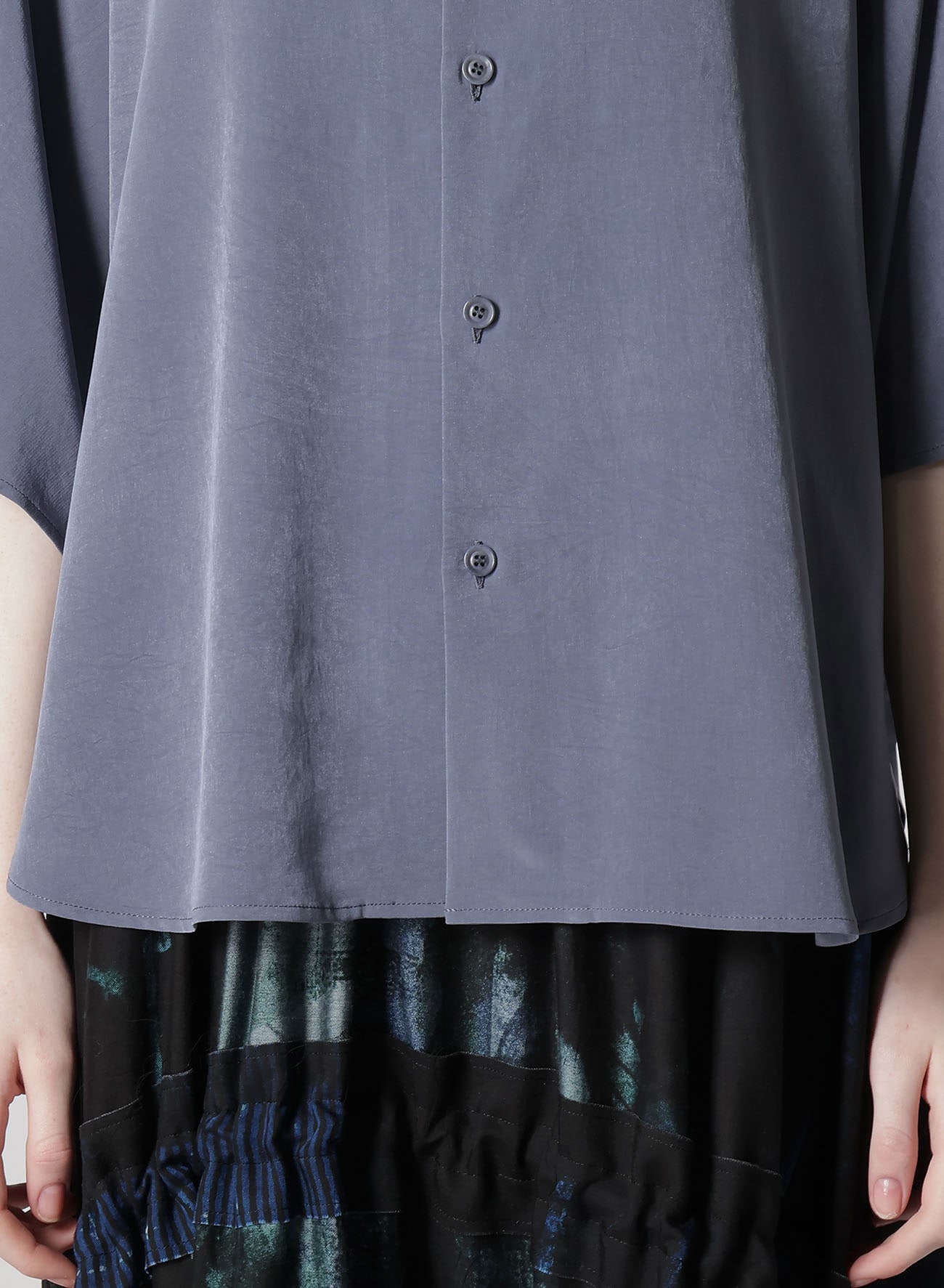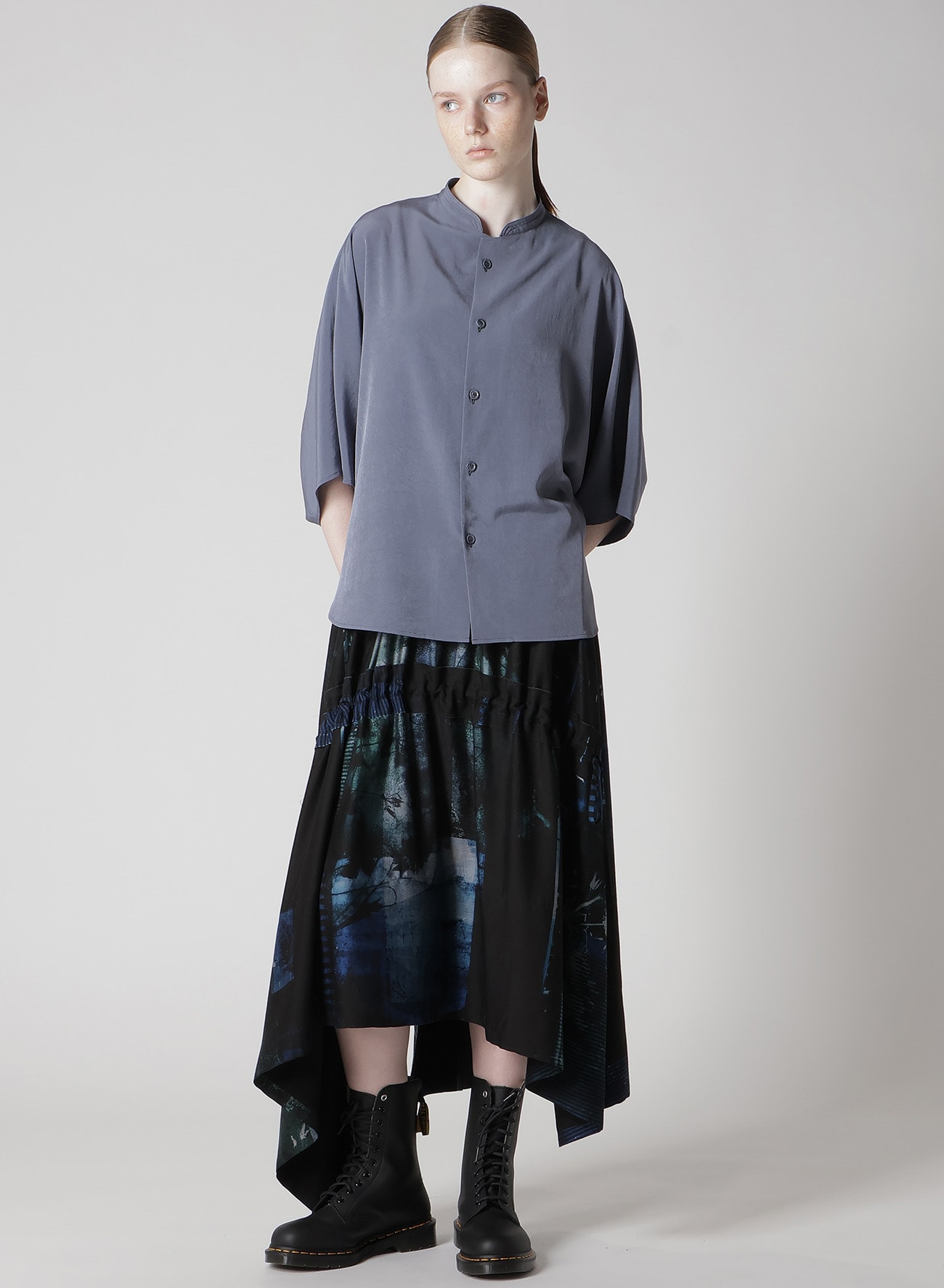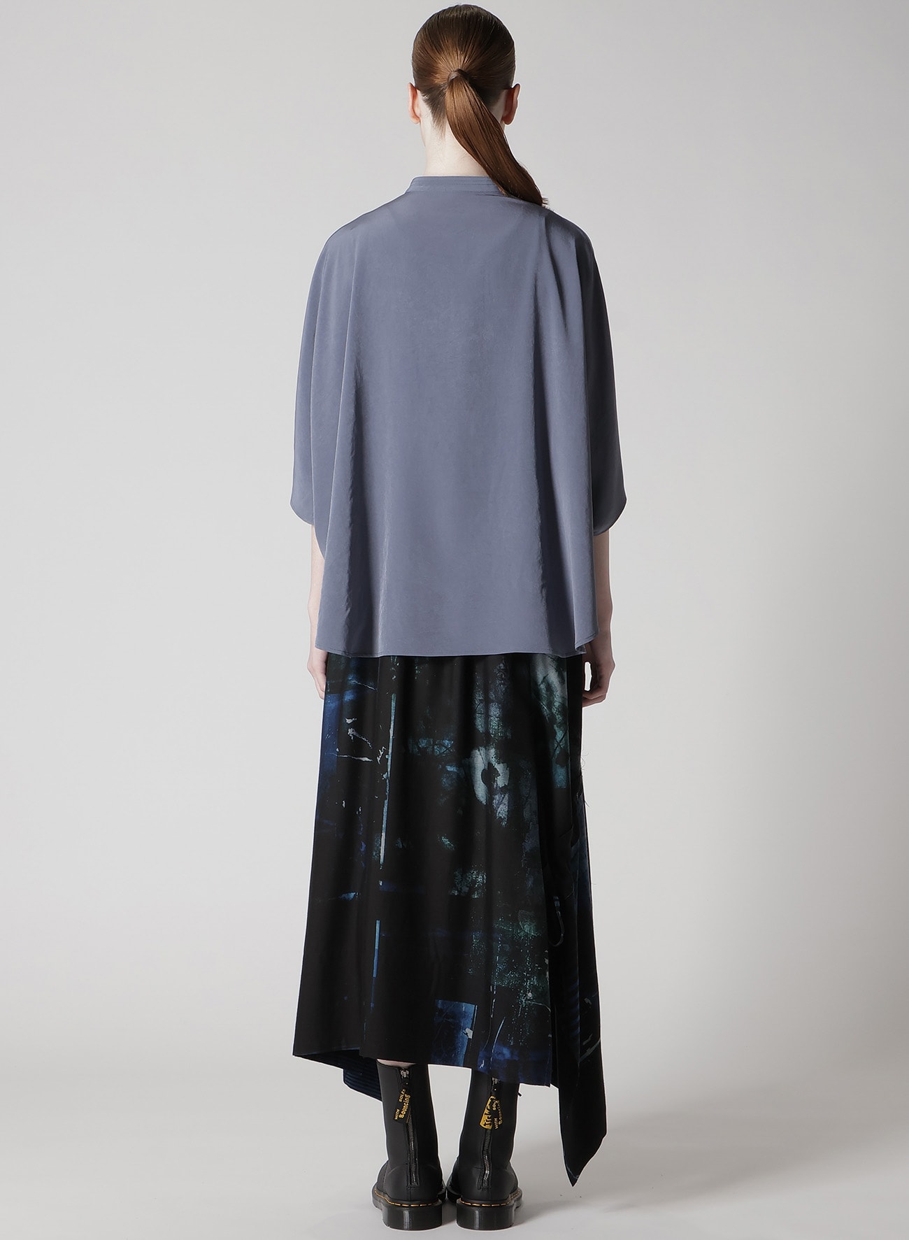 定番人気のトリアセテート・ポリエステルデシン生地を使用したスタンドカラーケープブラウス。マイルドな光沢感と高級感のある生地はシワになりにくく、さらっとした軽い着心地でシーズンを通してお召しいただけます。ゆったりとしたシルエットですが、ドレープ感も相まってすっきりと上品にお召しいただけます。