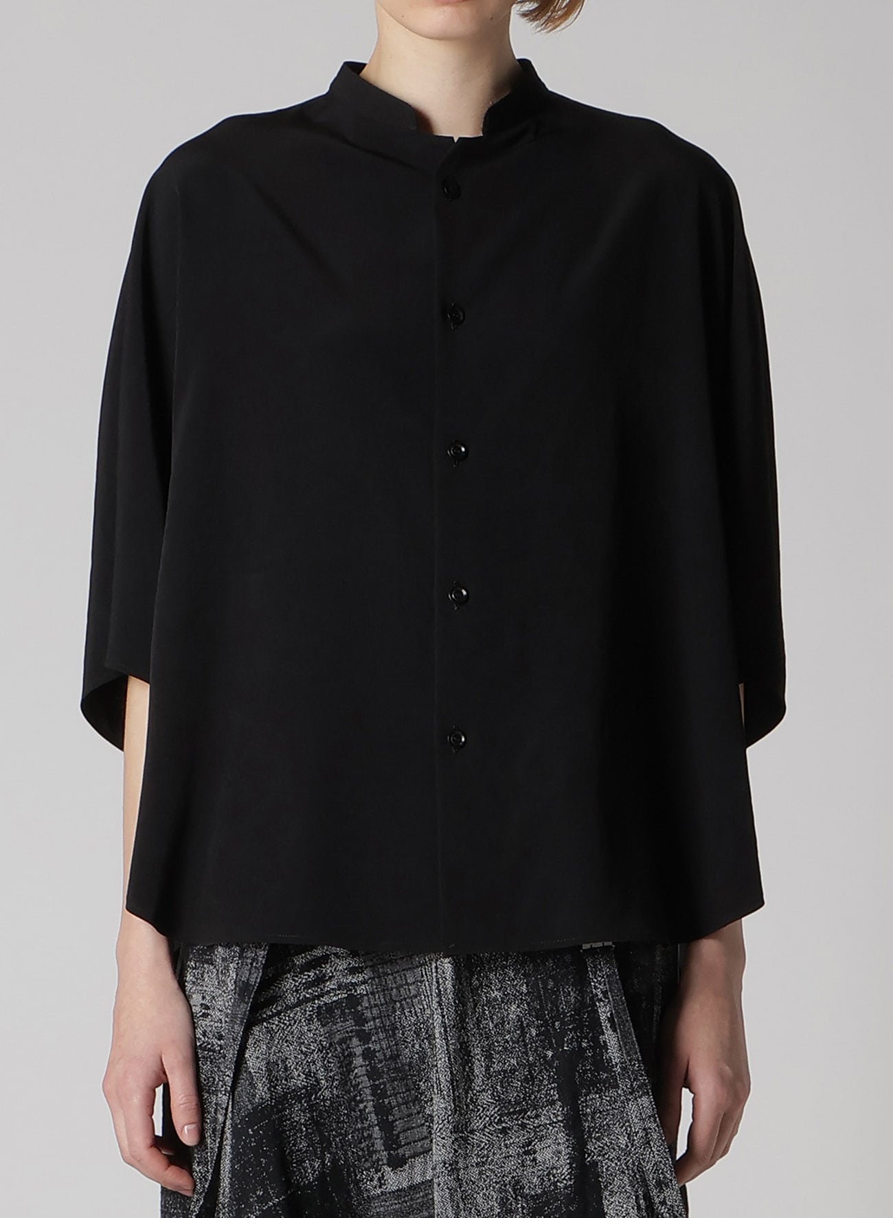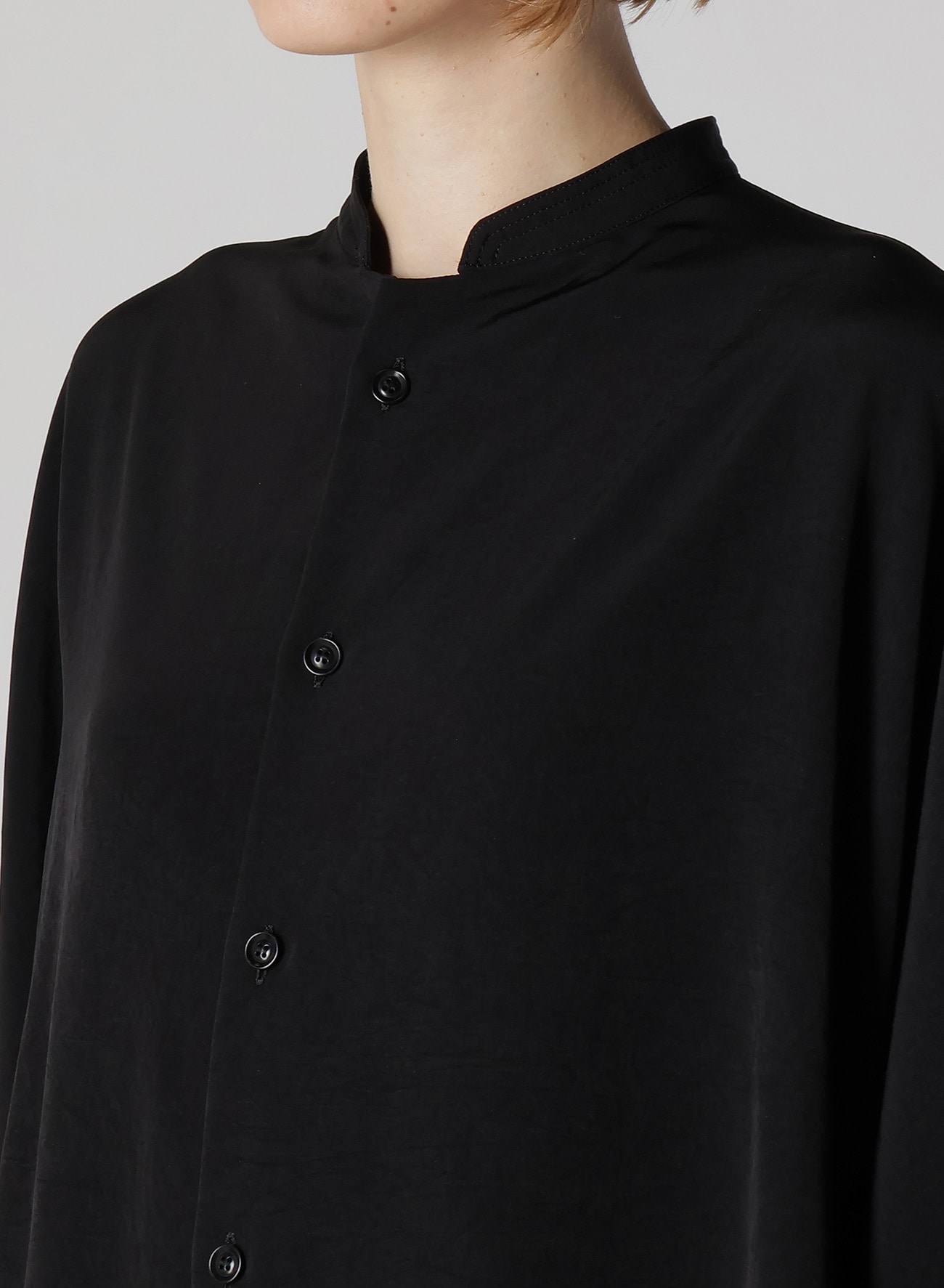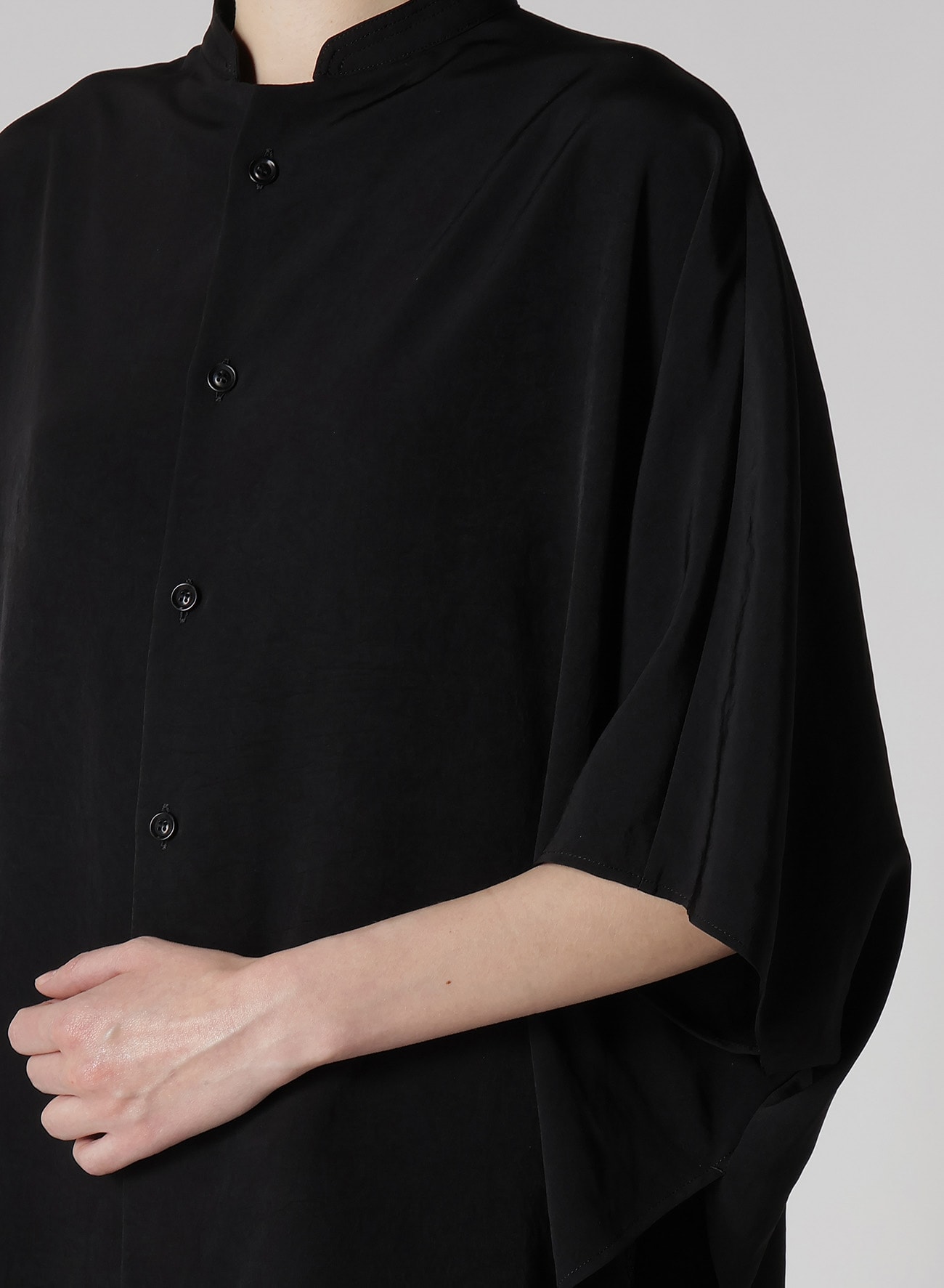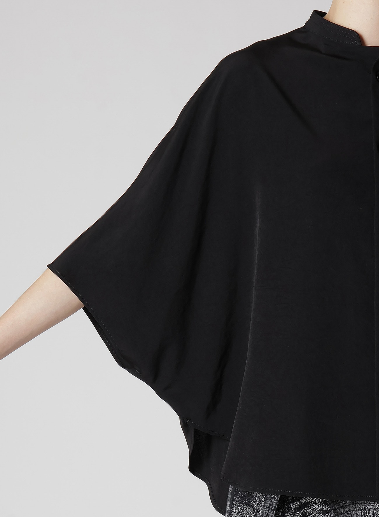 定番人気のトリアセテート・ポリエステルデシン生地を使用したスタンドカラーケープブラウス。マイルドな光沢感と高級感のある生地はシワになりにくく、さらっとした軽い着心地でシーズンを通してお召しいただけます。ゆったりとしたシルエットですが、ドレープ感も相まってすっきりと上品にお召しいただけます。