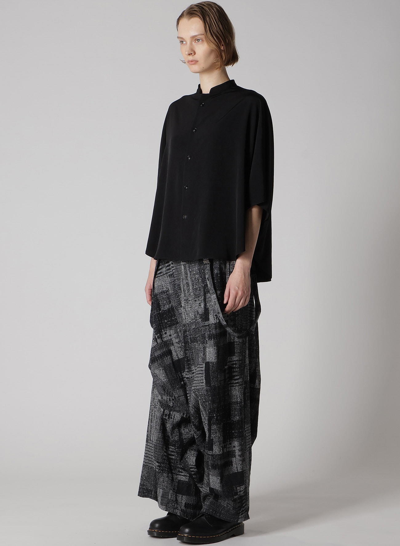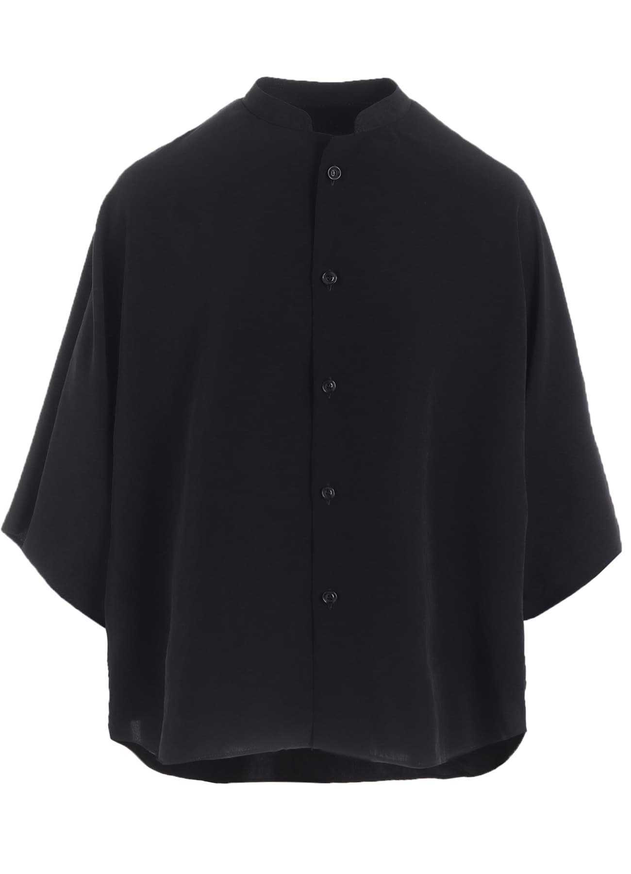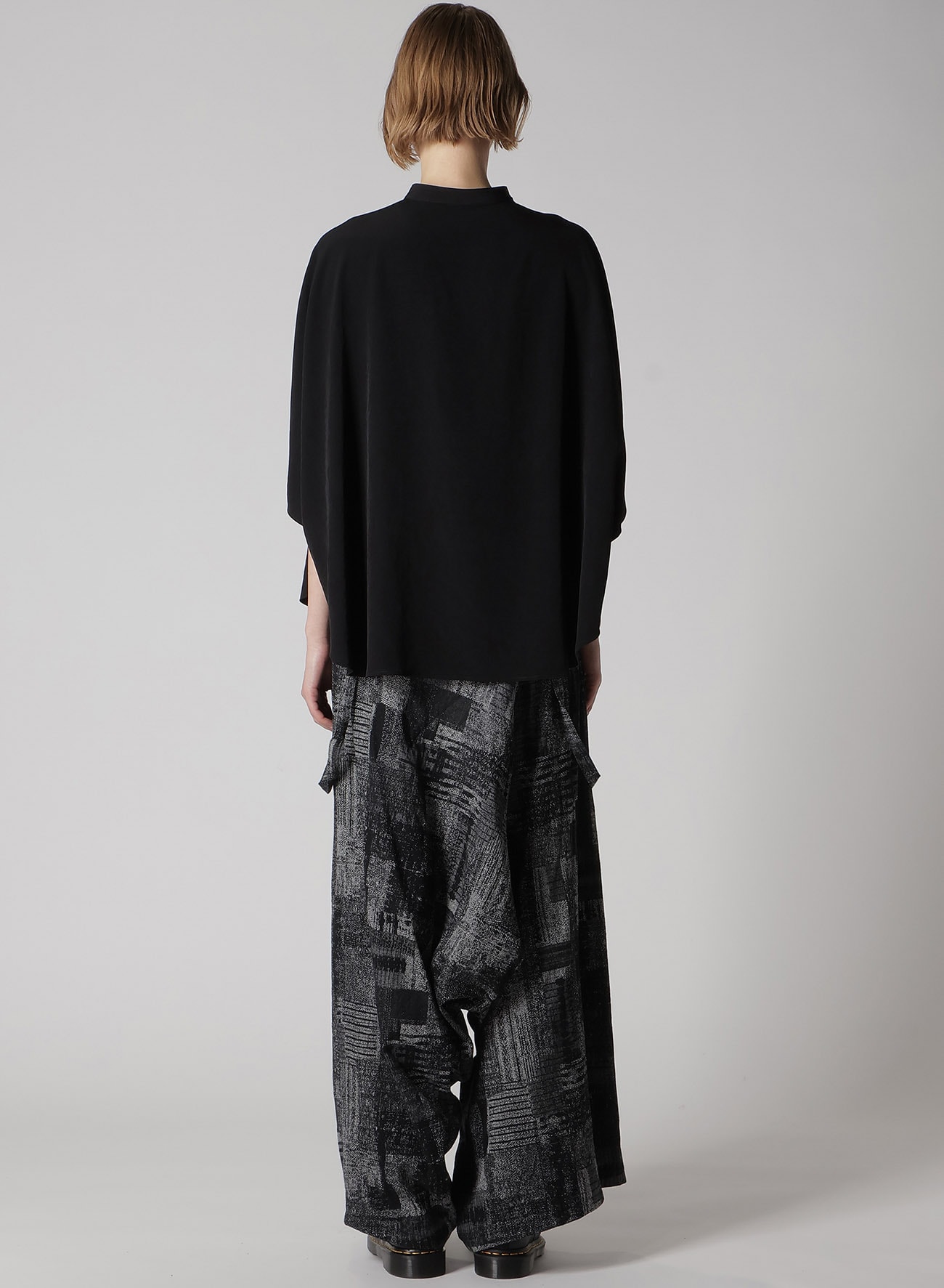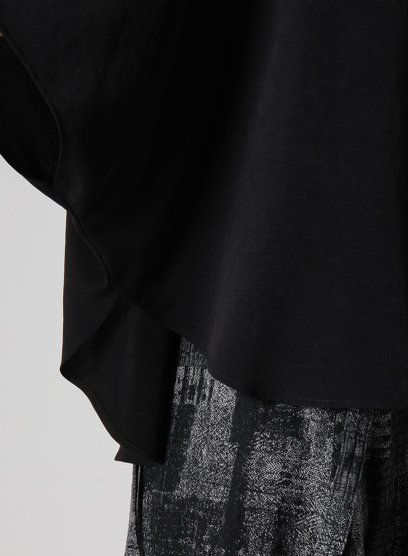 定番人気のトリアセテート・ポリエステルデシン生地を使用したスタンドカラーケープブラウス。マイルドな光沢感と高級感のある生地はシワになりにくく、さらっとした軽い着心地でシーズンを通してお召しいただけます。ゆったりとしたシルエットですが、ドレープ感も相まってすっきりと上品にお召しいただけます。