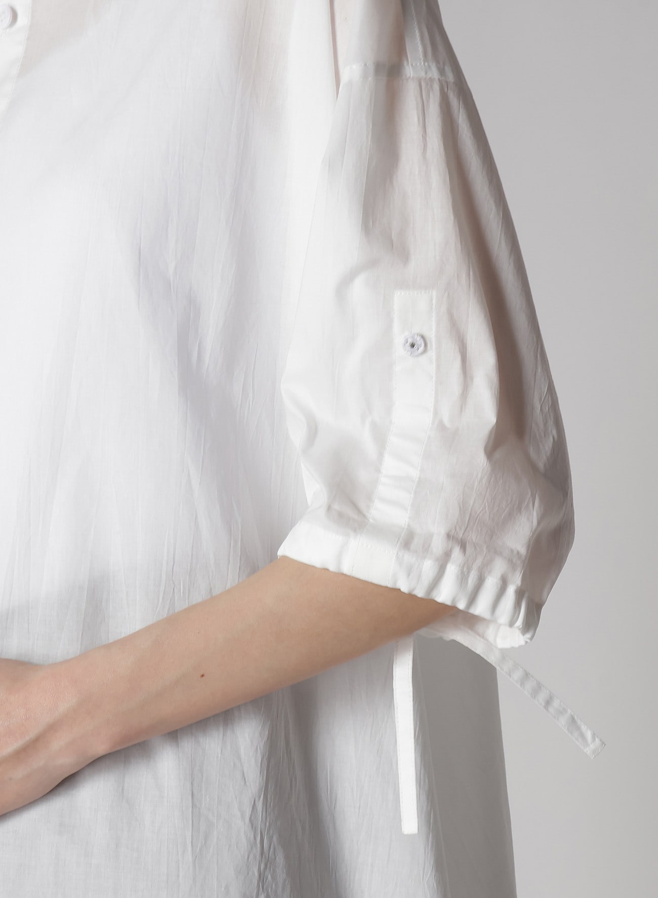 肌触りの良い半袖ロールアップブラウス。繊維が細くて長いインド産の希少な超長綿を使用し、しなやかで柔らかい質感に仕上げています。袖口の紐を結びロールアップすることで、ふわっとした袖口に。?程よく光沢があり、カジュアルになり過ぎず上品にお召しいただけけます。