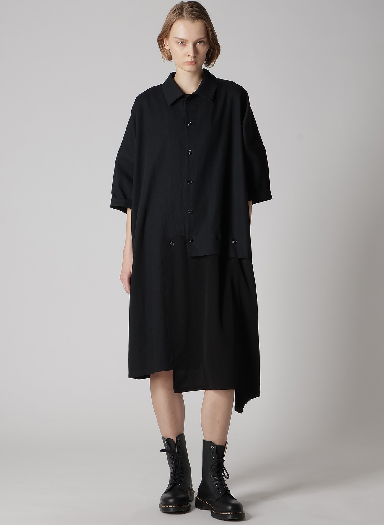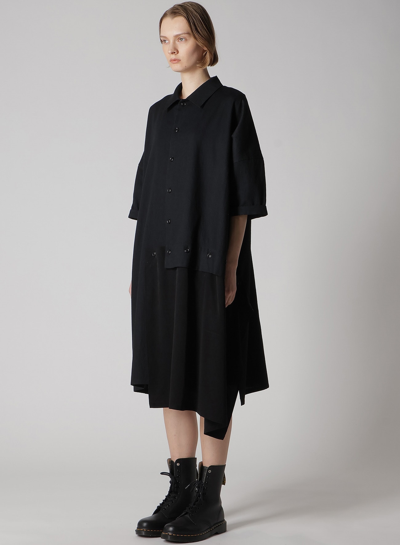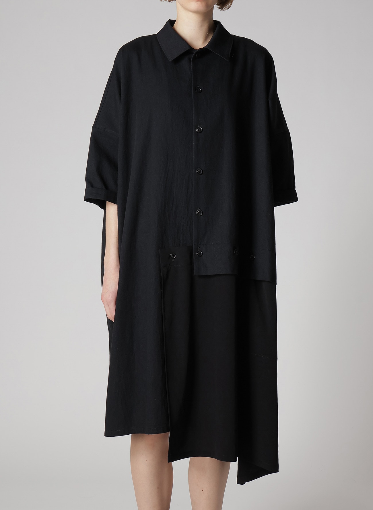 ルーズに織り上げた柔らかな風合いが特徴のデニムに定番素材のデシンを組み合わせた半袖ドレス。デニム部分は特殊な染色により経年変化を楽しめる素材に。肩のラインを落としたゆったりとデザイン。袖口の見返しは折り返してお召しいただくのがおすすめです。左裾は自由にボタンを外してお召しいただけます。