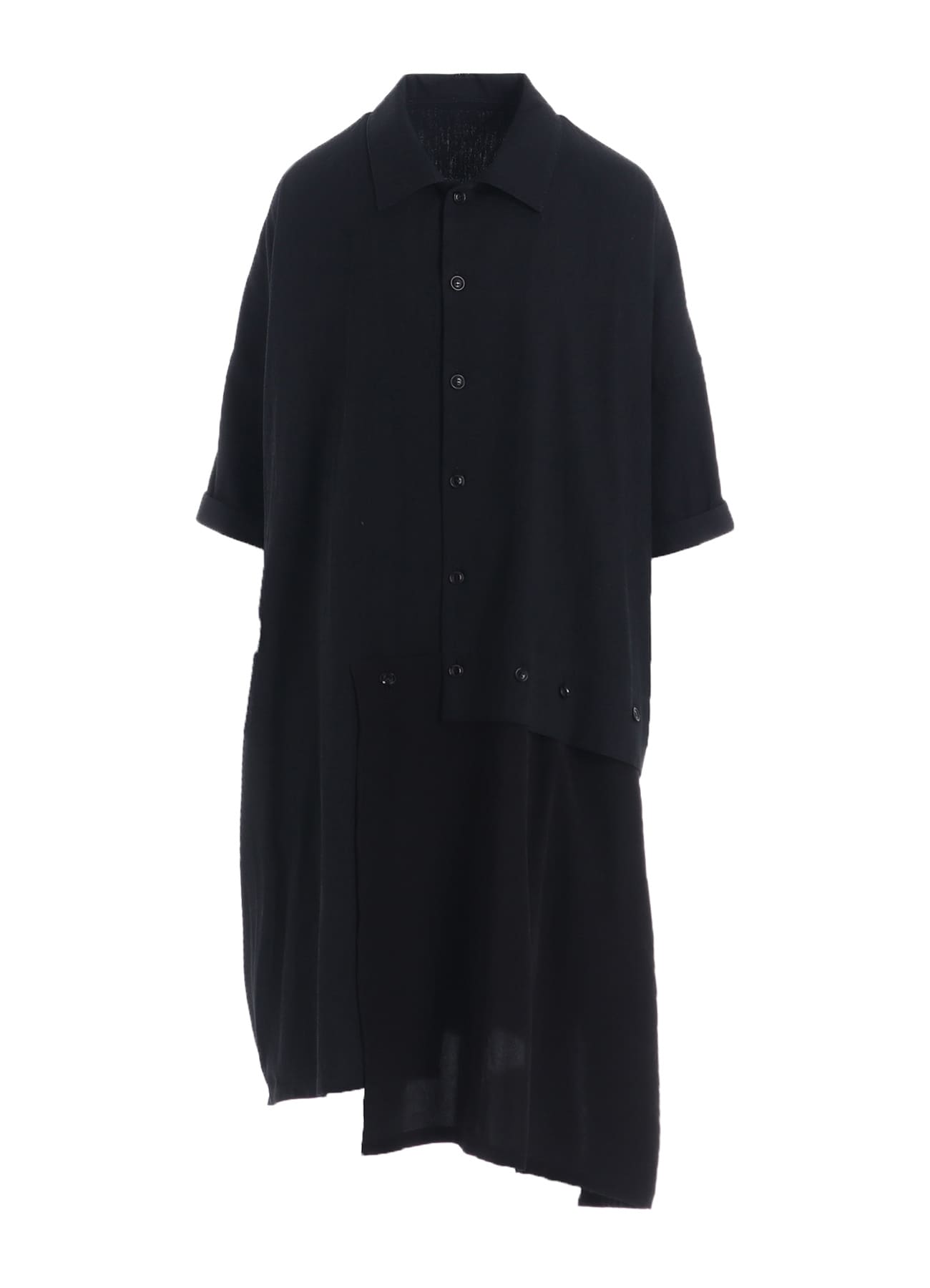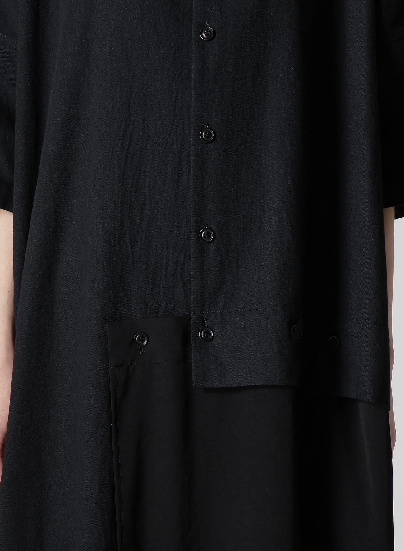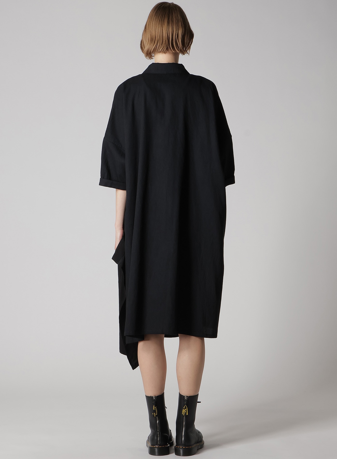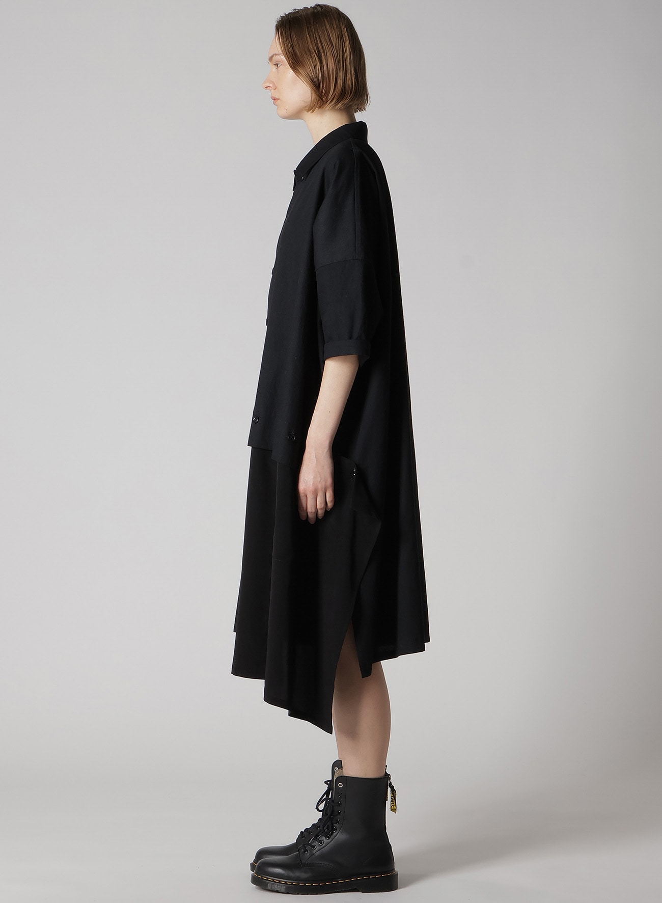 ルーズに織り上げた柔らかな風合いが特徴のデニムに定番素材のデシンを組み合わせた半袖ドレス。デニム部分は特殊な染色により経年変化を楽しめる素材に。肩のラインを落としたゆったりとデザイン。袖口の見返しは折り返してお召しいただくのがおすすめです。左裾は自由にボタンを外してお召しいただけます。
