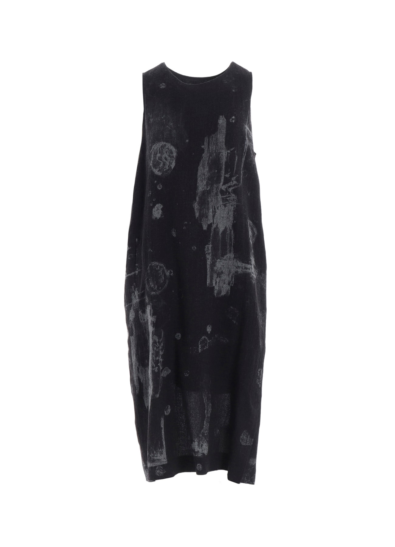 滲んだドットが特徴的なノースリーブトレス。薄手ながらざっくりとあたたかみのある素材にインクジェットプリントを行っています。上から下に流れるような勢いのあるペイントと、インクが落ちてにじむようなドットをリズミカルに表現した柄です。ハイネックのニットや、ロングの羽織と相性のよいアイテム。過度な引っ張りを受けると縫い目が開くことがありますので、お取り扱いにはご注意ください。