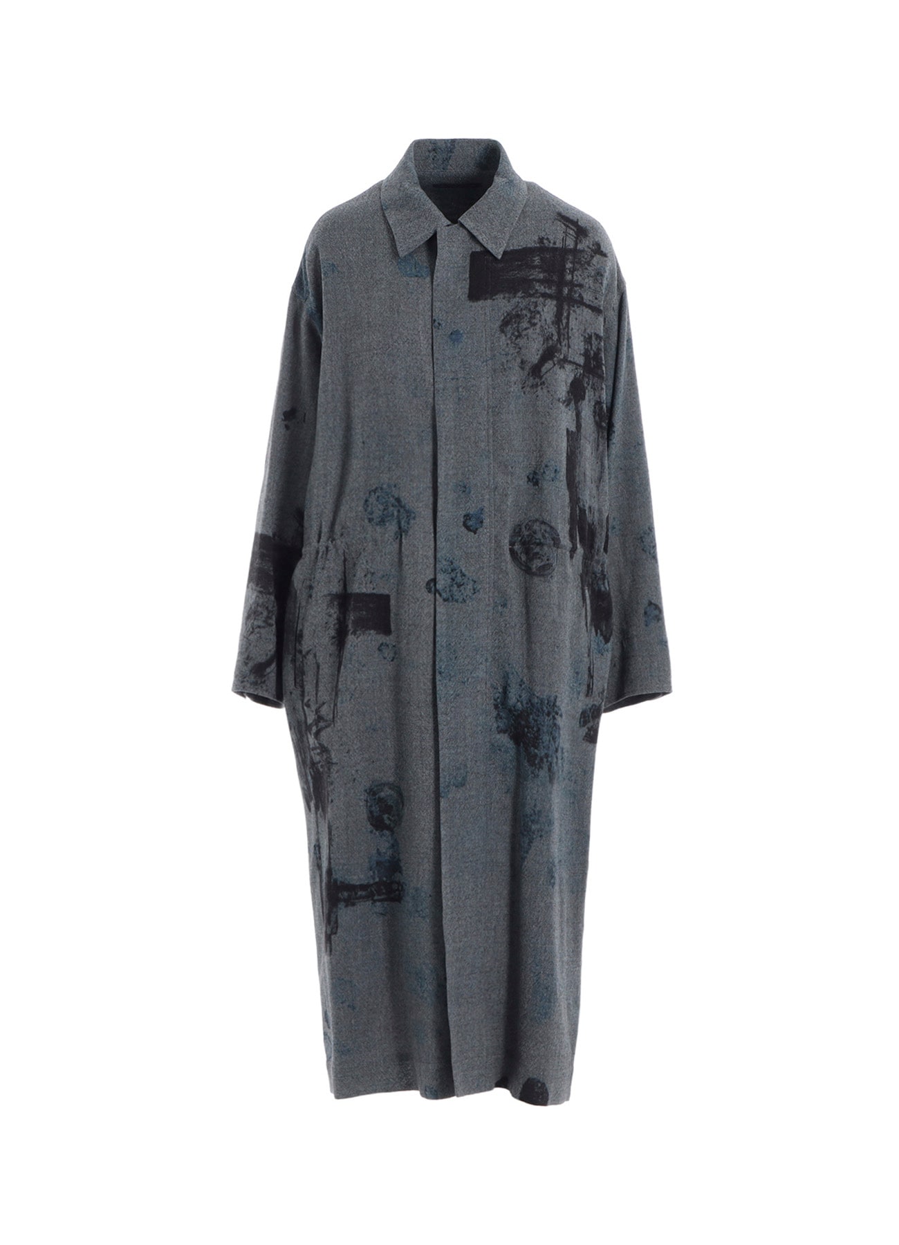 滲んだドットが特徴的なウエストドレス。薄手ながらざっくりとあたたかみのある素材にインクジェットプリントを行っています。上から下に流れるような勢いのあるペイントと、インクが落ちてにじむようなドットをリズミカルに表現した柄です。ウエストの紐を絞ることで、着丈やシルエットの変化を楽しめます。アウターとしても活用できます。過度な引っ張りを受けると縫い目が開くことがありますので、お取り扱いにはご注意ください。