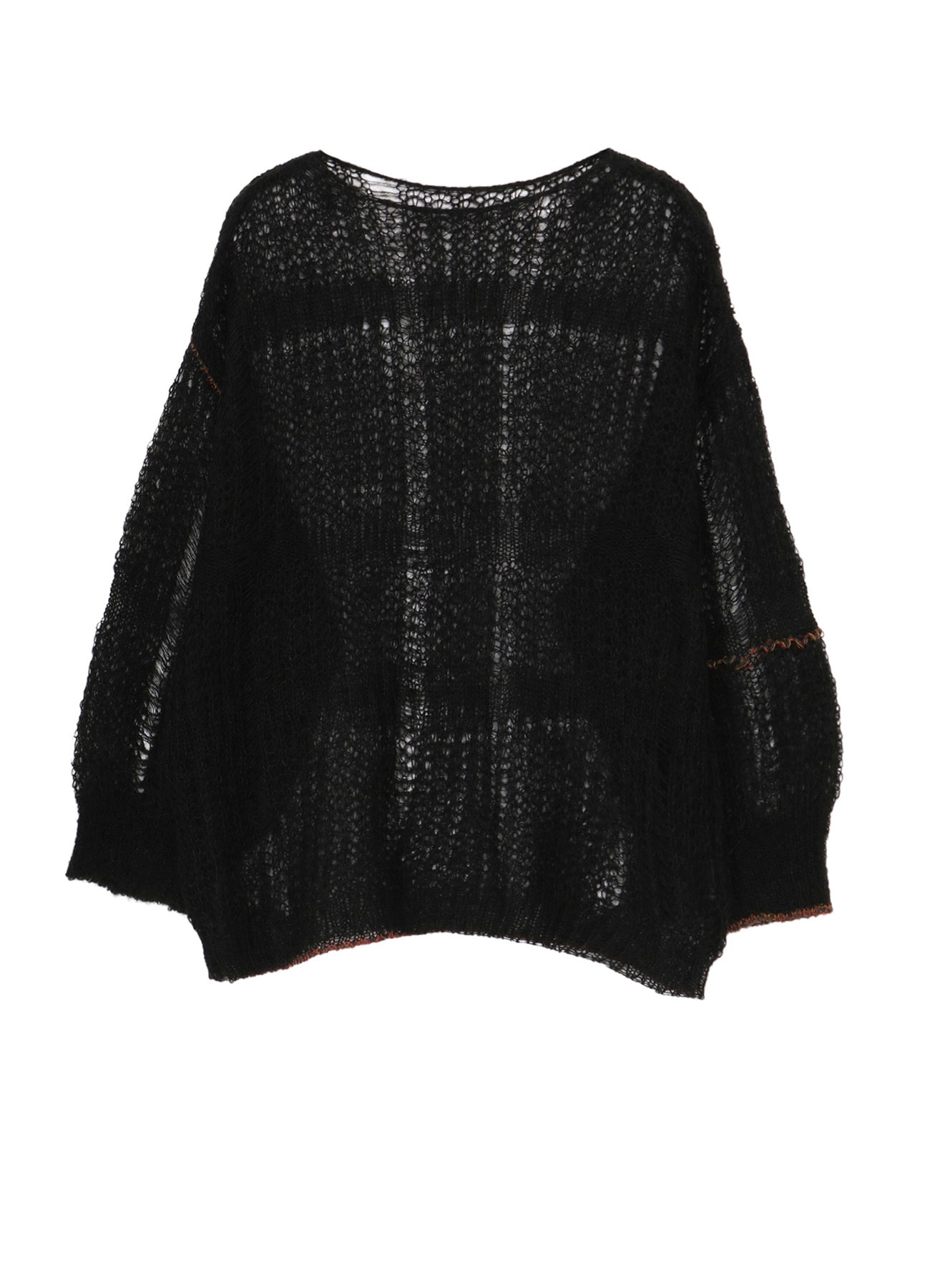 ボートネックのゆったりとしたプルオーバーニット。モヘヤ混素材を透け感を重視してざっくりとしたチェック柄にした編地を使用。別素材で細い配色を効かせたデザインです。