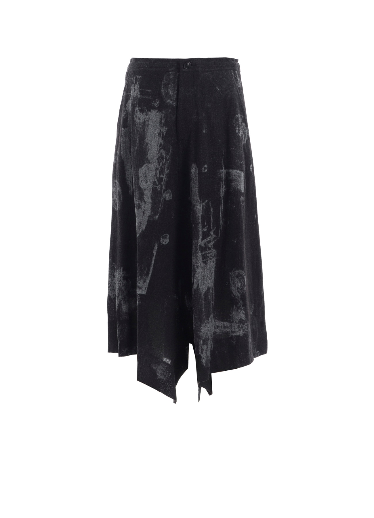 滲んだドットが特徴的な右裾スリットパンツ。薄手ながらざっくりとあたたかみのある素材にインクジェットプリントを行っています。上から下に流れるような勢いのあるペイントと、インクが落ちてにじむようなドットをリズミカルに表現した柄です。サイドが短めで、中心が長くなるシルエットですので、ブーツやカラーソックスとのコーディネイトがおすすめです。過度な引っ張りを受けると縫い目が開くことがありますので、お取り扱いにはご注意ください。