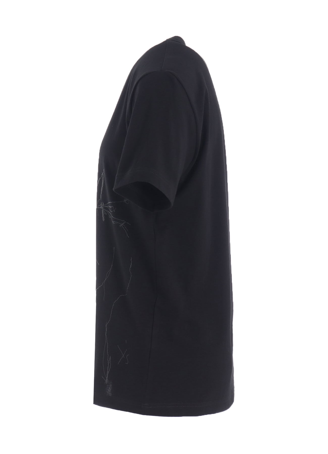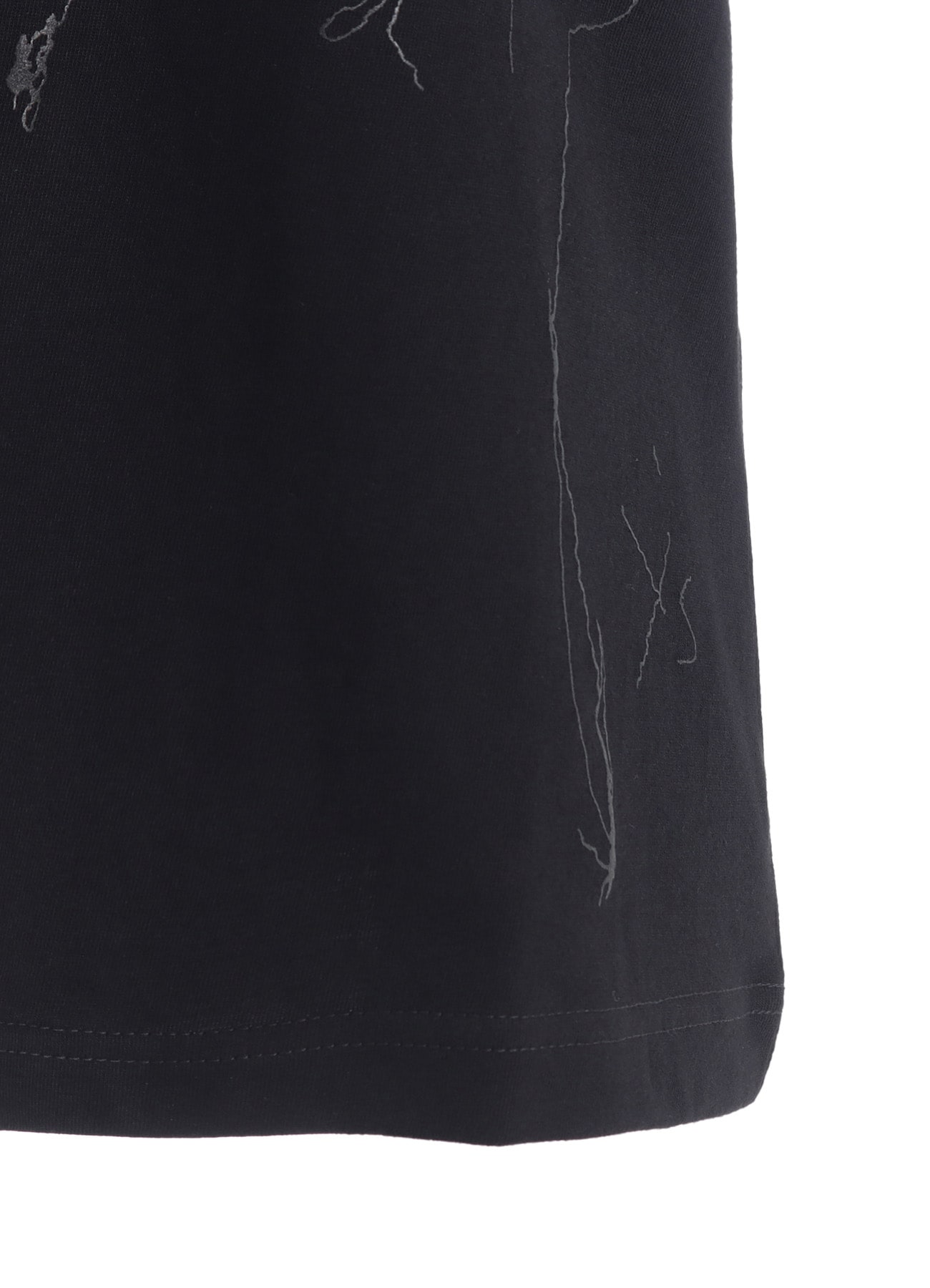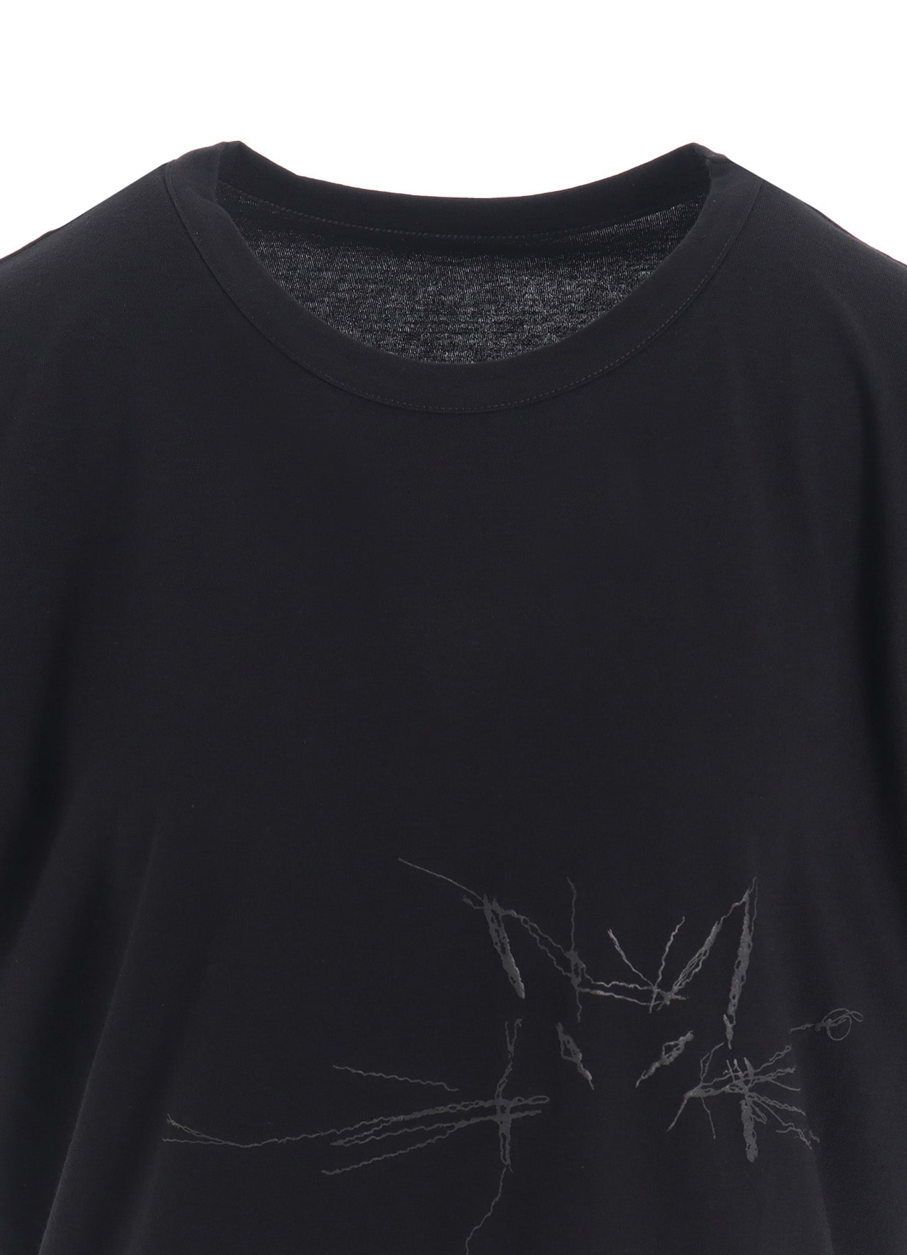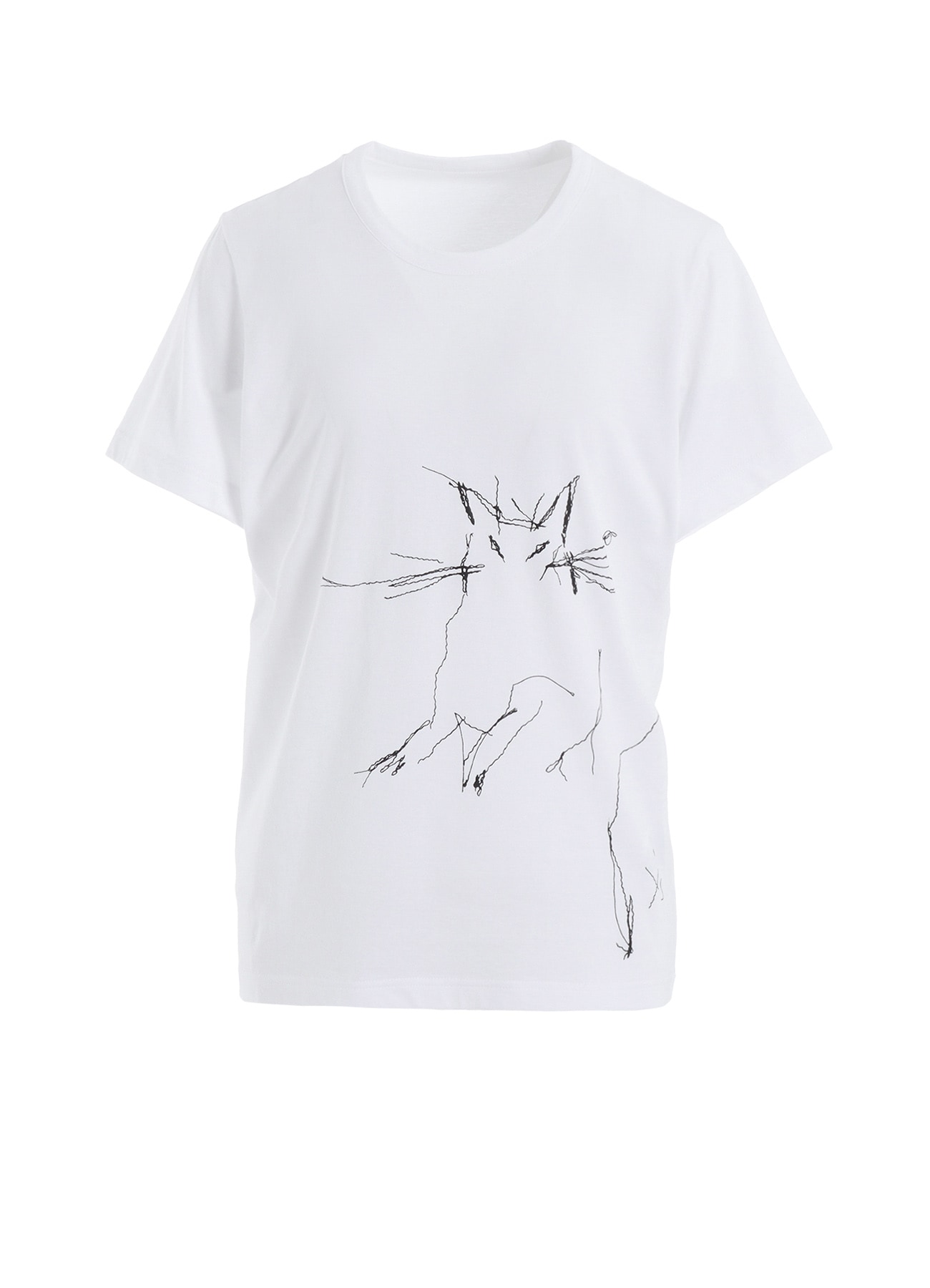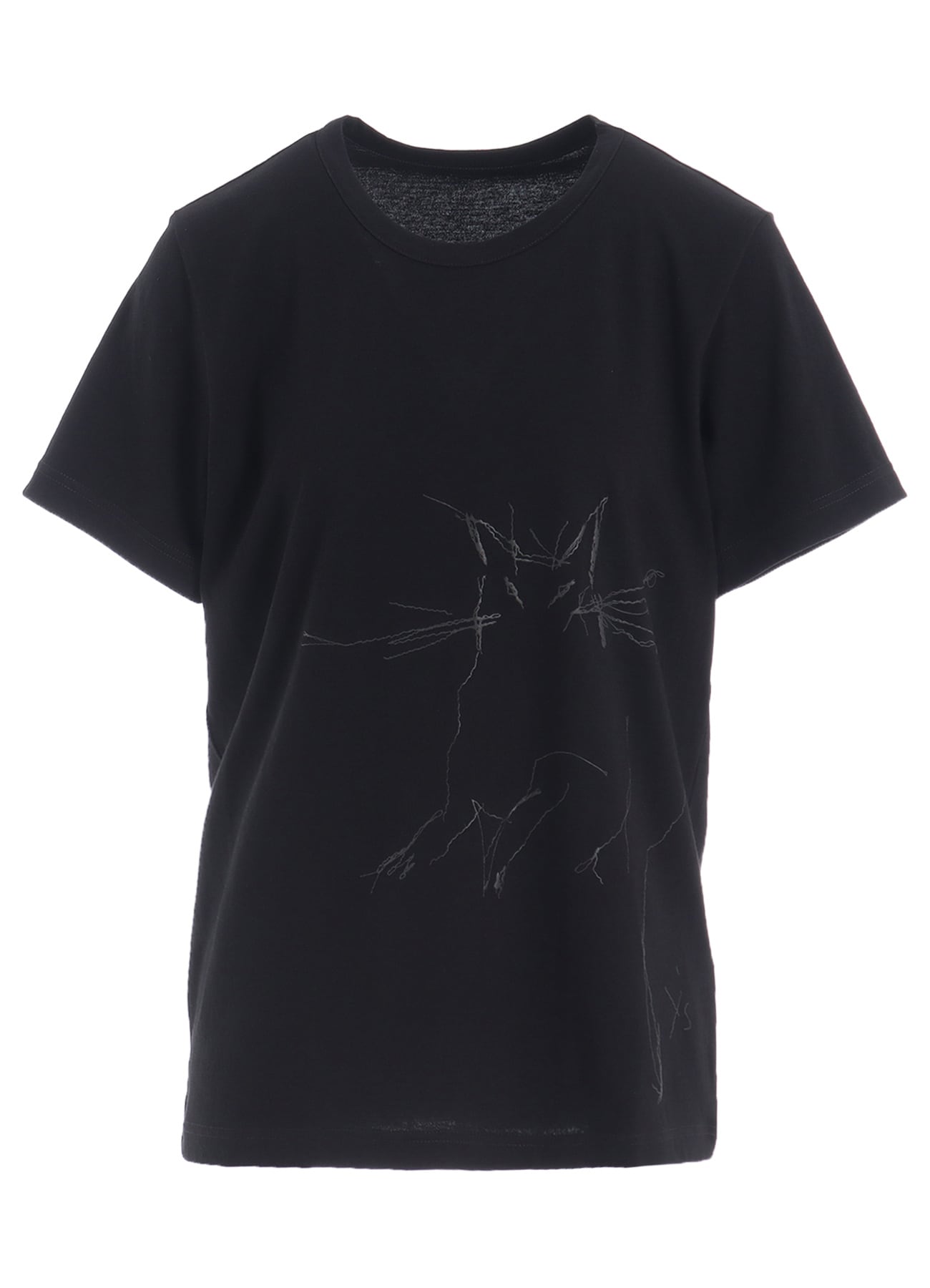 刺繍のように見える発泡プリントが個性的なカットソー。Y'sで定番的に使用している丸首半袖Tシャツに、デッサン画のようなラフなタッチのネコとY'sの文字がさりげなくプリントされています。シンプルですっきりとしたシルエットのため、ボリュームのあるボトムスとあわせてメリハリのあるコーディネイトにおすすめです。
