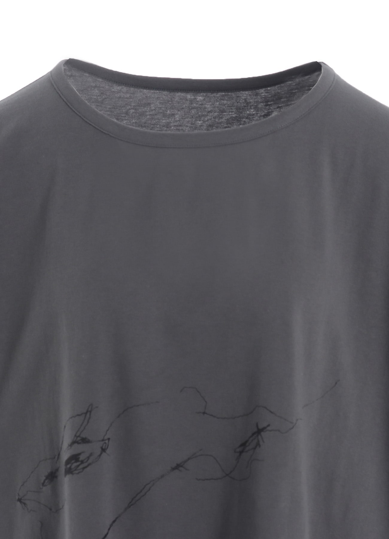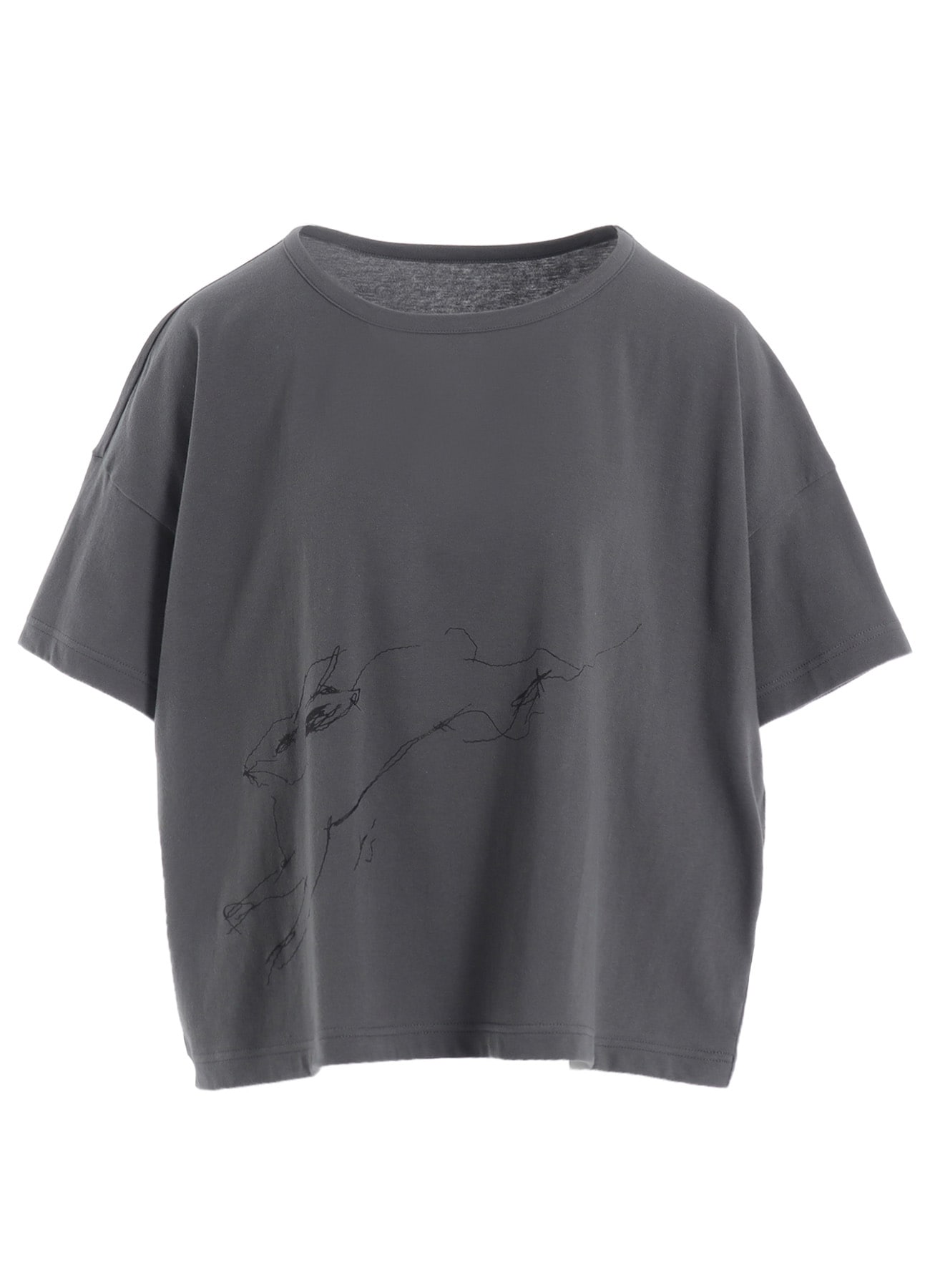 刺繍のように見える発泡プリントが個性的なカットソー。Y'sで定番的に使用している幅広サイズのショート丈半袖Tシャツに、デッサン画のような躍動感のあるウサギとY'sの文字がさりげなくプリントされています。やや長めの半袖で着やすく、スカート、パンツのボトムスどちらにもコーディネイトしやすいバランスの良い着丈です。