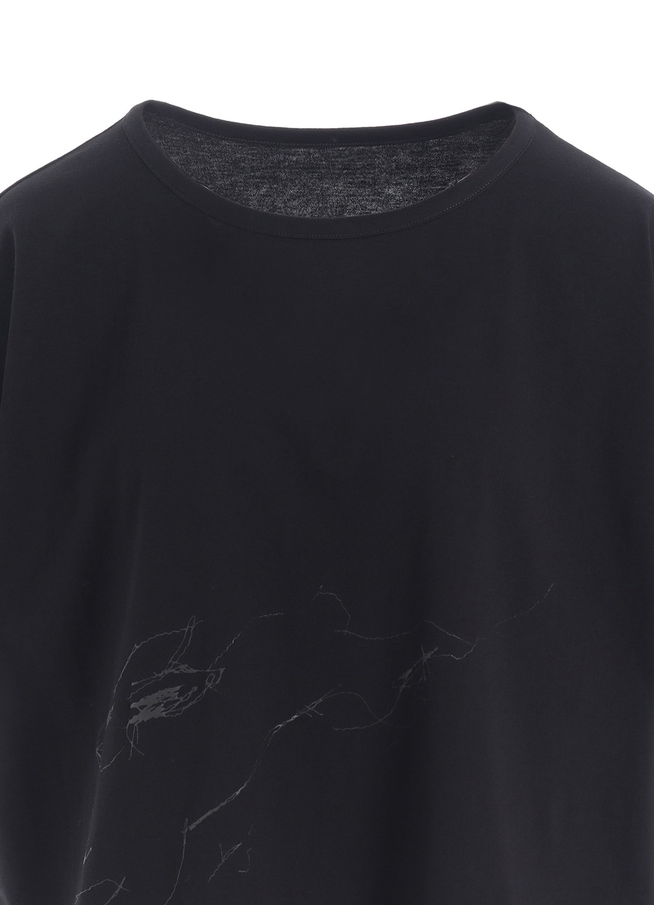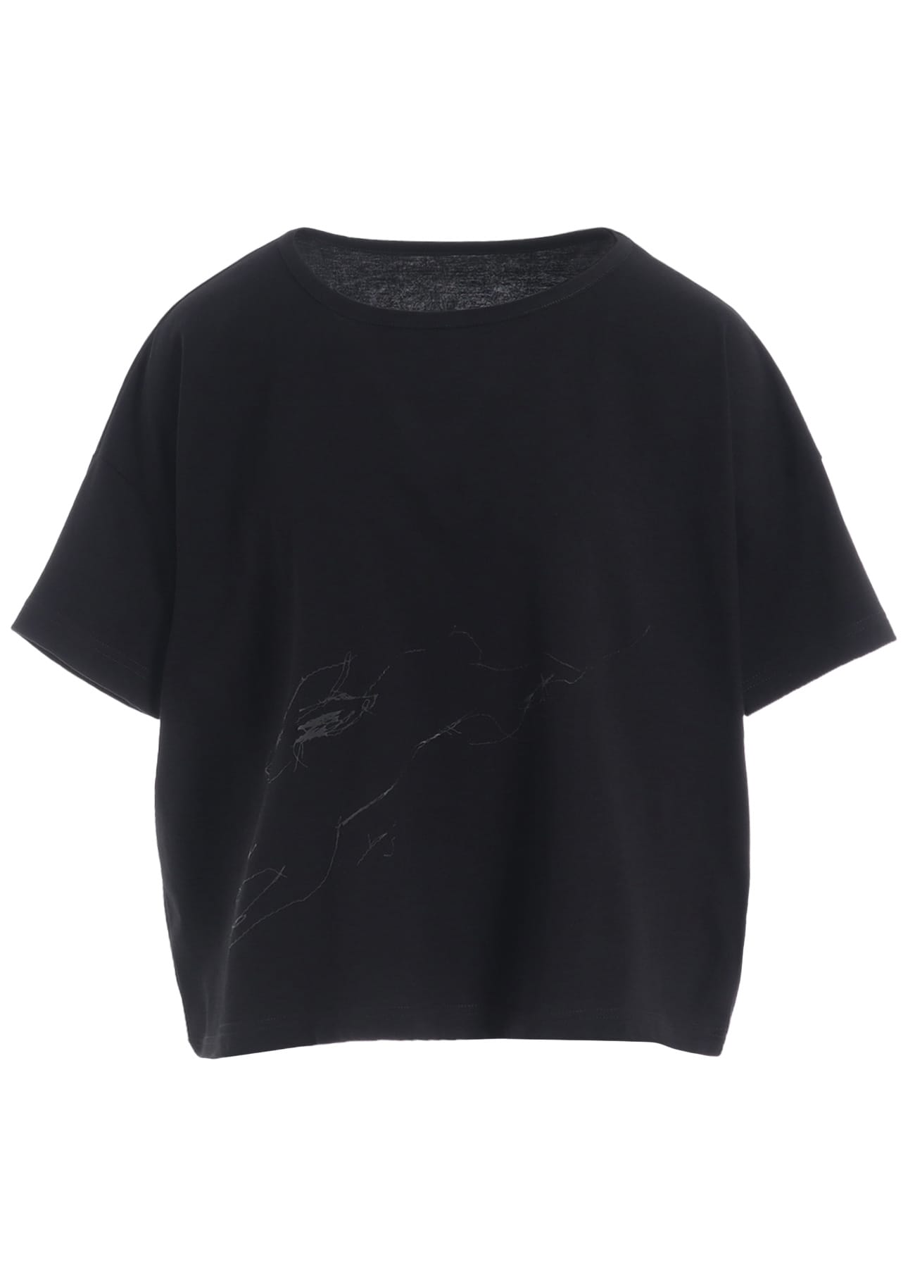 刺繍のように見える発泡プリントが個性的なカットソー。Y'sで定番的に使用している幅広サイズのショート丈半袖Tシャツに、デッサン画のような躍動感のあるウサギとY'sの文字がさりげなくプリントされています。やや長めの半袖で着やすく、スカート、パンツのボトムスどちらにもコーディネイトしやすいバランスの良い着丈です。