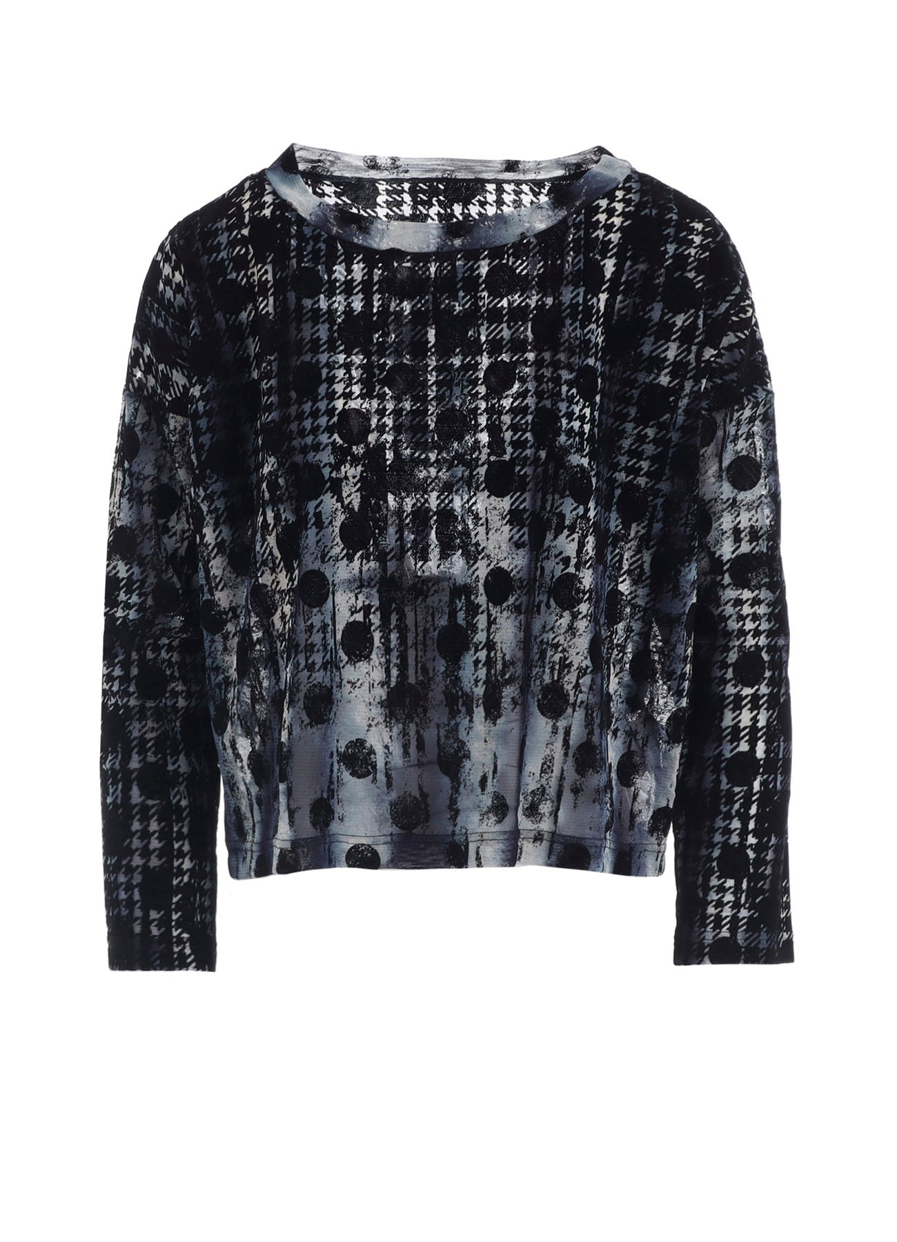 ショート丈丸首長袖カットソー。滲んだストライプ柄プリントチュールの上に、千鳥水玉柄がだんだんと擦れていくようにフロッキープリントの生地を使用しています。様々なコーディネートに合わせてバランス良くお召しいただけます。