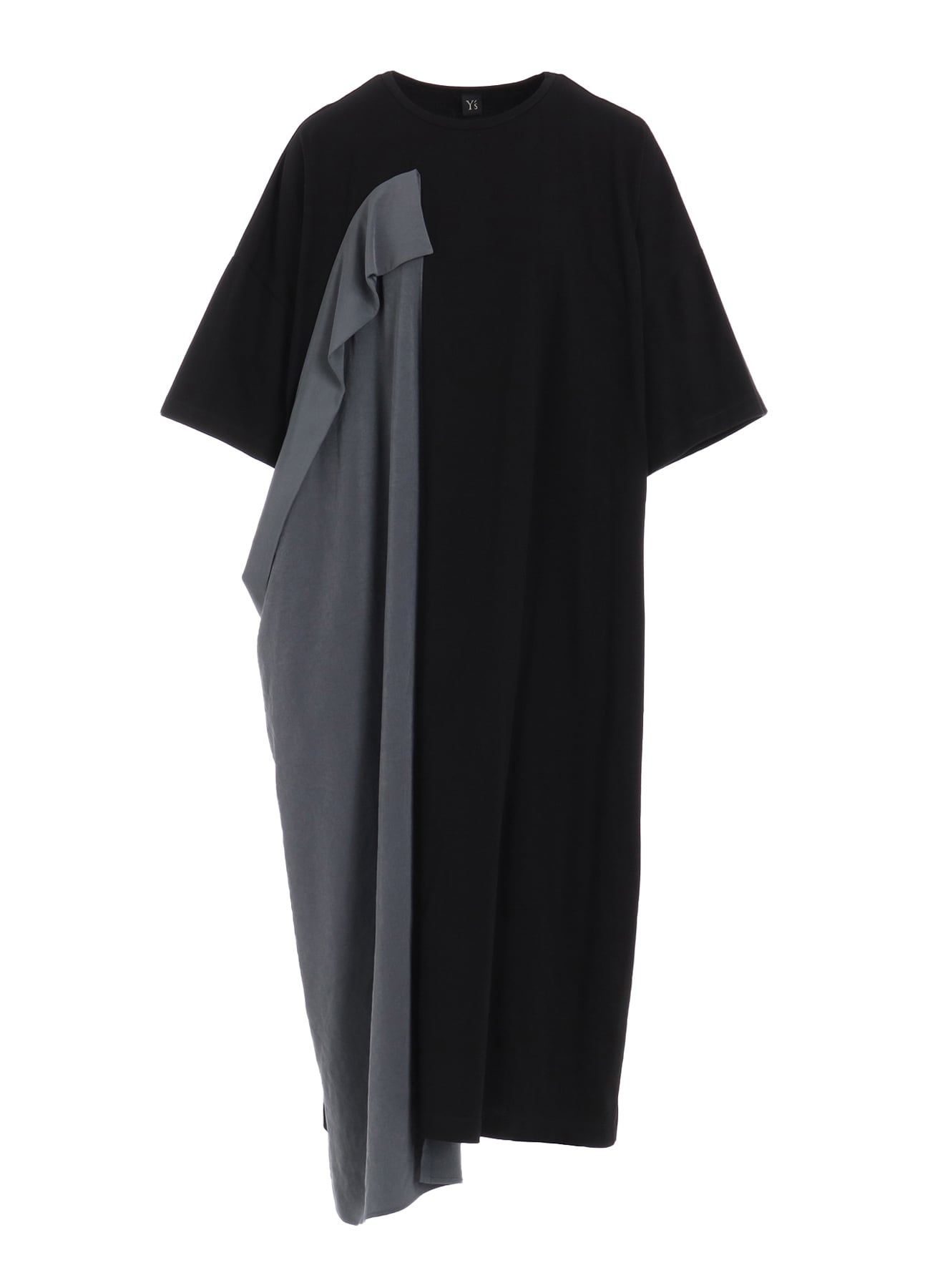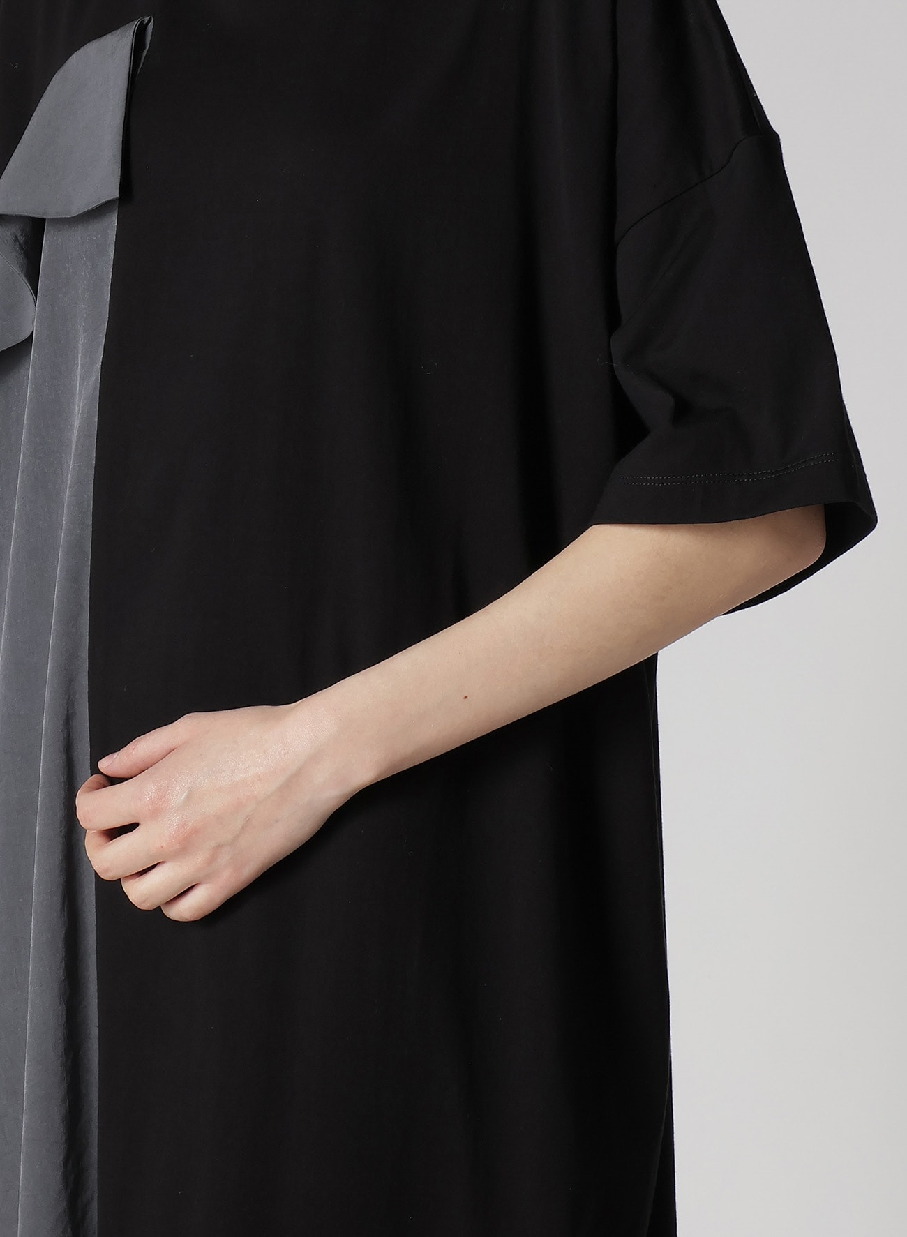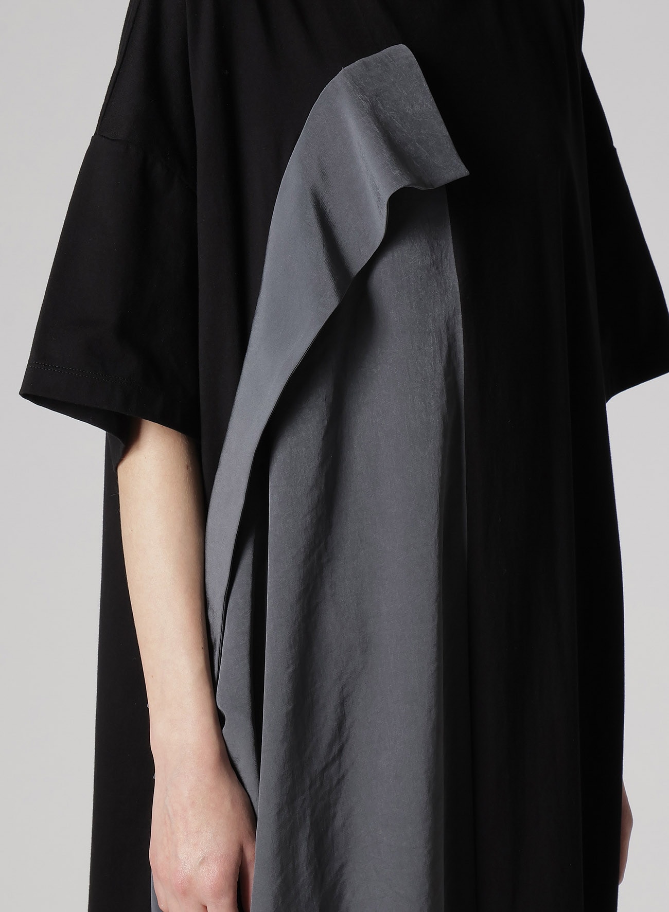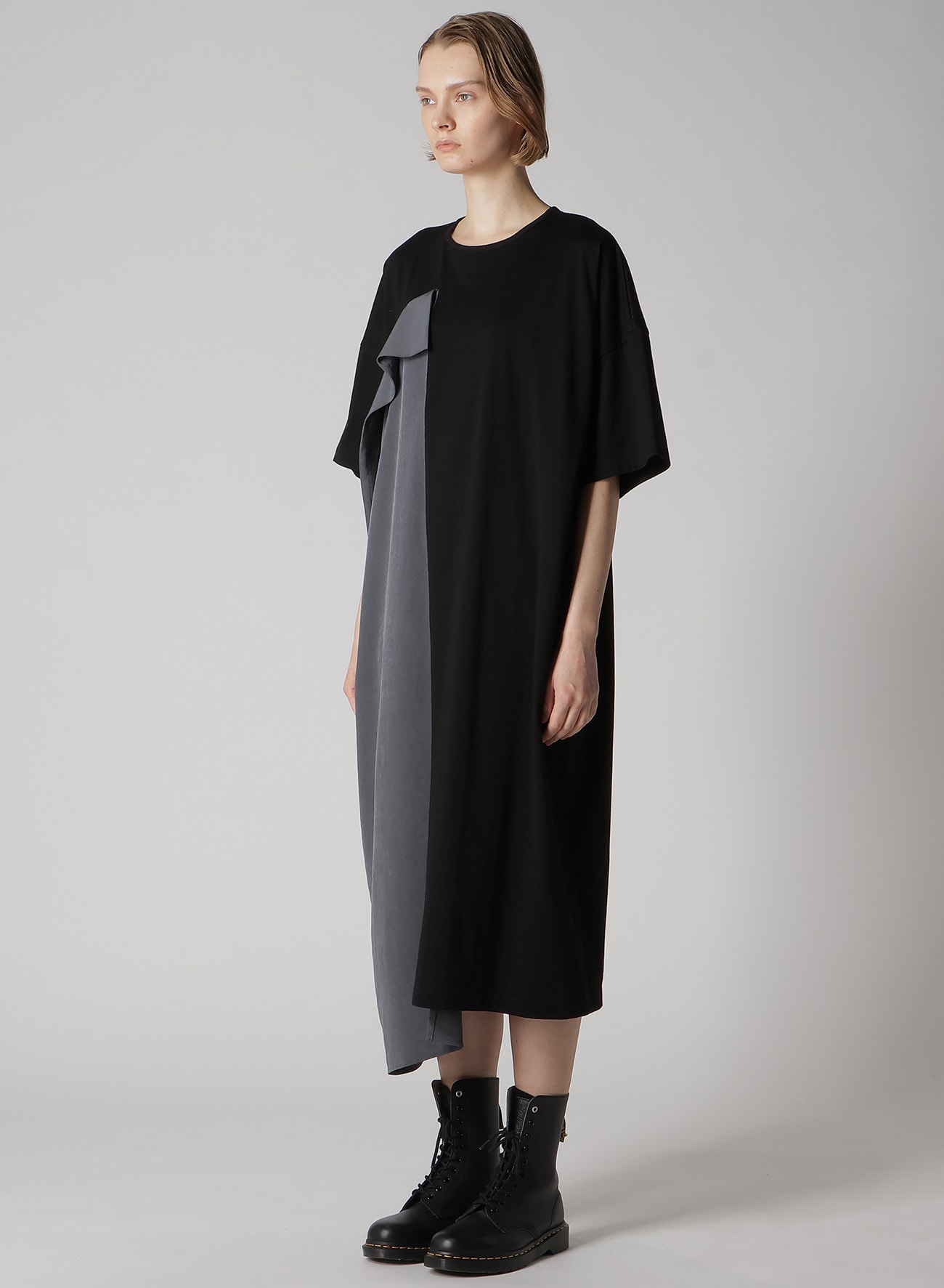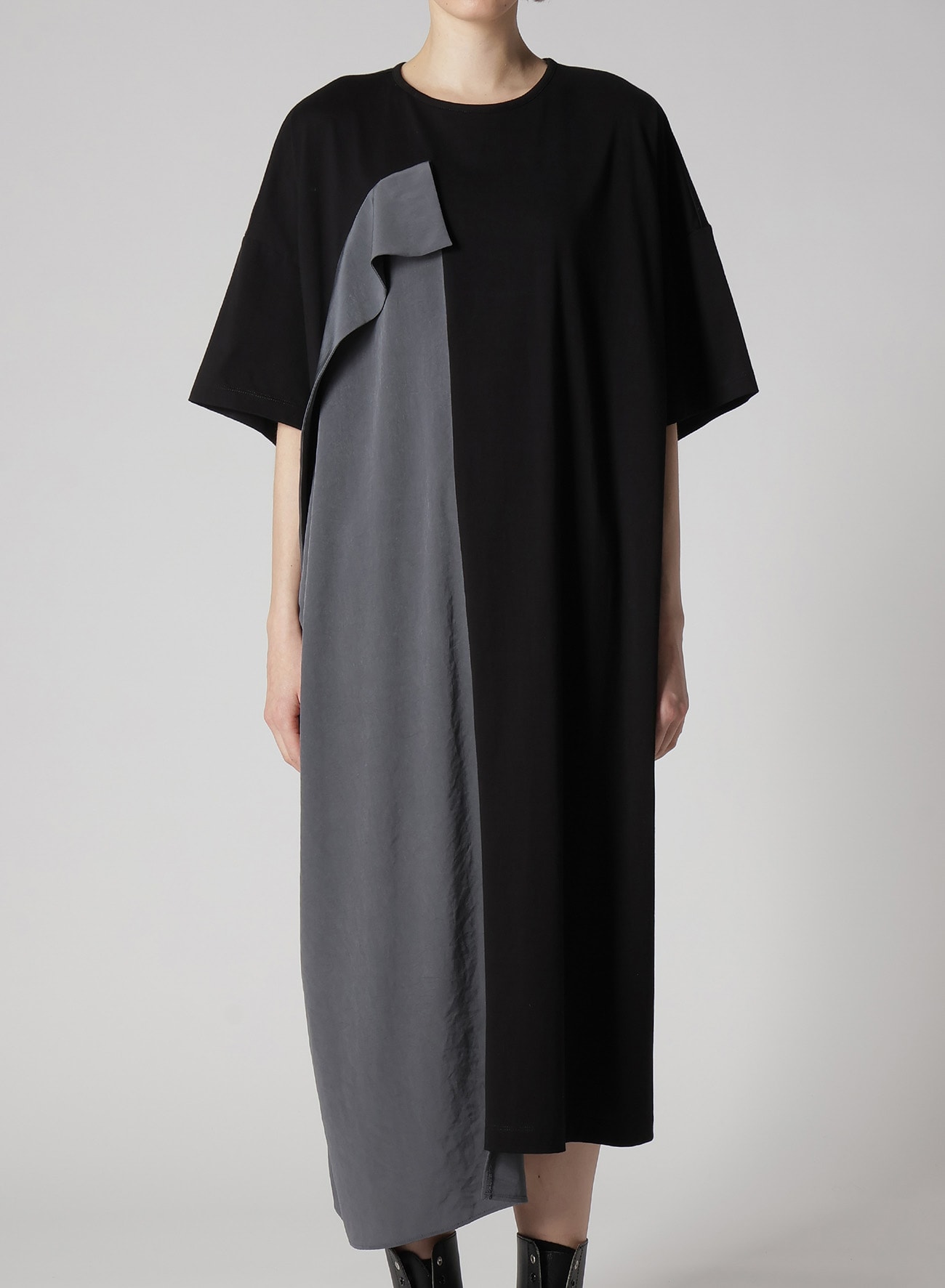 カットソー生地に定番人気のトリアセテート・ポリエステルデシンを組み合わせたワンピース。カジュアルなビッグシルエットの半袖ワンピースをベースに、柔らかな光沢感のある生地をプラスすることで変化のあるデザインをお楽しみいただけます。