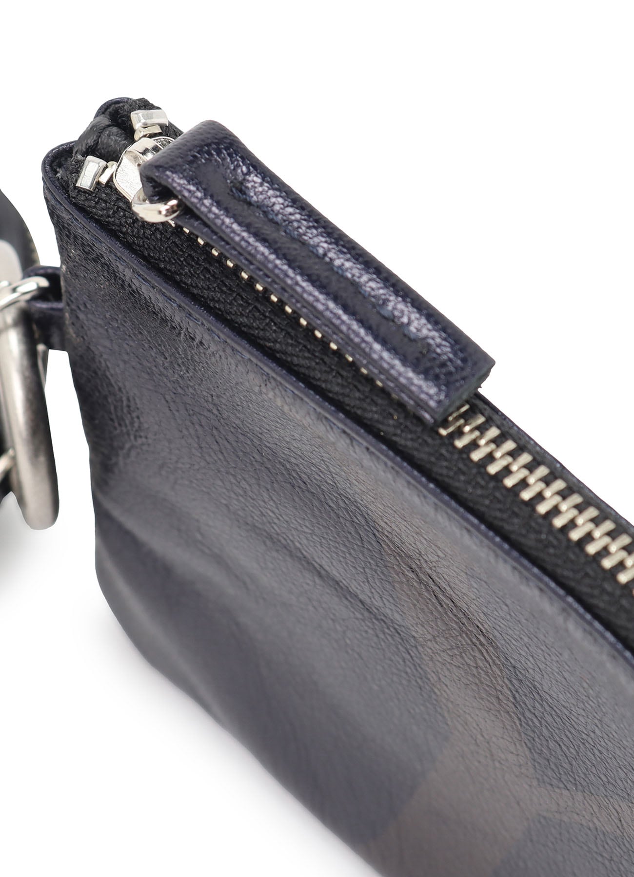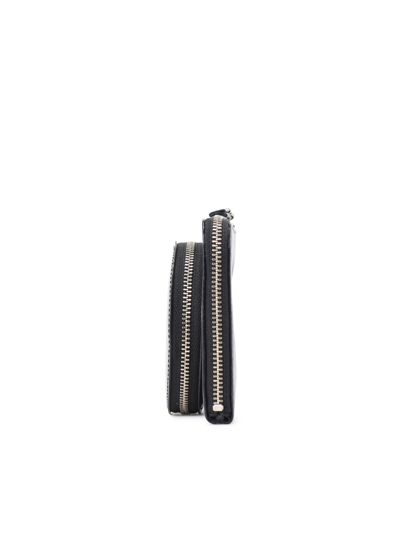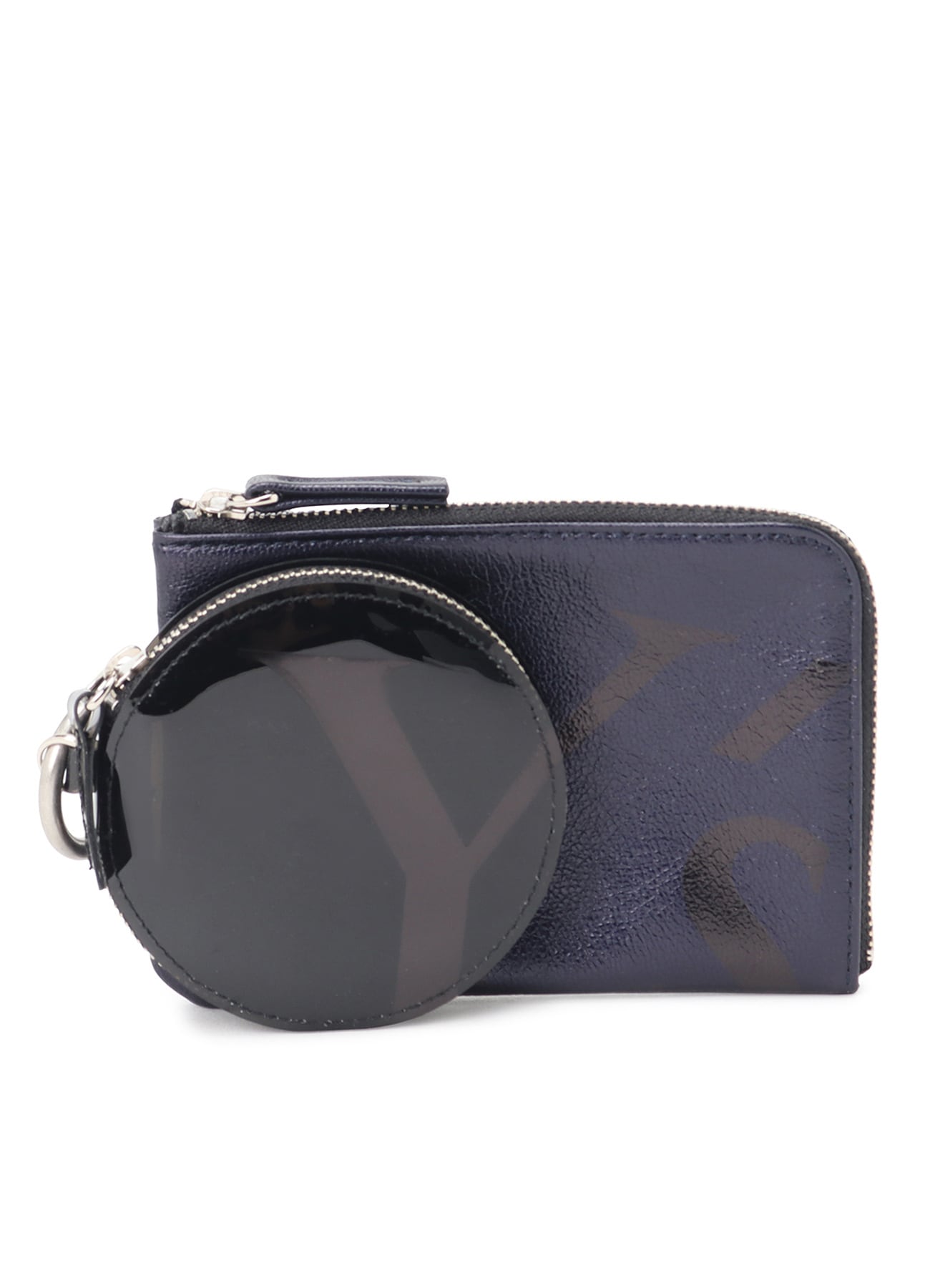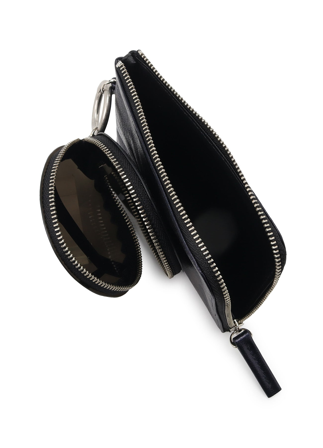 PVC素材とレザーの二連ポーチ。カラビナが付いており、お手持ちのバッグに付けていただくことも可能。異なる素材の組み合わせがユニークで、小物の収納に便利なアイテムです。
