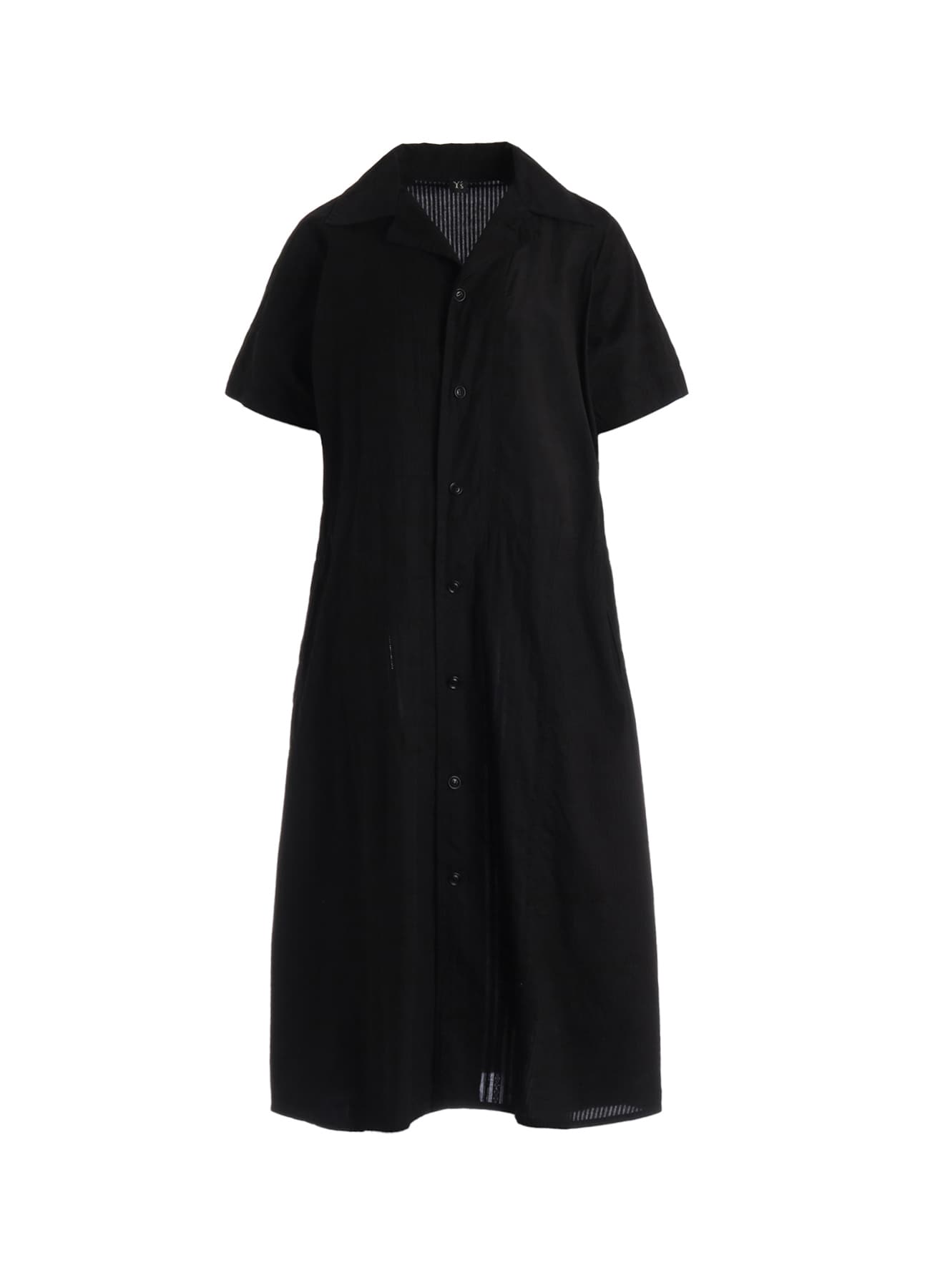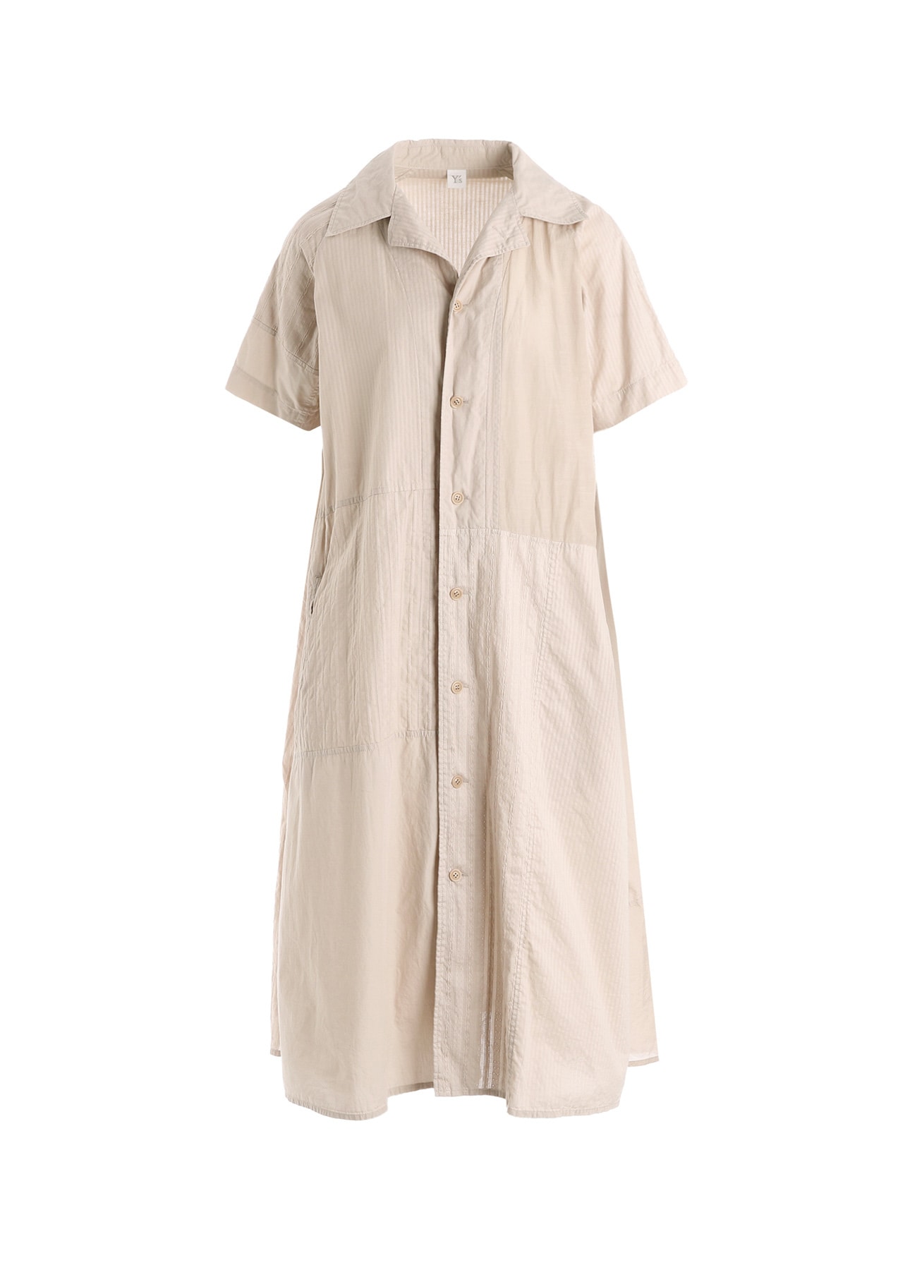 異なる素材をパッチワークしたロングドレス。5種類の違う素材を製品で染め上げることで素材毎の染まり方に違いが見えるのがポイント。袖部分をロールアップしてお召しいただくのがおすすめ。
