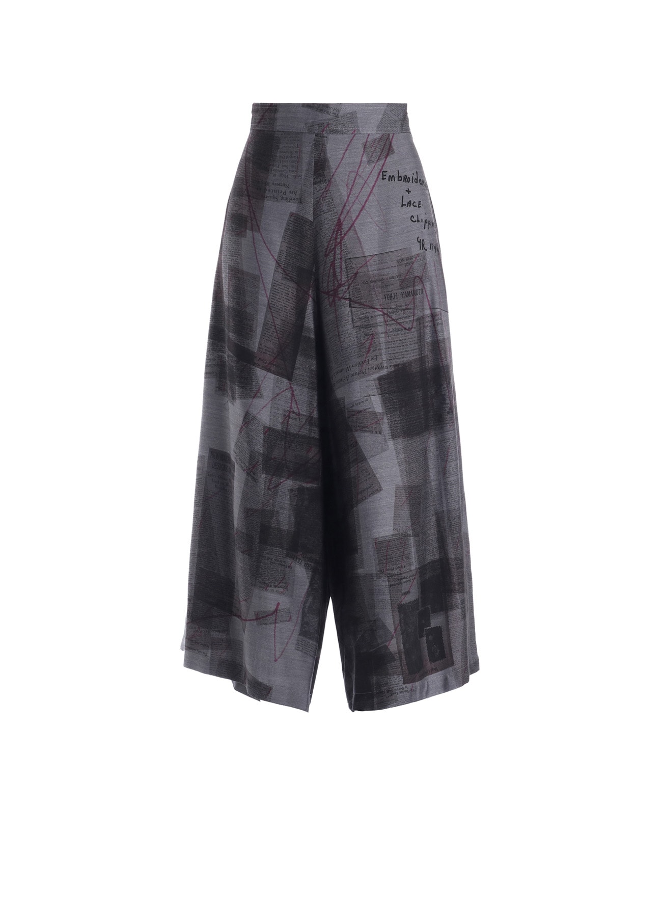 キュプラ素材のパンツ。光沢感のある風合いがポイント。1980年代の新聞スクラップをモチーフとした柄には、yohjiyamamotoの文字が隠れています。ウエストは紐でサイズ調整が可能です。