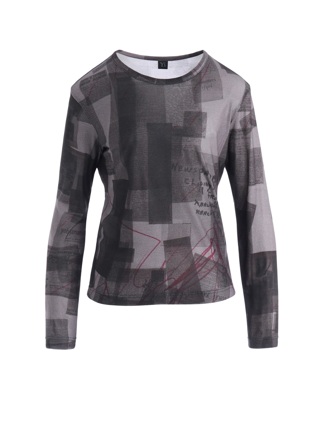 肌触りの良い生地を使用した丸首の長袖カットソー。1980年代の新聞スクラップをモチーフとした柄には、yohjiyamamotoの文字が隠れています。