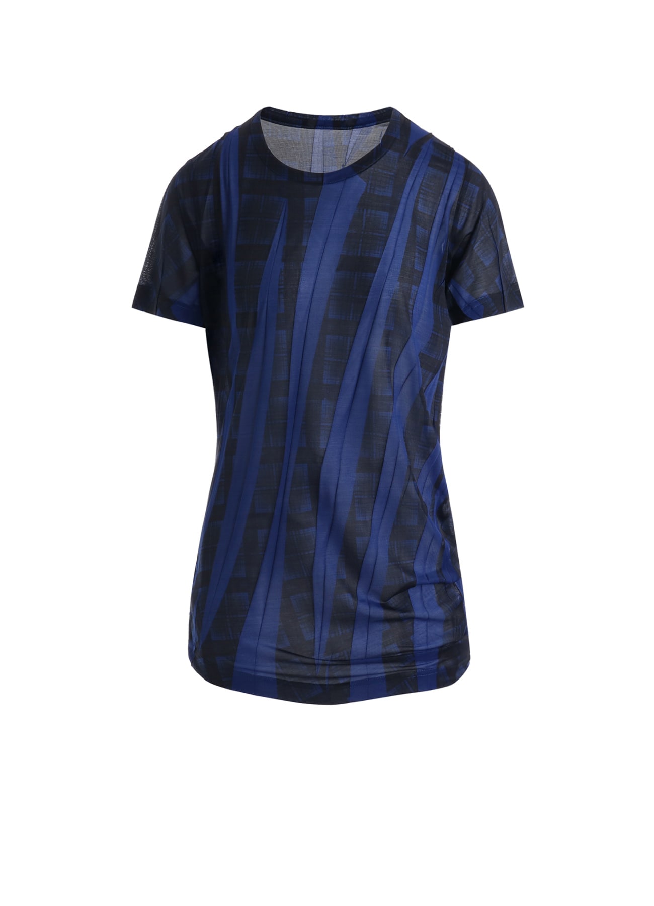 半袖カットソー。シワ加工でプリーツを付けた生地を、そのまま畳んだ状態で転写プリントをすることで柄がランダムに現れています。サイドがくしゅくしゅとしたシルエット。