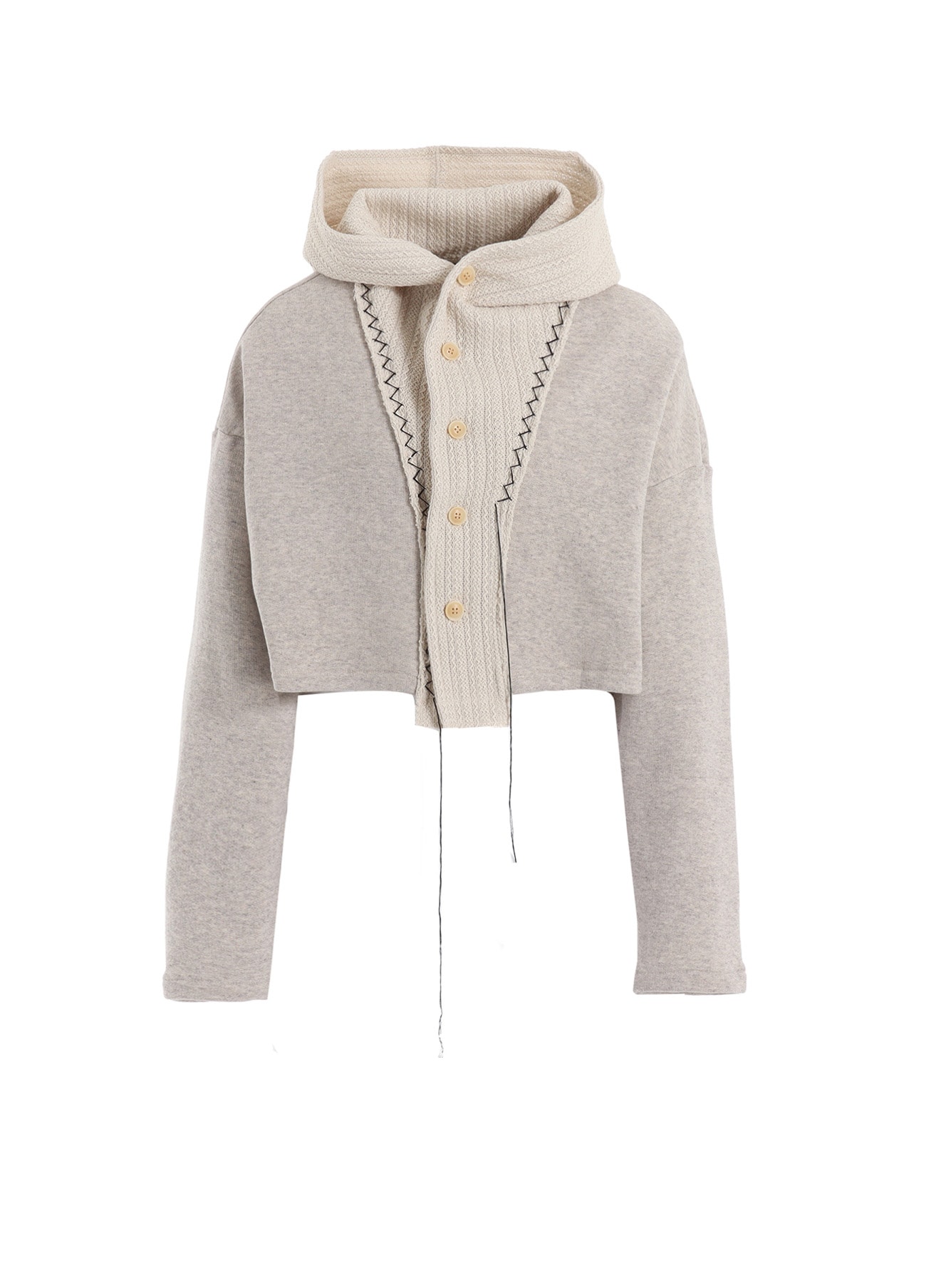 ふくらみのある柔らかな裏毛生地に、ラッセルレース生地を組みわせたフードつきカーディガン。ジグザグのステッチは職人の手作業でひとつひとつ縫われています。丈が短いため、レイヤードのスタイリングがおすすめです。