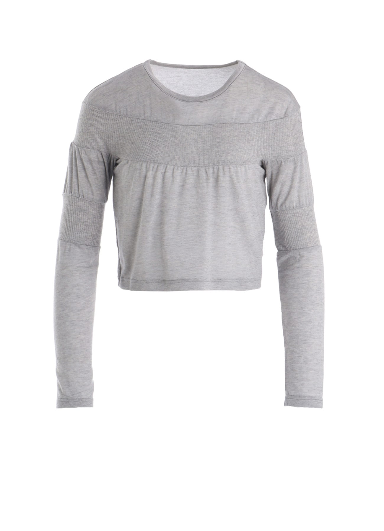 ショート丈の長袖カットソー。透け感のあるガーゼ天竺とベアテレコをボーダー状に切り替えています。ストレッチ性があり、優しい肌触りがポイント。短い丈のため、ハイウエストのパンツや吊りドレスと相性の良いアイテム。