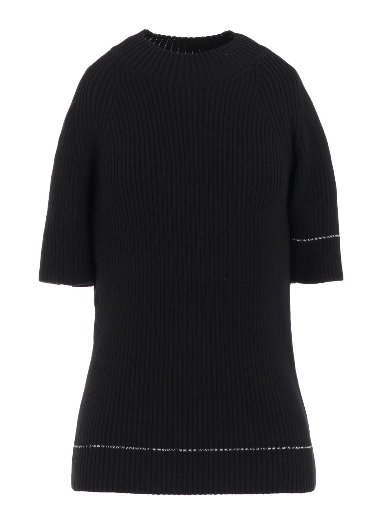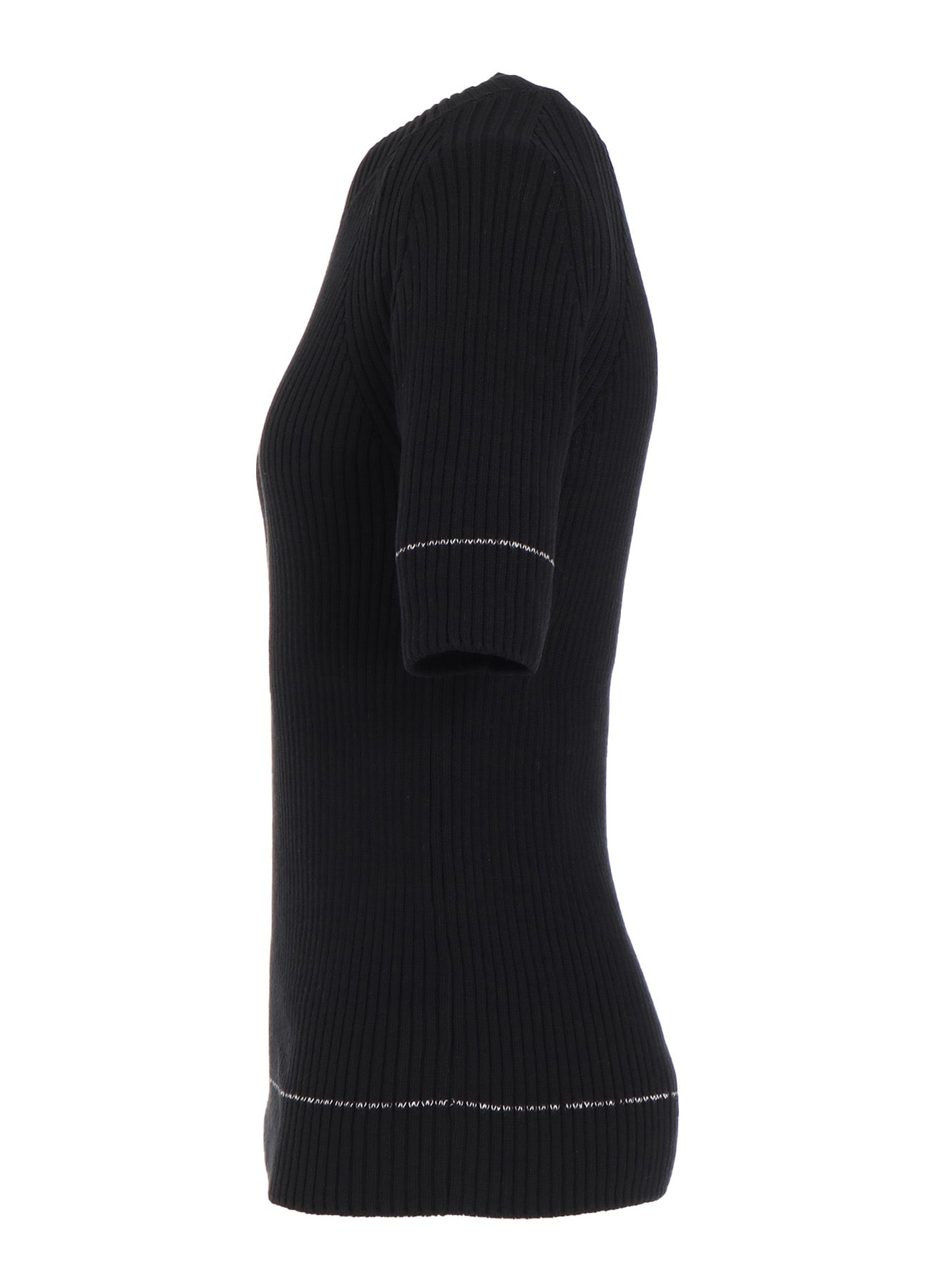 ¥48400半袖リブニット。身体に沿ったすっきりとしたシルエット。片方の袖と裾にデザインされたラインがさりげないポイント。シンプルであらゆるボトムに合わせやすいアイテムです。