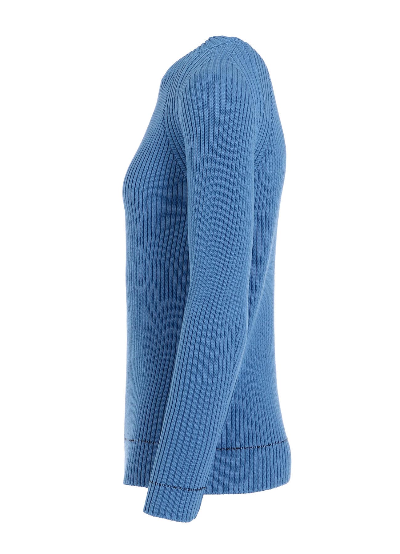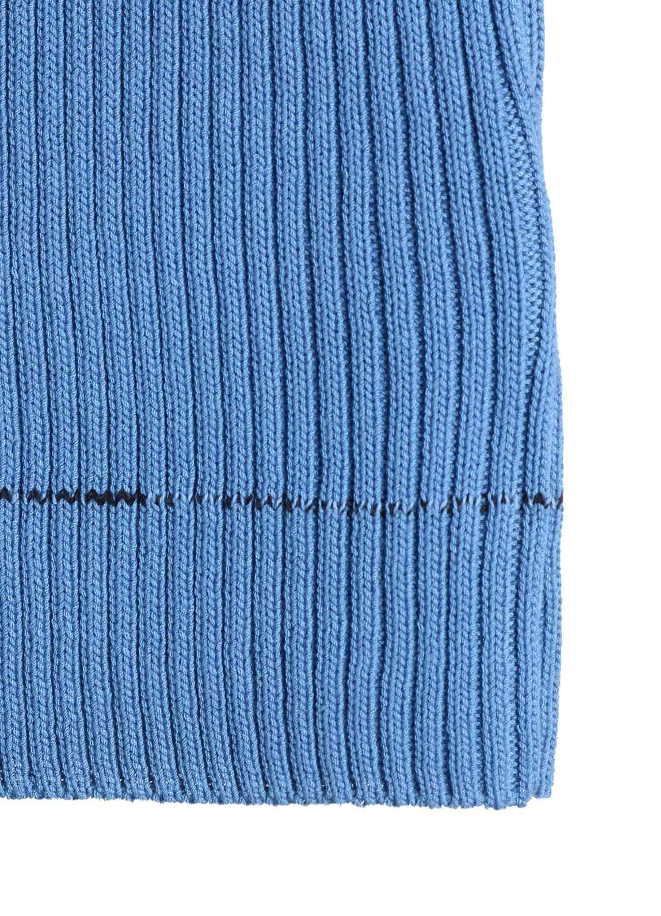 ¥50600長袖リブニット。身体に沿ったすっきりとしたシルエット。片方の袖と裾にデザインされたラインがさりげないポイント。シンプルであらゆるボトムに合わせやすいアイテムです。