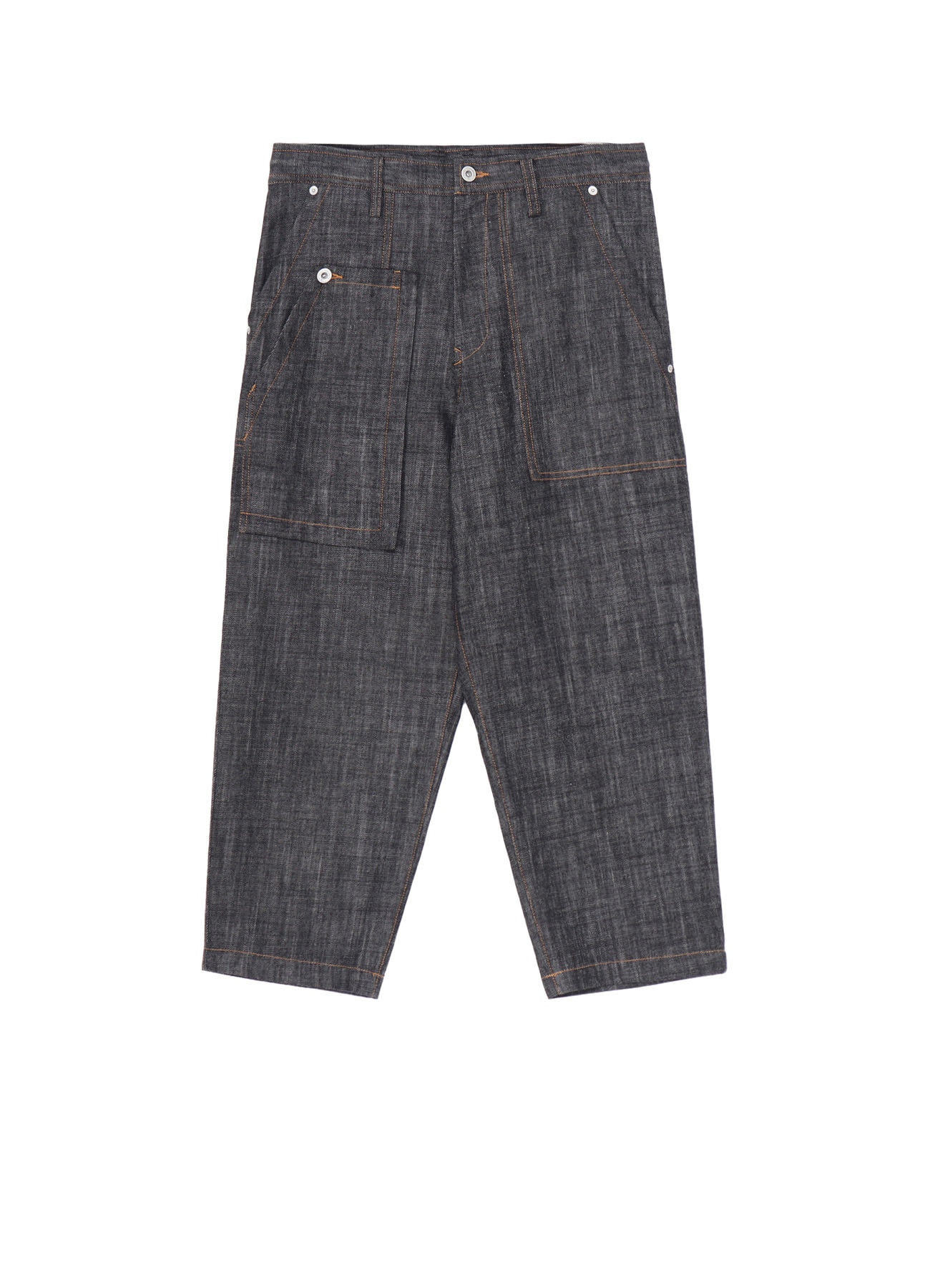 ワイドデニムパンツ。ビニールパッチやリベットに Y's YOHJI YAMAMOTO のロゴをデザインするなど、ディテールまでこだわったデニムシリーズ。太い糸のところどころが細くなった逆スラブ糸を使用することで、ソフトで程よいふくらみのある風合いに仕上げています。最後に製品の状態で洗いをかけており、ナチュラルな手触りです。ロールアップした着こなしもおすすめ。デニム製品のため色落ちする可能性がございますので、お取り扱いにはご注意ください。