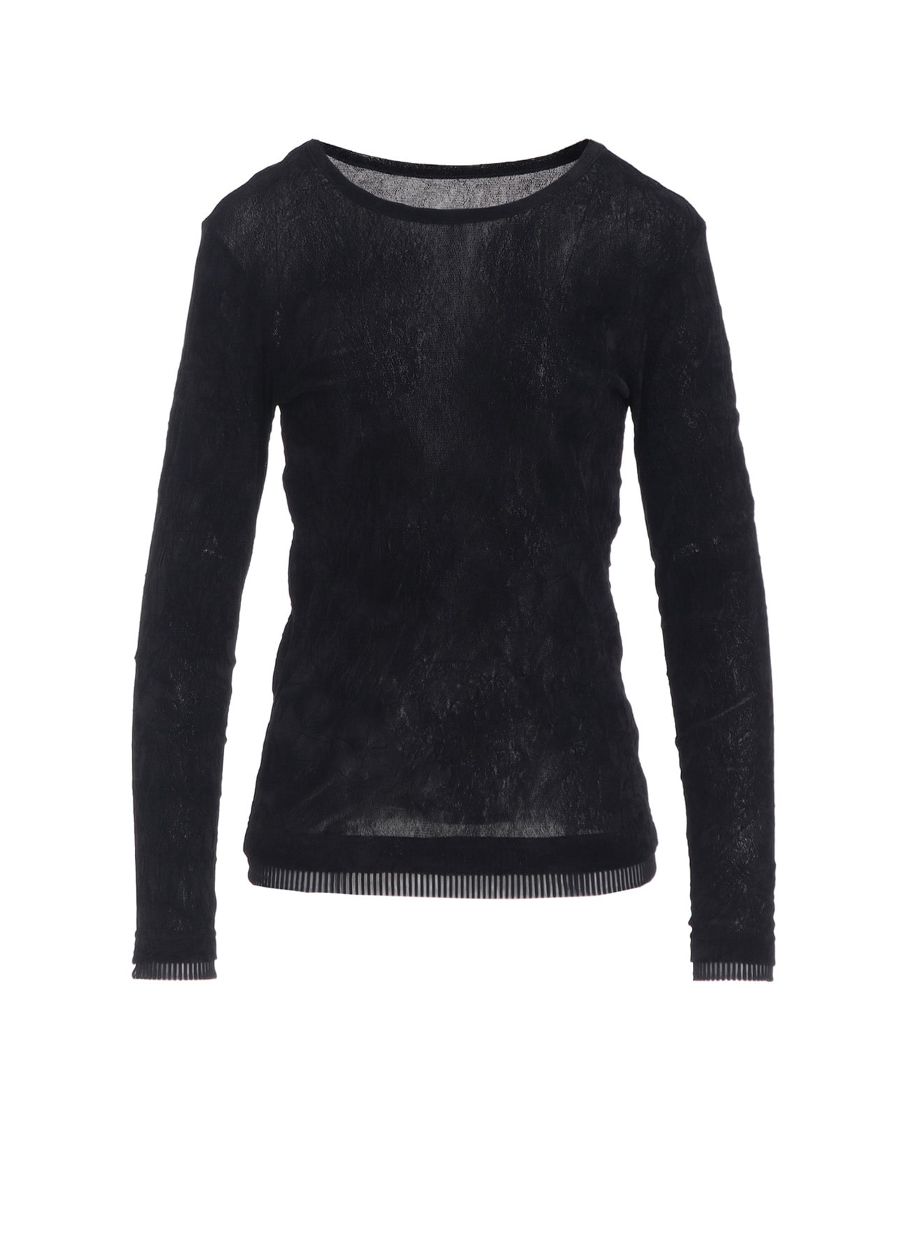 フロッキー素材のカットソー。シンプルなデザインは柄のアイテムとのコーディネートにもおすすめ。あたたかみのある秋冬らしい素材感がポイントです。