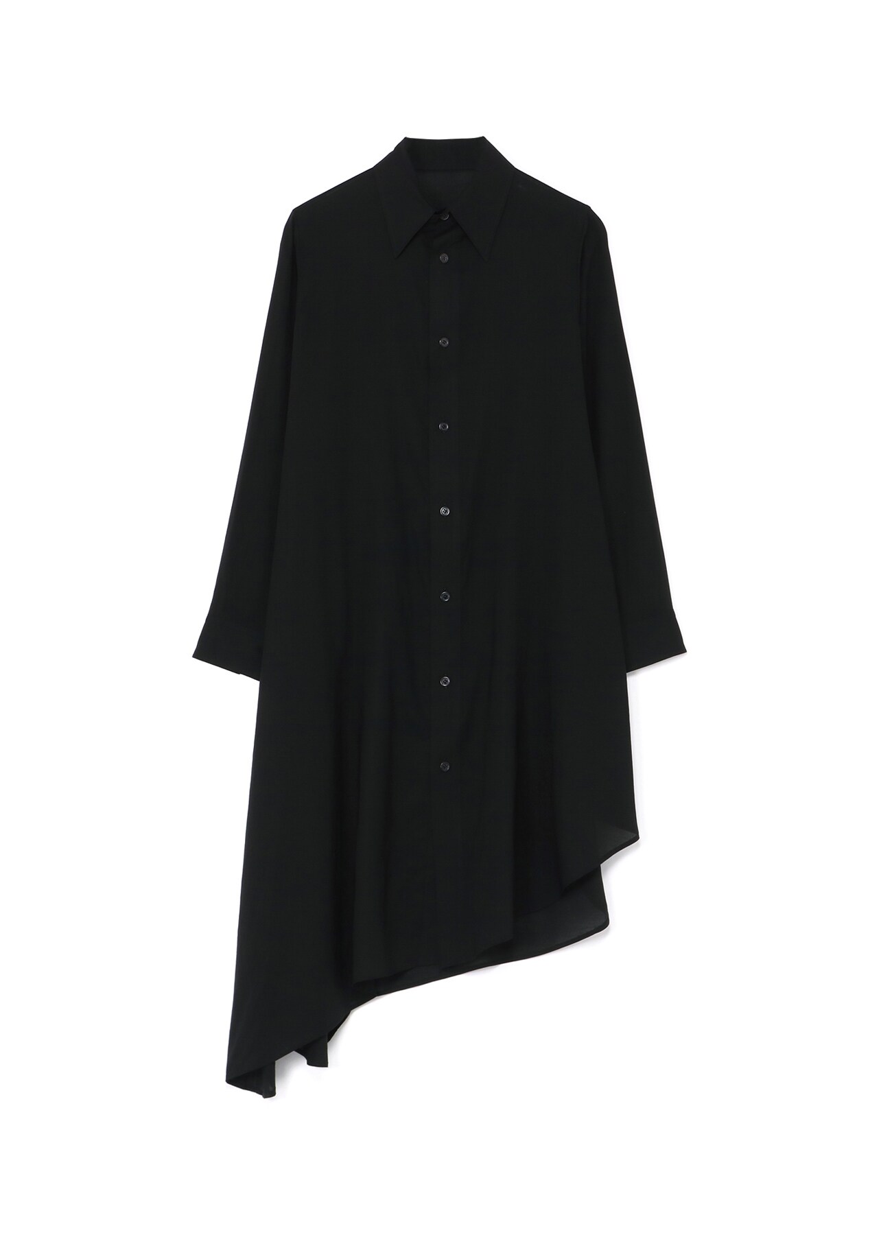 セルロースのシャツドレスはソフトでドレープがきれいに出ます。黒でありながら春夏らしい透け感も特徴です。細身のパンツやレギンスでドレス感を強調しても良いですが、今回は分量感のあるサルエルパンツをセットしてみました。レーヨンの落ち感がボリュームを軽減させます。サイドのバンツ部分に足を通さずフラしておく履き方のバリエーションあり。