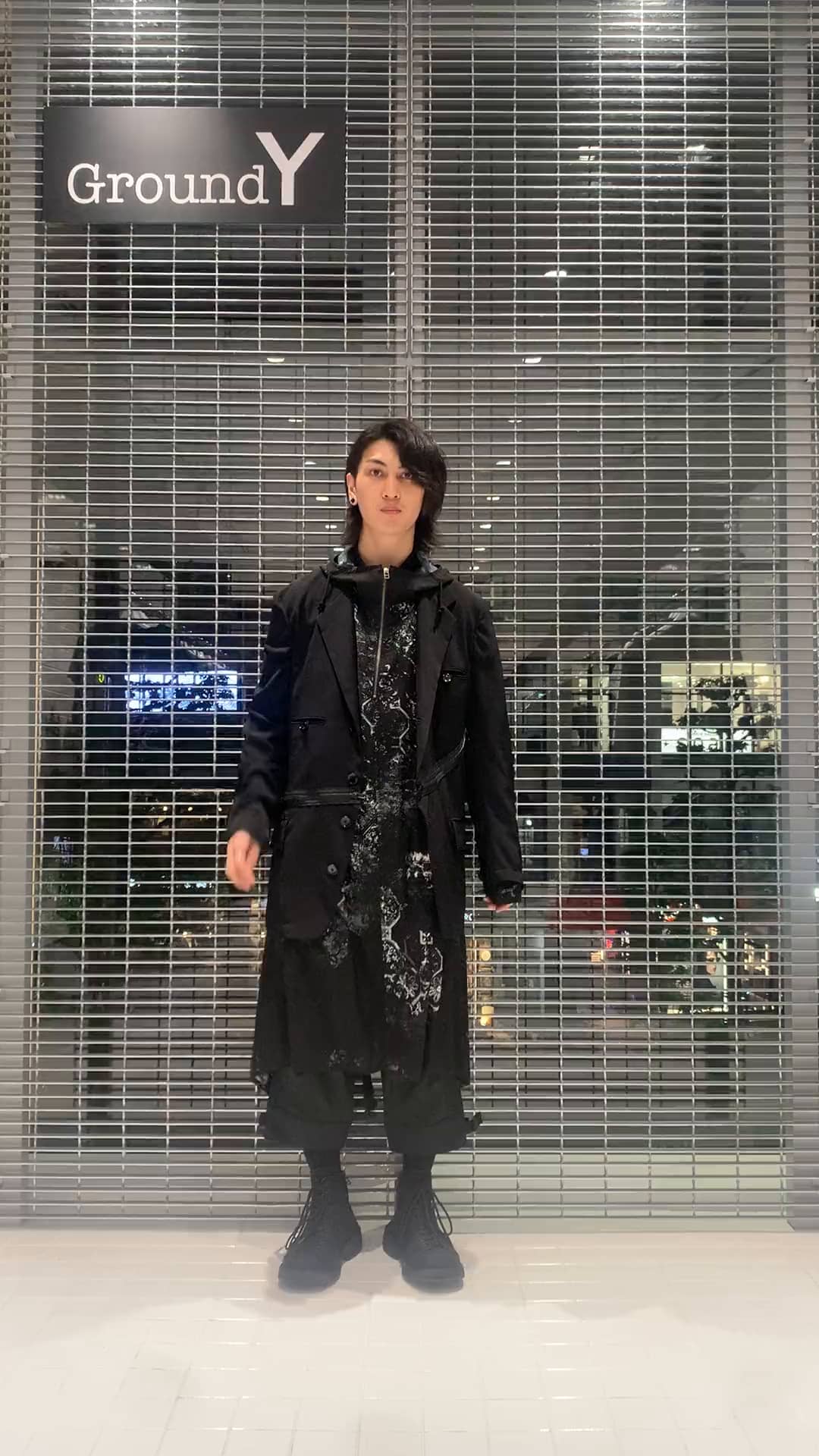 インナーにはタイル柄のドレス、片襟が二重になっているブラウス、ボトムスにはジャージ生地の裾にベルトのついたパンツを使用。